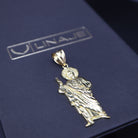 Standing tall at 1.75 inches (excluding bail), this pendant captures the revered San Judas in radiant 10K gold, showcasing a combination of strength and spirituality. With intricate detailing, it becomes a testament to your unwavering devotion and an elegant accessory for those seeking a blend of faith and style.