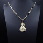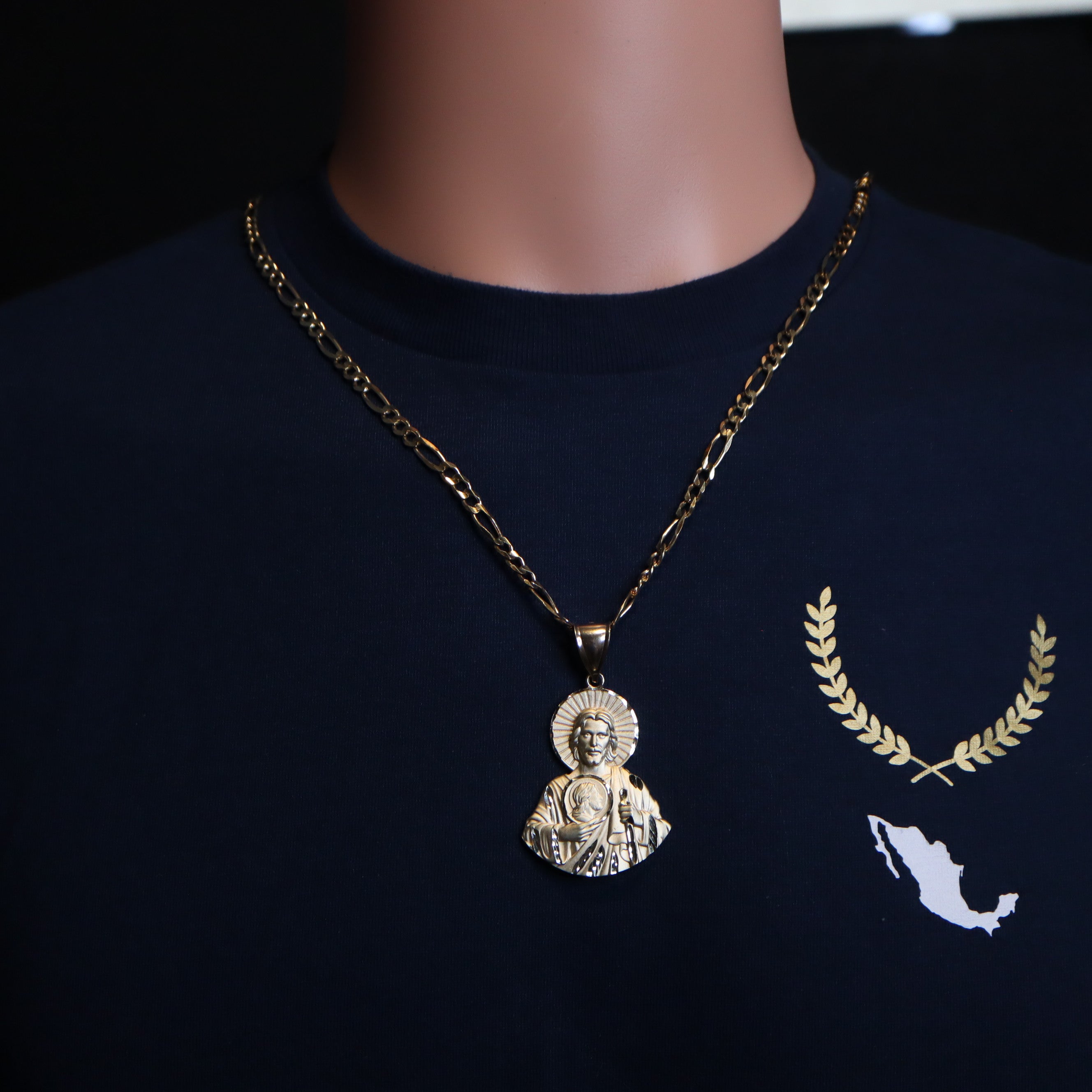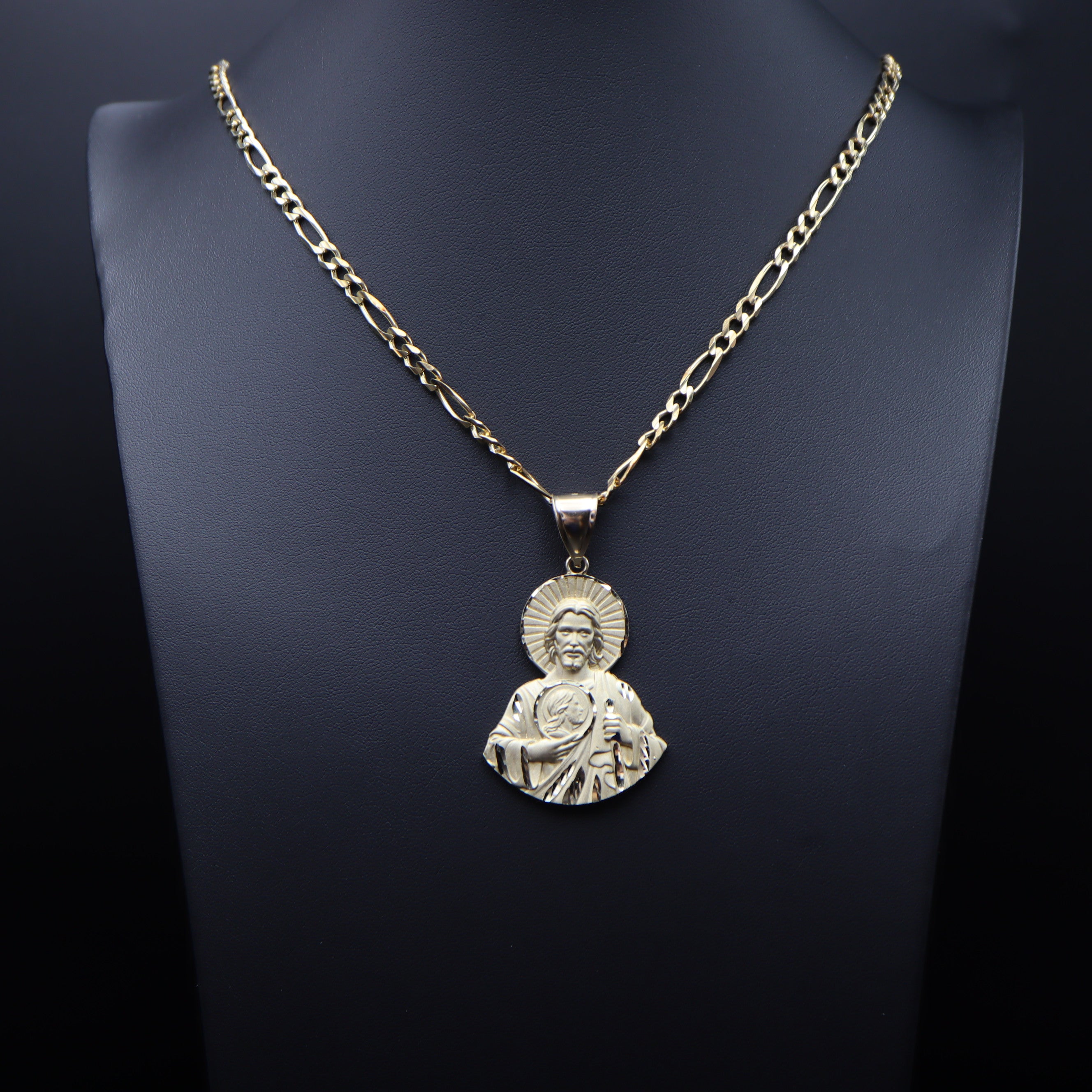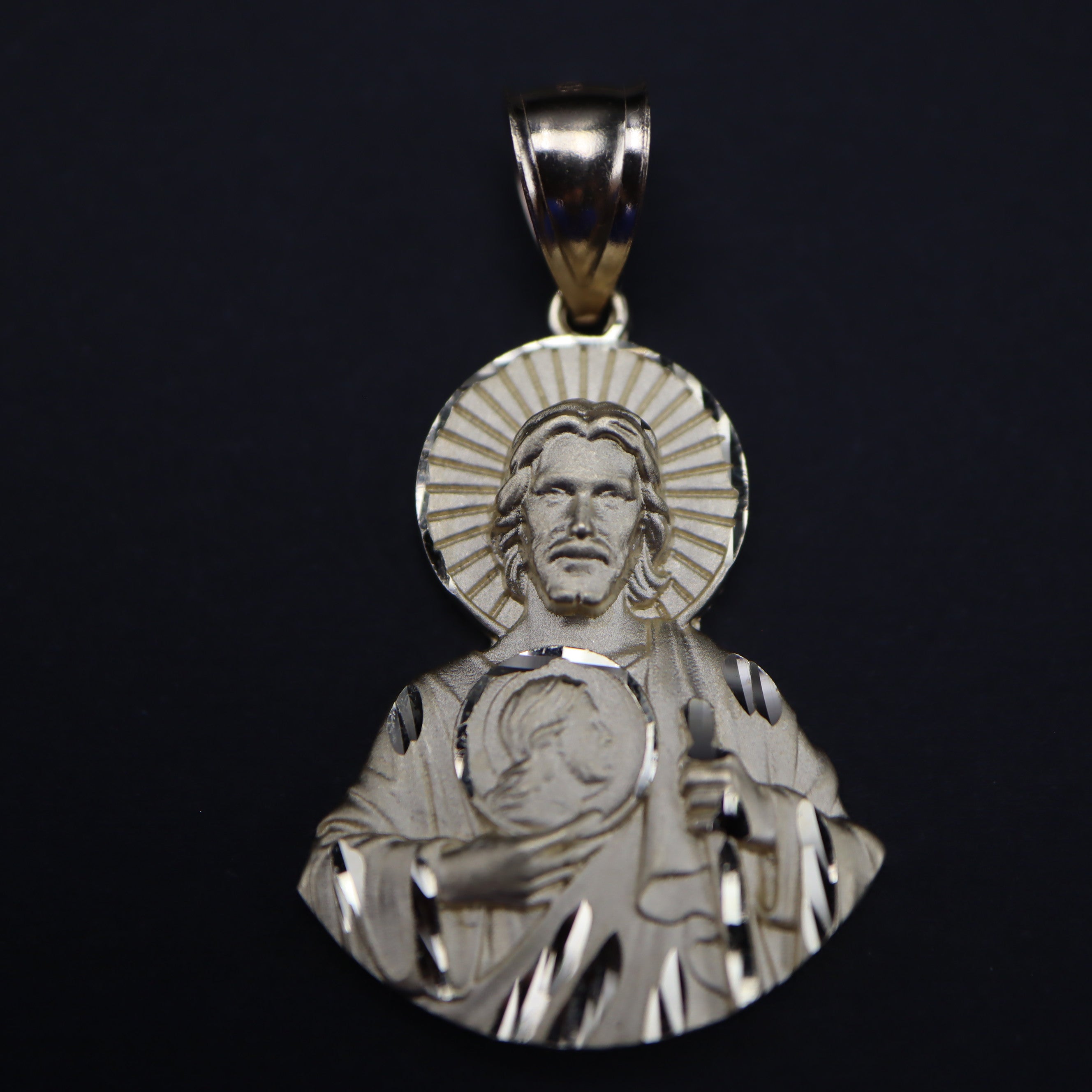 Elevate your faith with our exquisite San Judas Half Body Pendant, meticulously crafted from lustrous 14K gold. This unique piece beautifully captures the essence of devotion and spiritual strength. Approx.. height 1.65 inches (San Judas) & 2.2 inches including bail.