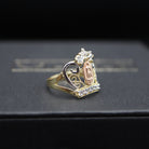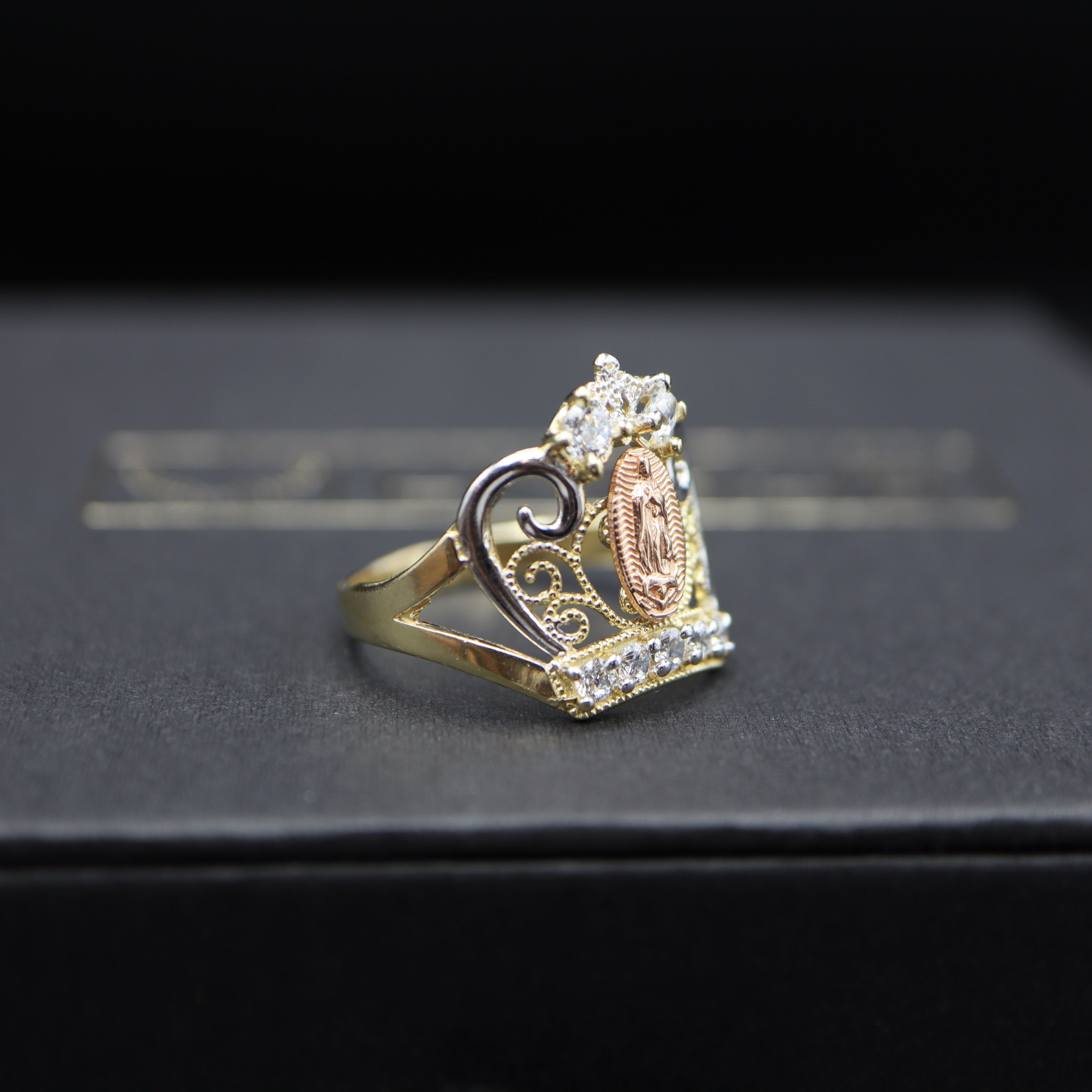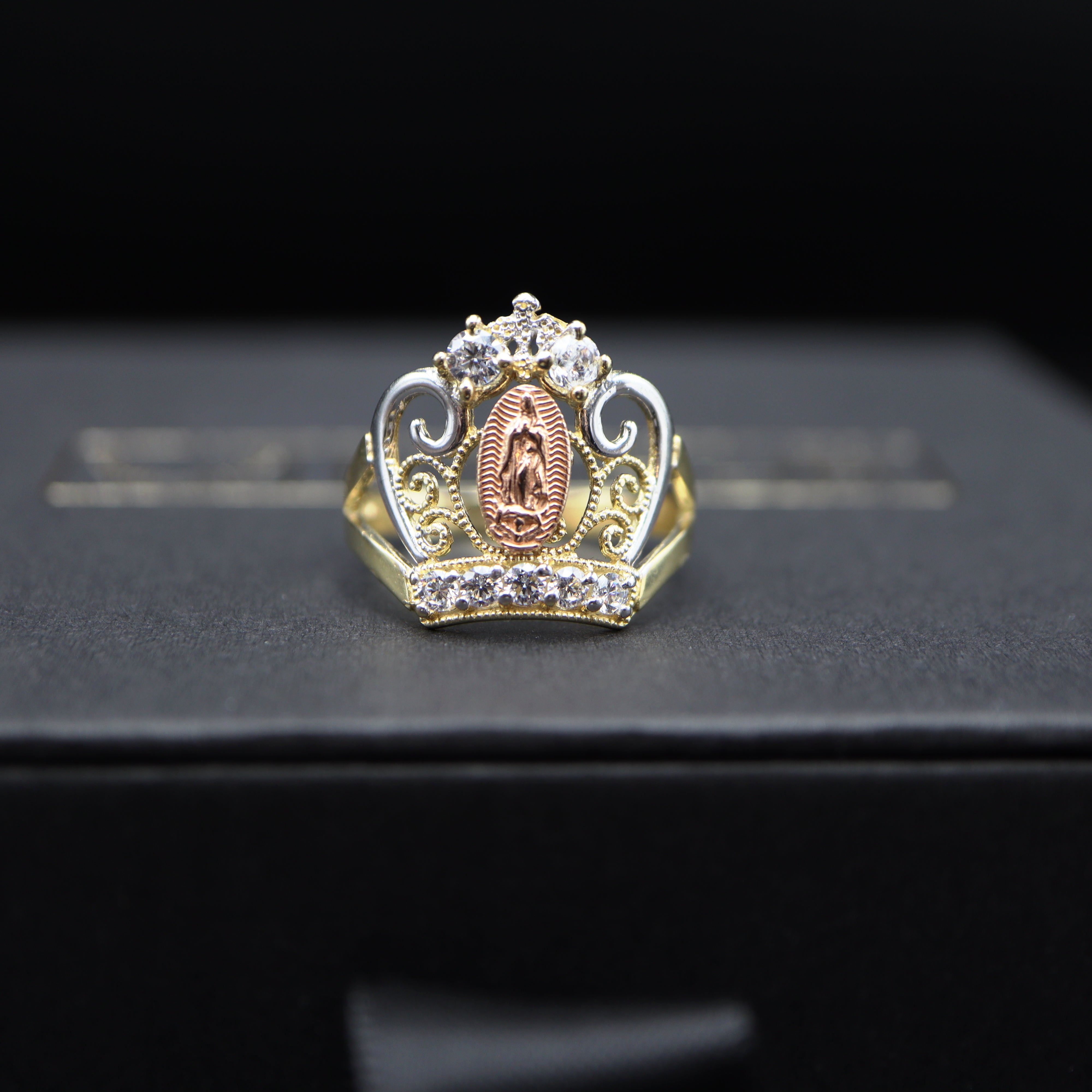 Crafted with meticulous attention to detail, this exquisite ring features the revered Virgen de Guadalupe adorned with a majestic crown, symbolizing her heavenly stature.