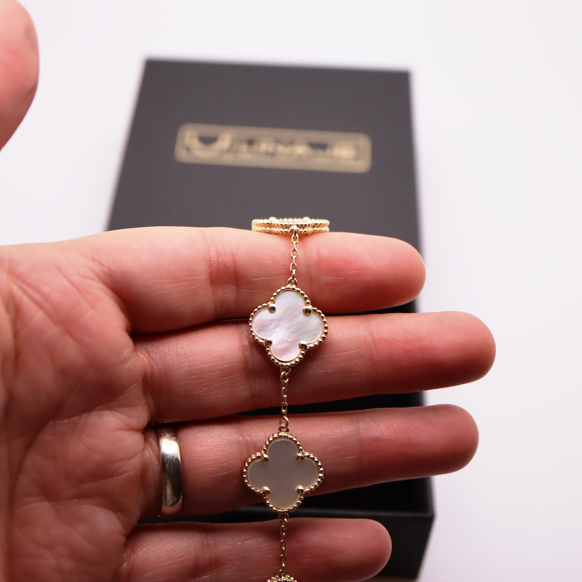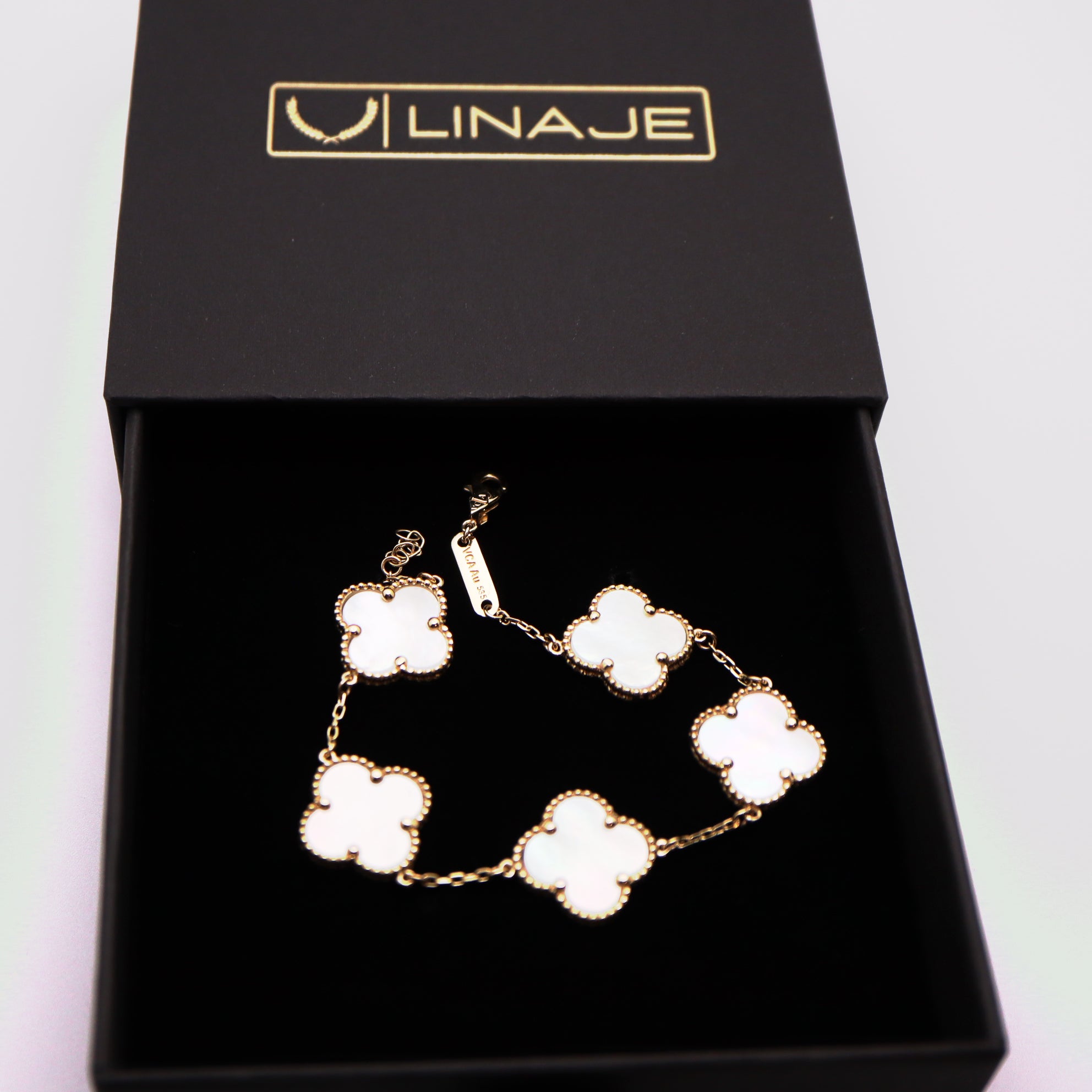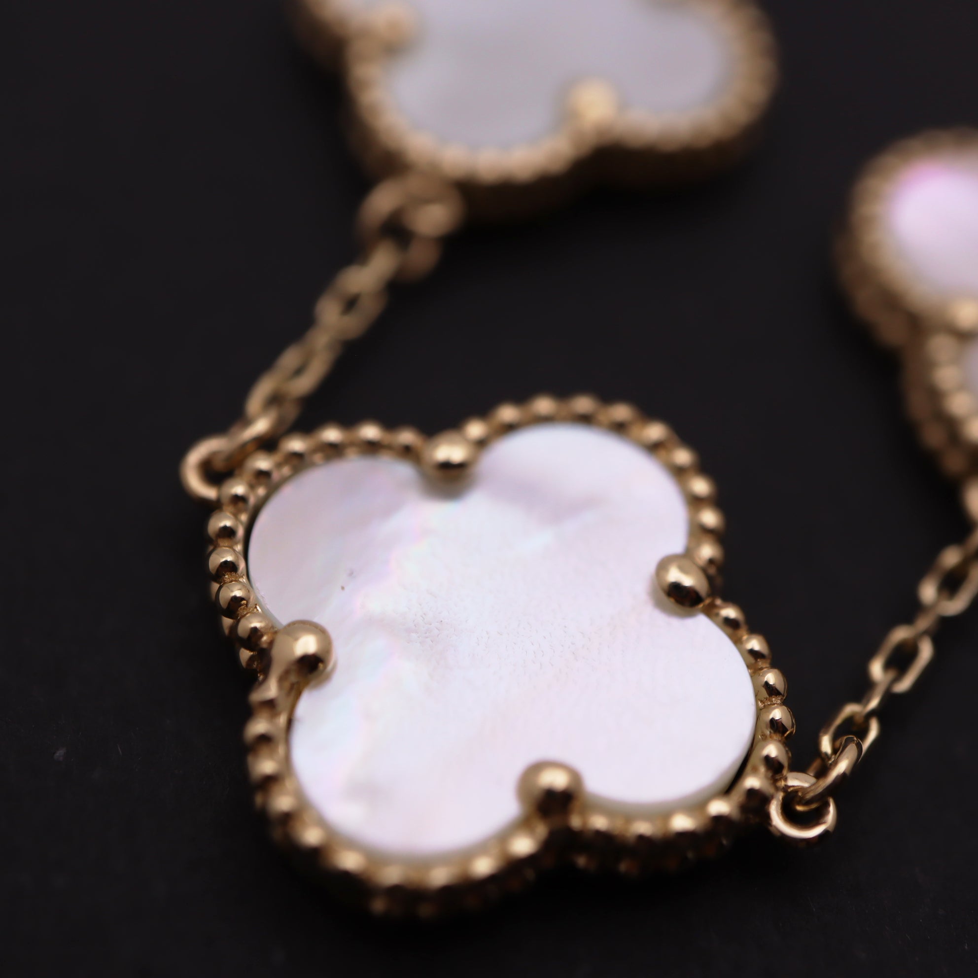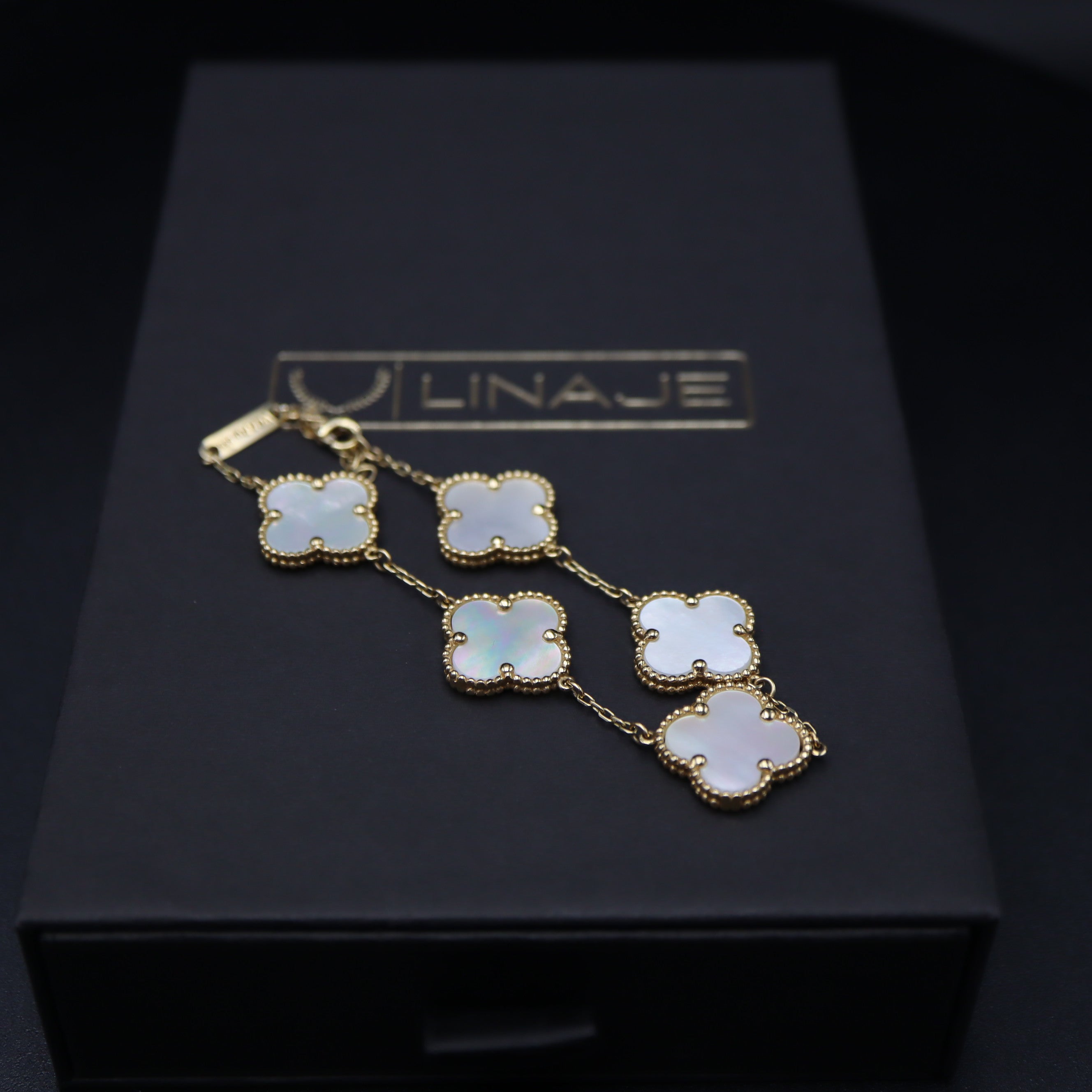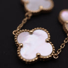 Crafted with the finest quality materials, this bracelet features the signature clover motifs in 14k gold, each one adorned with brilliant white stones. The clovers are expertly crafted to create a seamless and elegant look that will make you feel like royalty.