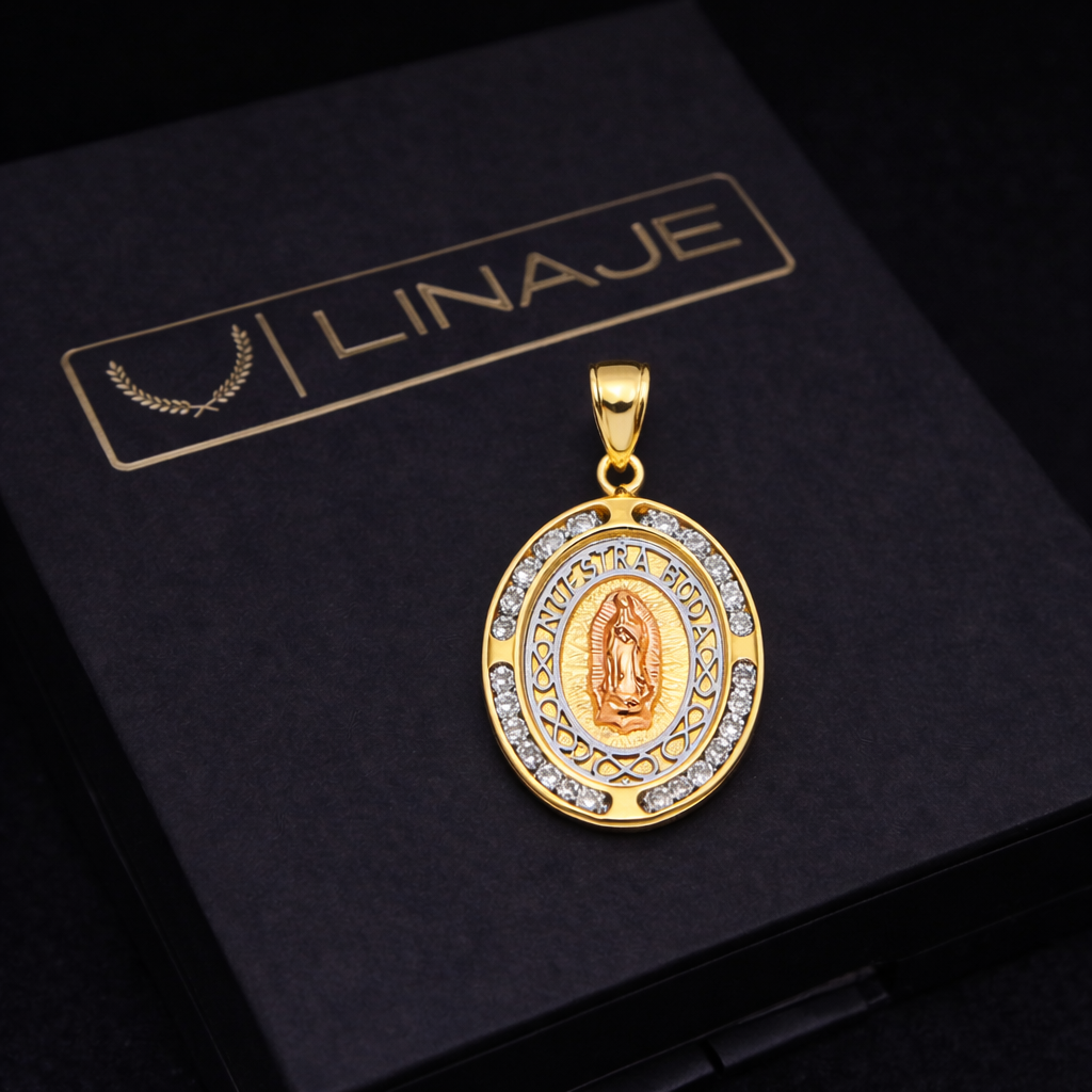 Crafted in real 14K gold, this pendant features a Virgin Mary medallion design with CZ accents.