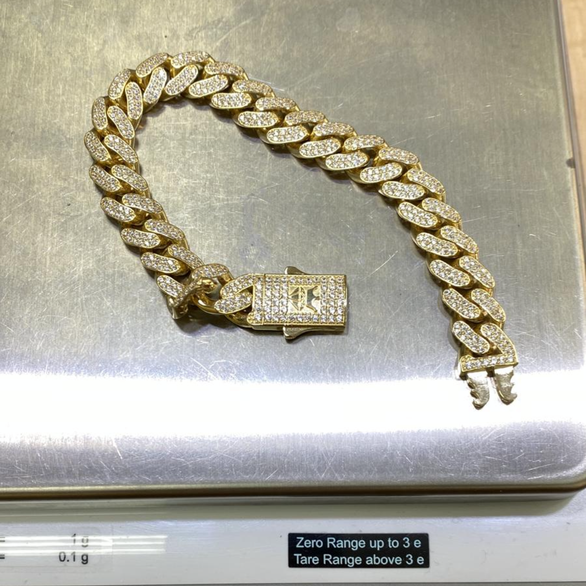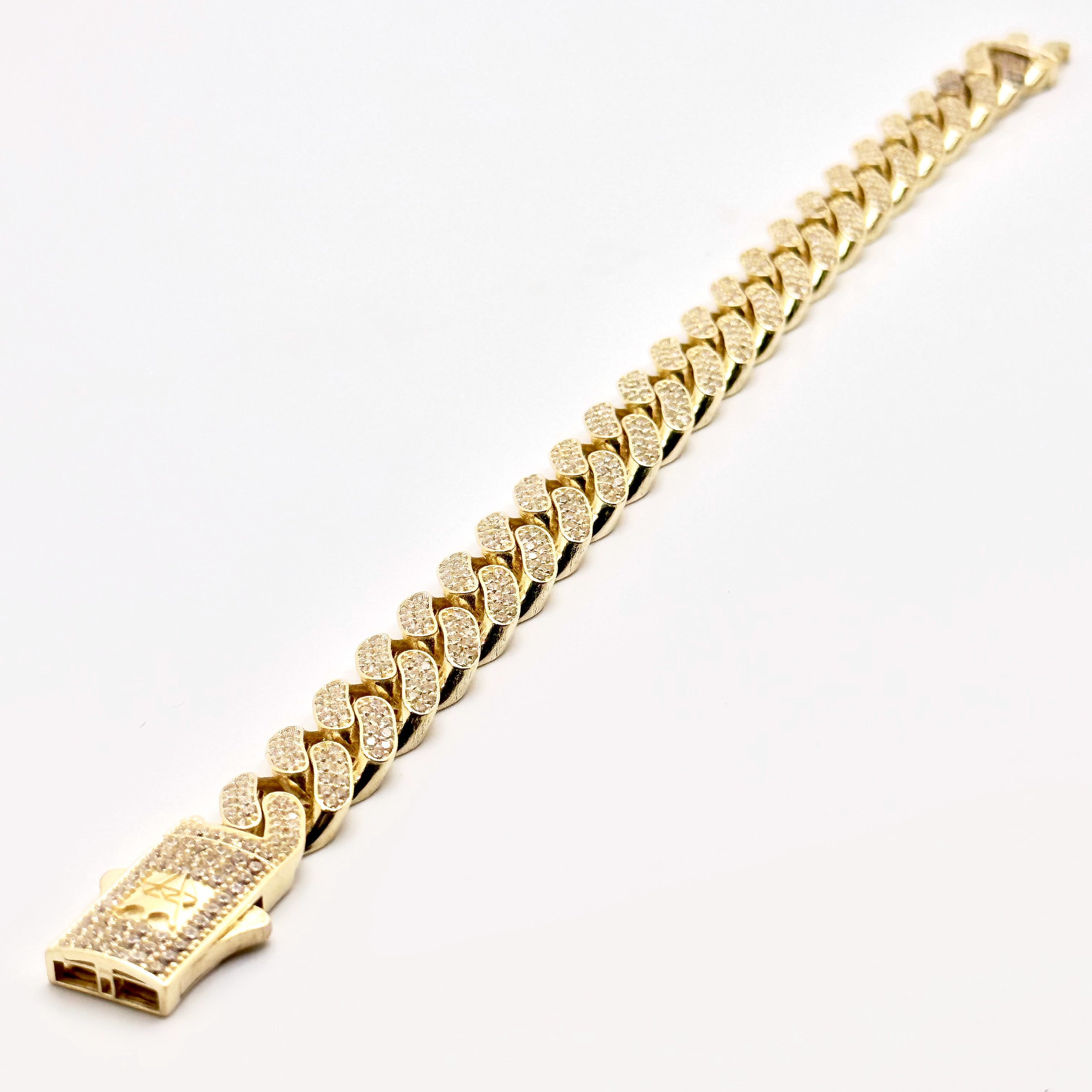 Cuban link style bracelet made from 14k REAL gold and encrusted with high quality cubic zirconias. Featuring a sturdy lock and lightweight structure. This item is 11mm wide and comes in 3 sizes in length please see below.