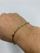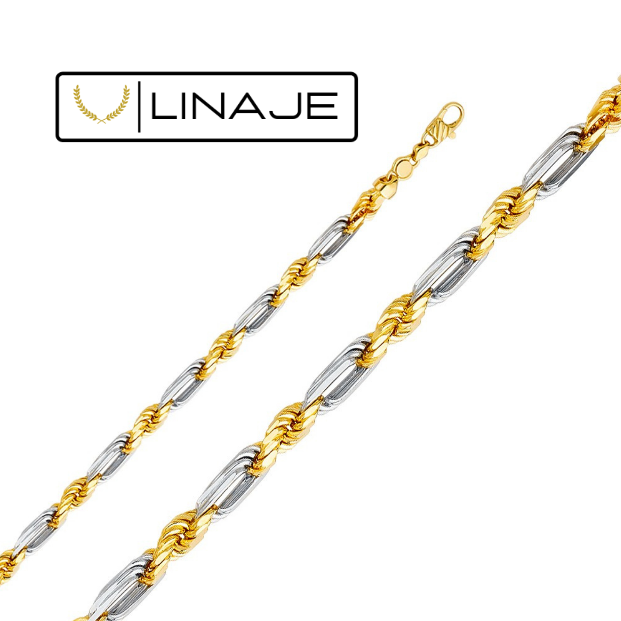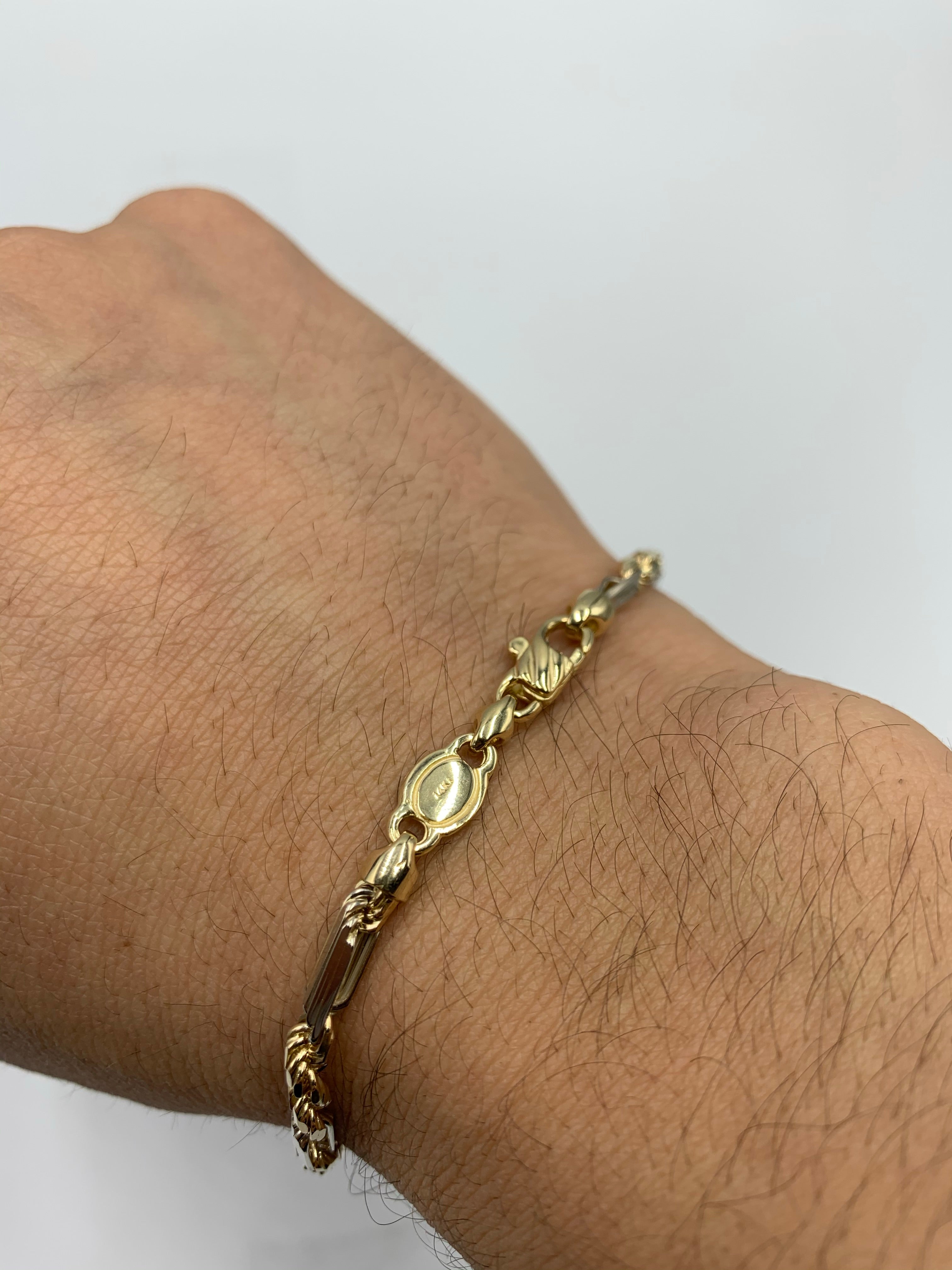 Incredible handmade design that combines the figaro and rope designs. This piece features a two-tone design in white and yellow 14K REAL gold NOT gold plated. It also has a very secure lobster clasp with a smooth mechanism. This piece weighs 9.12 grams of solid gold and is 3.5mm thick. Hand made in Italy by the best jewelry designers this is a piece you will enjoy for a lifetime. This Bracelet will catch a lot of attention and is a must for your gold collection.