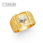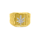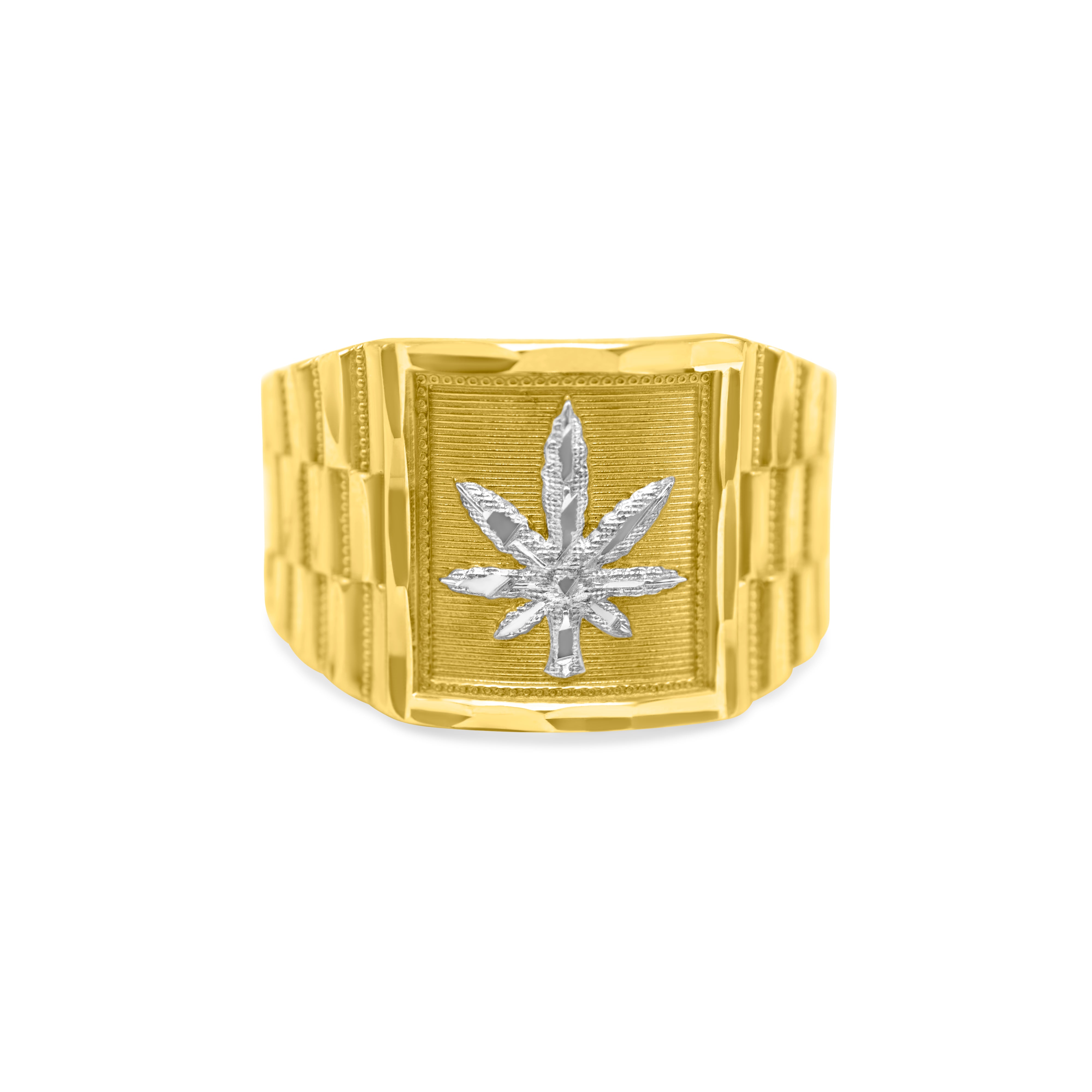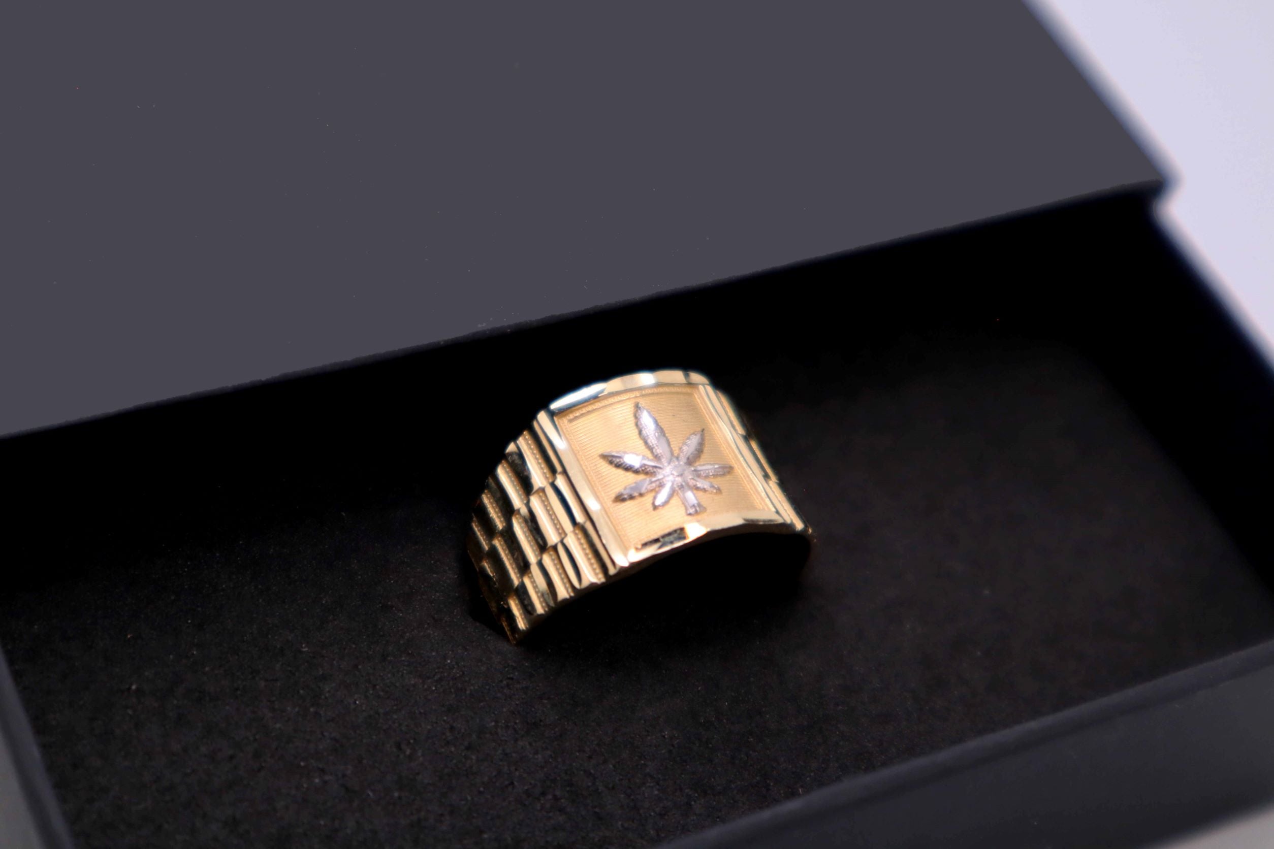 14k gold and stamped ring featuring a cannabis leaf. This ring showcases a yellow gold band with a white gold leaf. This item on avg weighs about 4 grams of 14k real gold not plated.