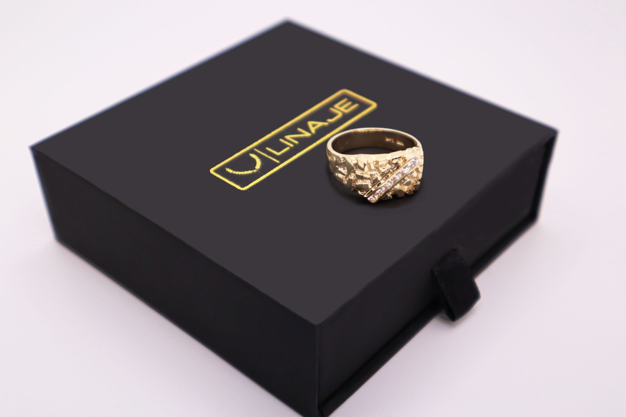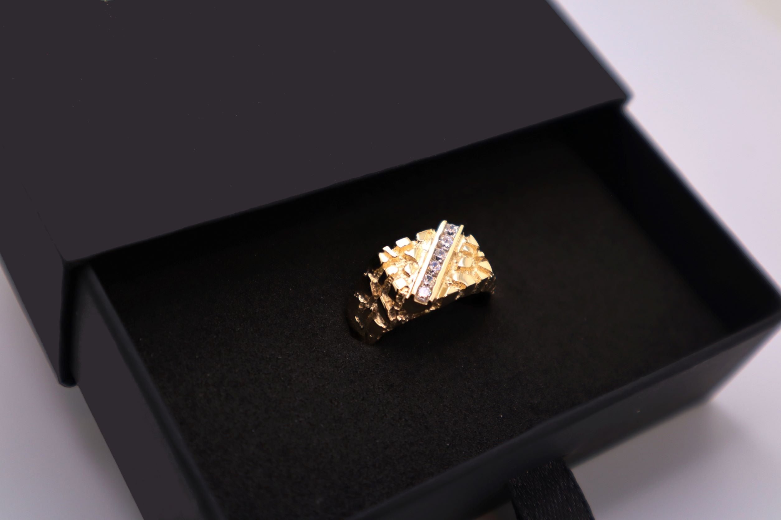 Stamped 14K and made of REAL Solid 14K Gold NOT gold plated. This Iced out golden nugget ring's design will attract a lot of looks, definitely a stand out piece. Made of solid gold and featuring a diagonal row of CZ stones this is a must for your gold collection. Please allow 1-4 business days for processing and resizing and 2-3 business days for shipping and delivery.