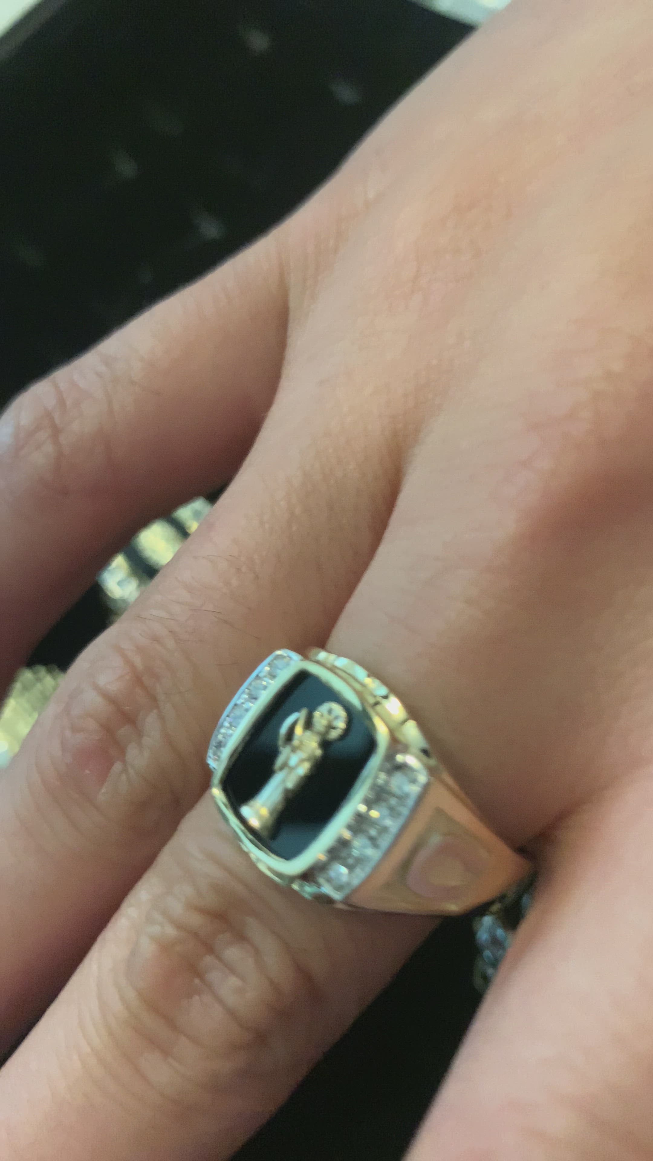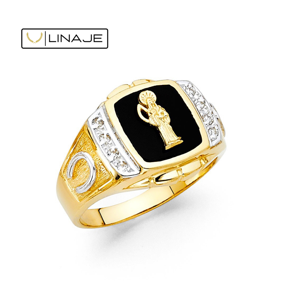 From our most popular collection of 14K Real gold rings, this piece showcases la Santa Muerte in an Onyx background. This piece acquires its shine from a row of 4 high quality Cubic Zirconia's on each side. Similarly to our other rings in this collection, this ring has a horse shoe on each side, a symbol of good luck. Avg. gold weight is 6.45 grams.