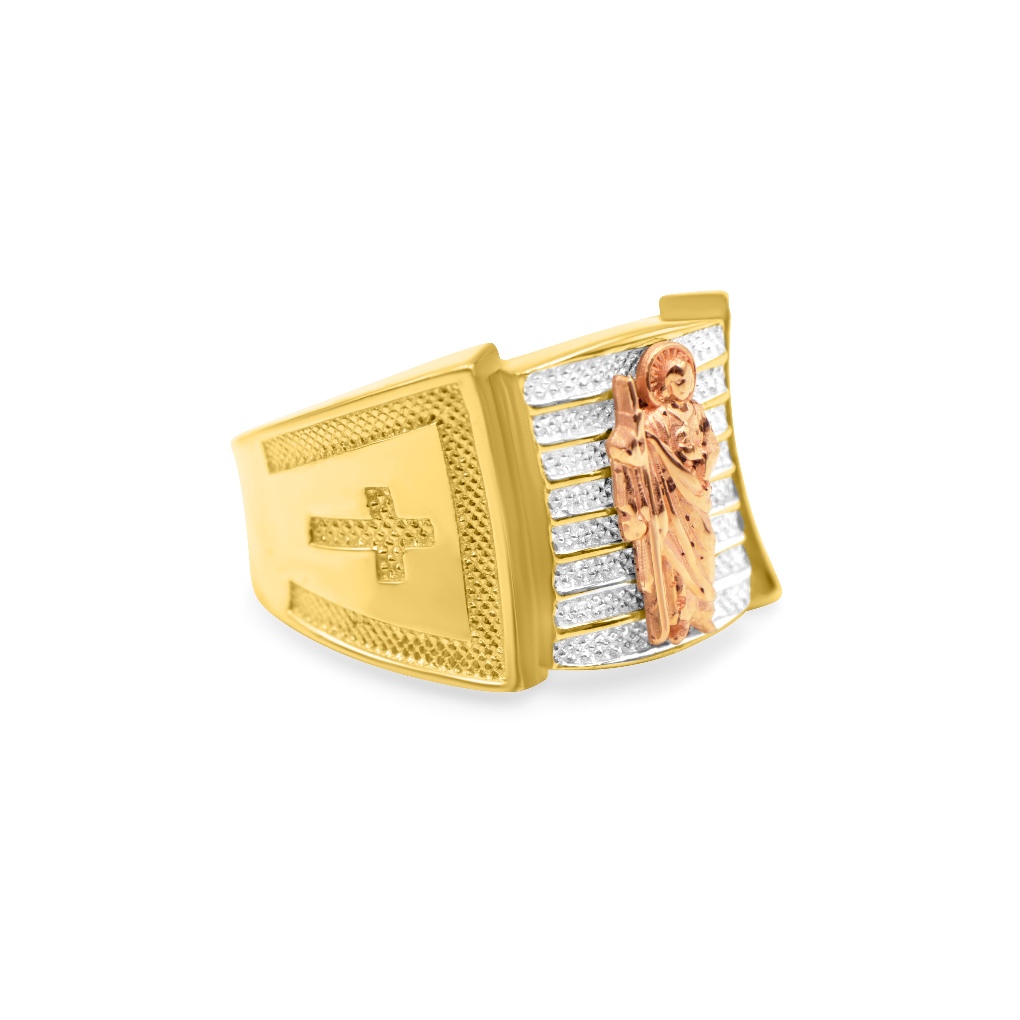 Introducing the exquisite San Judas gold ring, a symbol of faith and devotion crafted from high-quality 14K gold. This stunning piece of jewelry features one cross on each side, representing the holy trinity and the powerful protection of San Judas.