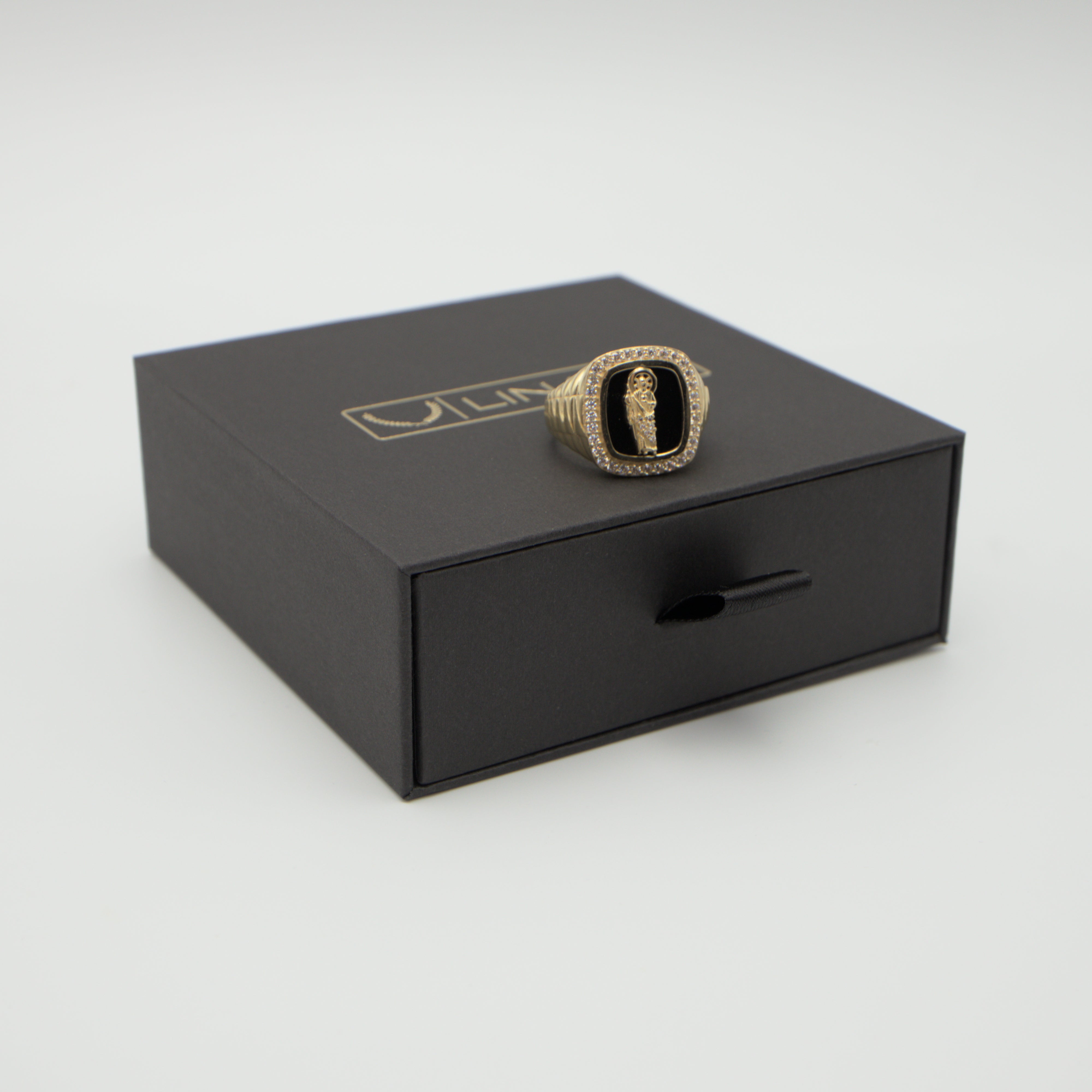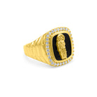 Stylish San Juditas ring made from 14K Real gold and showcasing a black/onyx background. This piece also includes an outer border made from Cubic Zirconias. Each side of this piece showcases a white gold strip down the middle.
