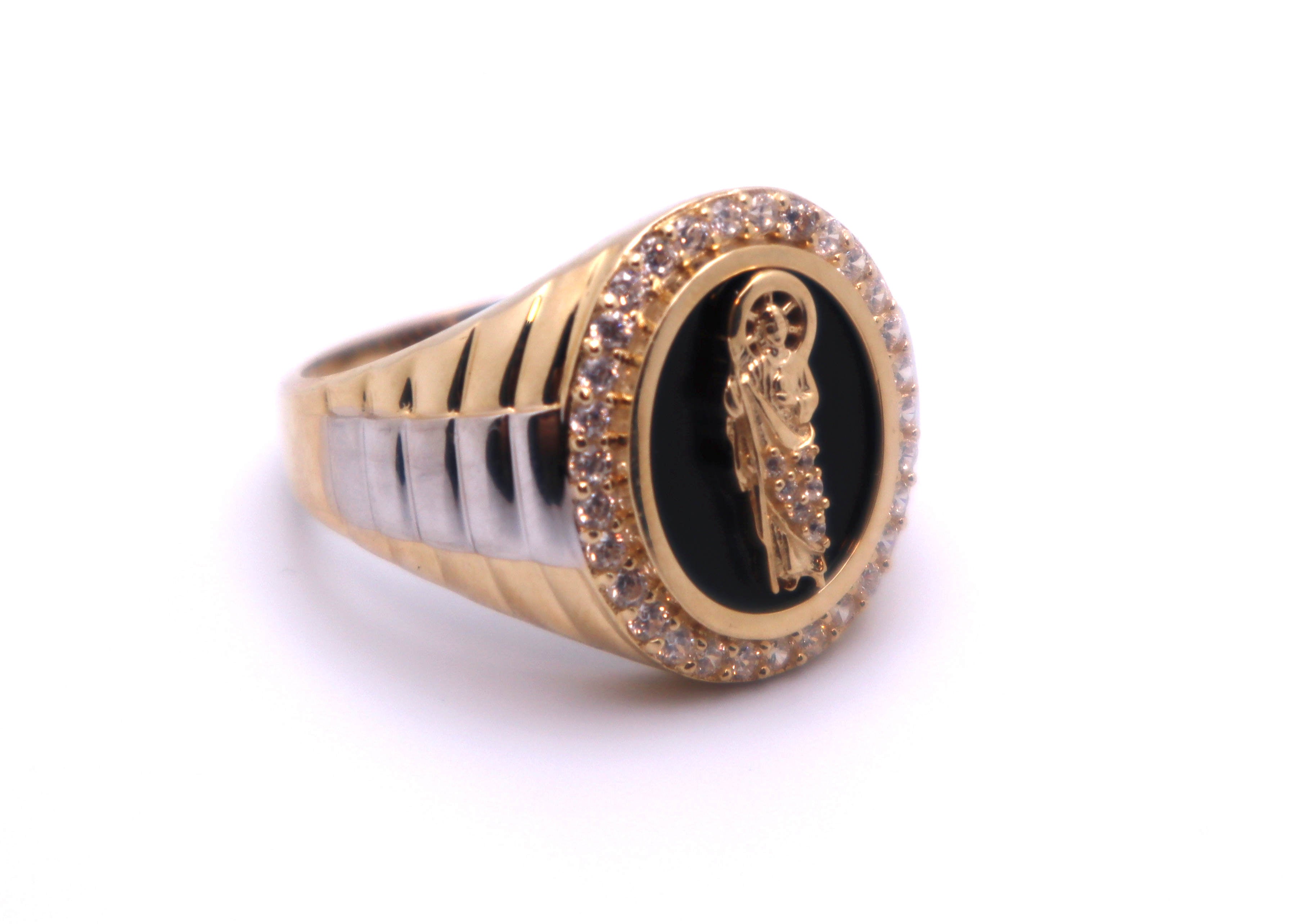 Our newest variation of the San Judas ring. 14K REAL Gold NOT gold plated. This piece showcases an oval shaped Onyx background with Cubic Zirconias around the edge. At the center of the piece you have San Judas Tadeo the patron saint of the lost causes. This item also showcases two tones in yellow and white gold.