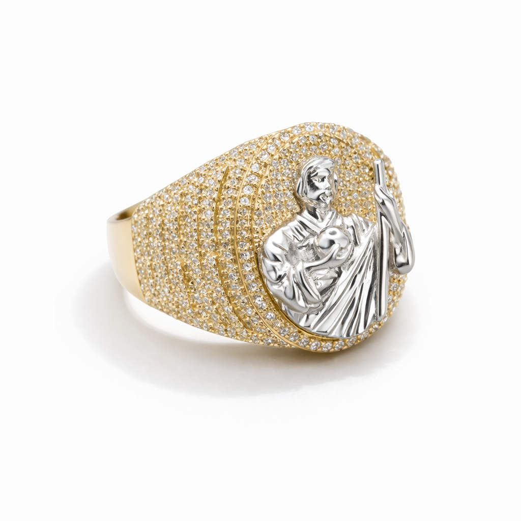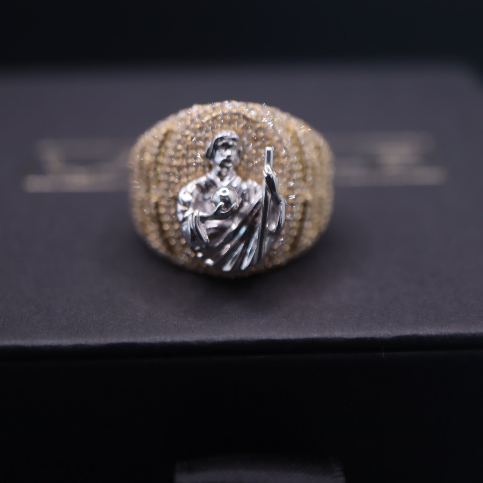 An elevated St. Jude piece featuring a stunning two-tone design with micro-pavé set natural diamonds totaling 1.15 CTW across the figure and shank.