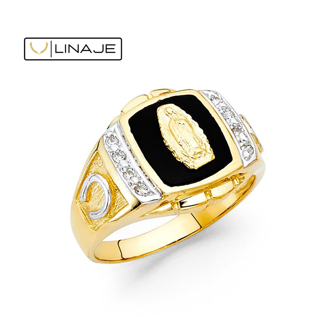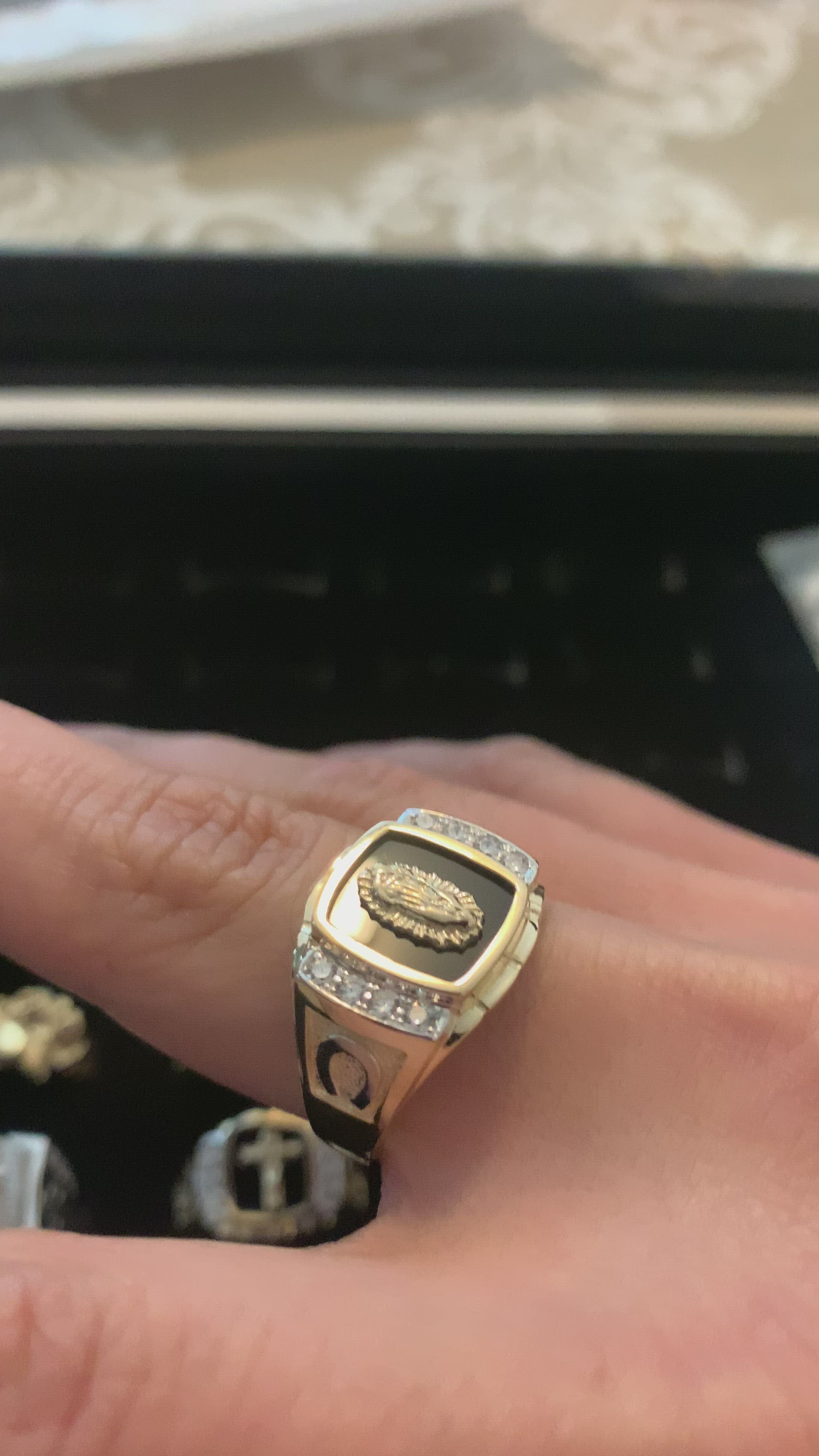 Made from 14K gold and stamped, this ring from our Onyx collection is a must have for gold fanatics. This piece show cases la Virgen de Guadalupe with an Onyx back and four Cubic Zirconia's on each side. This piece also showcases a horse shoe on each side, a symbol of good luck. This ring has an avg. weight of 6.75 grams of 14K yellow gold.