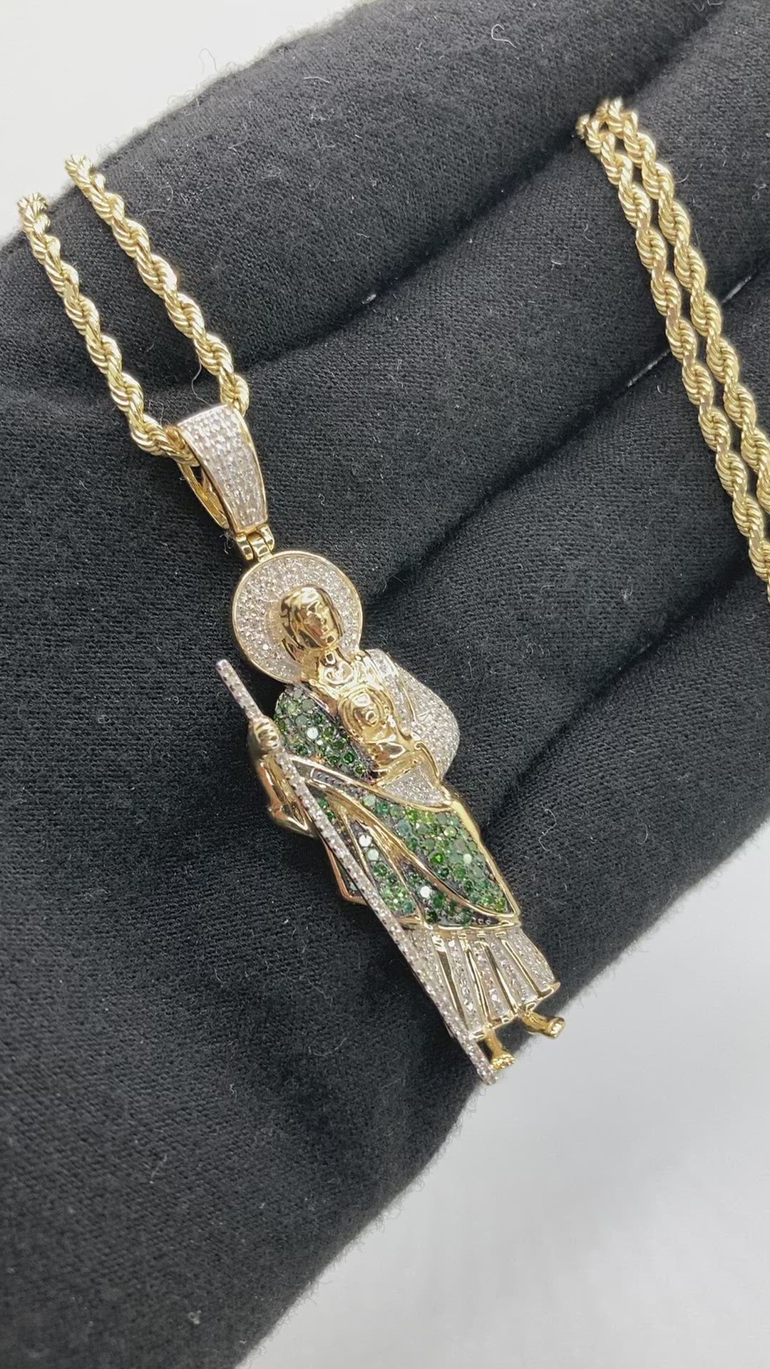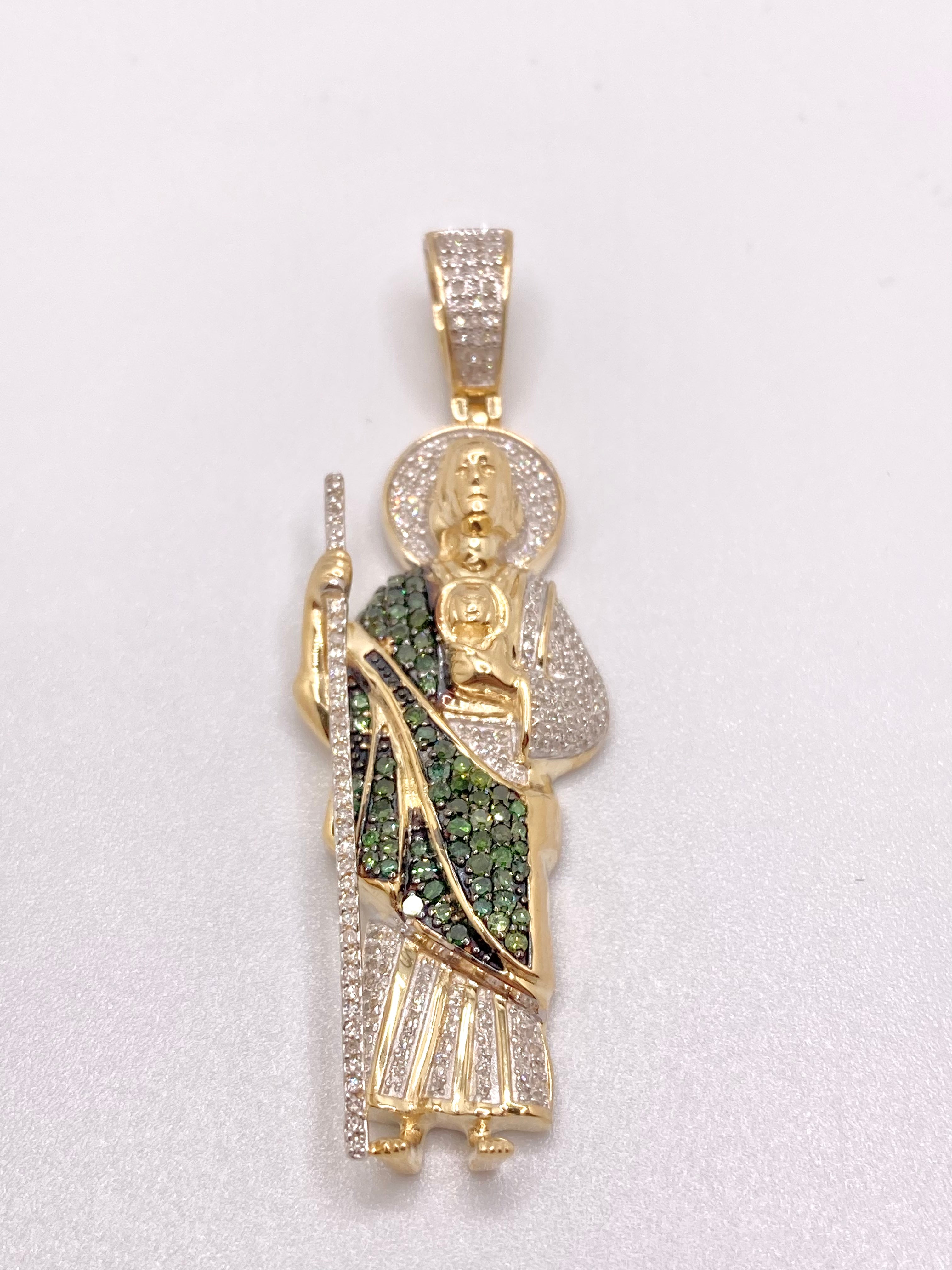 Hottest new diamond pendant with St. Jude (San Juditas). This piece showcases green and white natural diamonds. Fully iced out piece with a gallery on the back. This item is 2.1 inches tall and is made from REAL diamonds and 10K gold. Incredible price of $1,099.99.