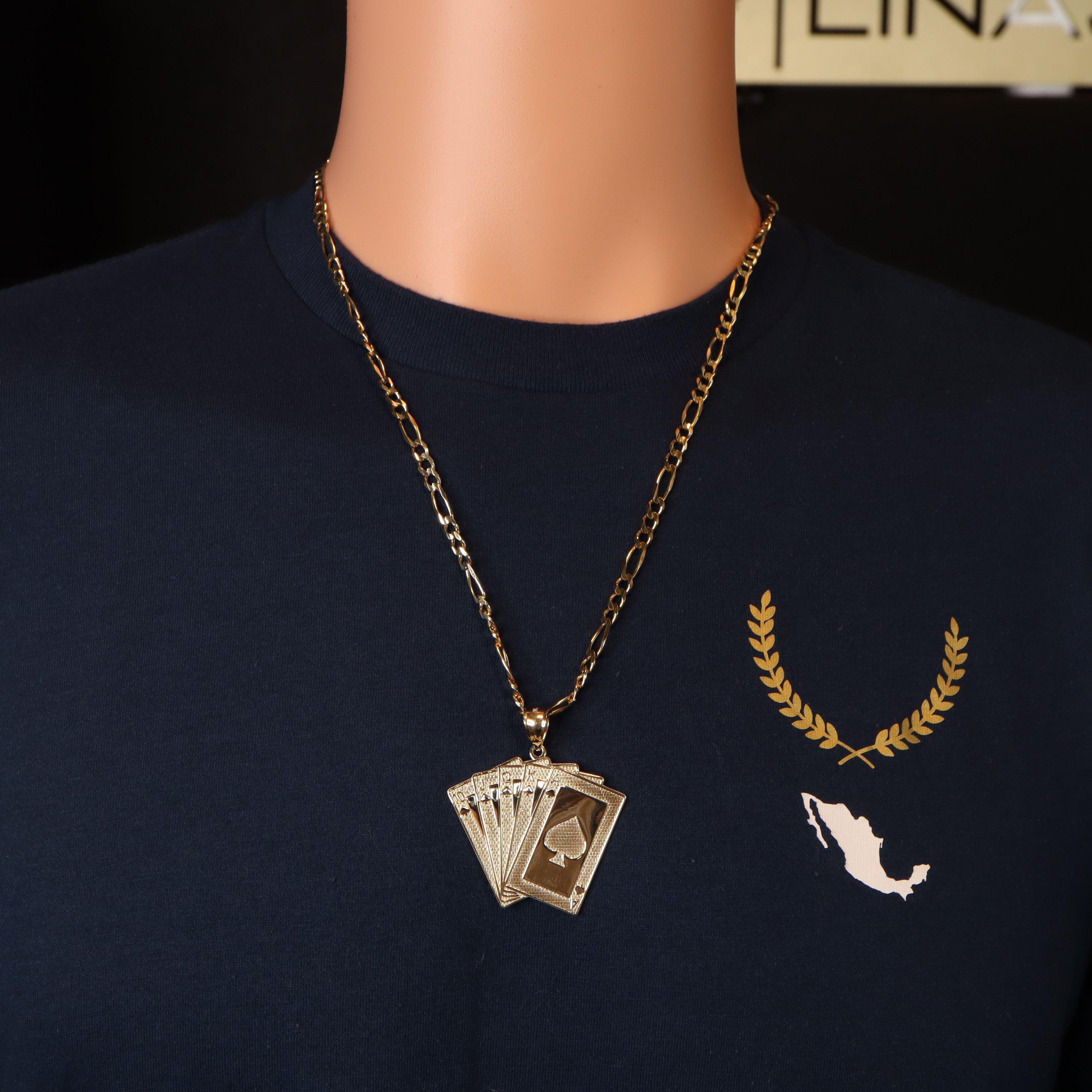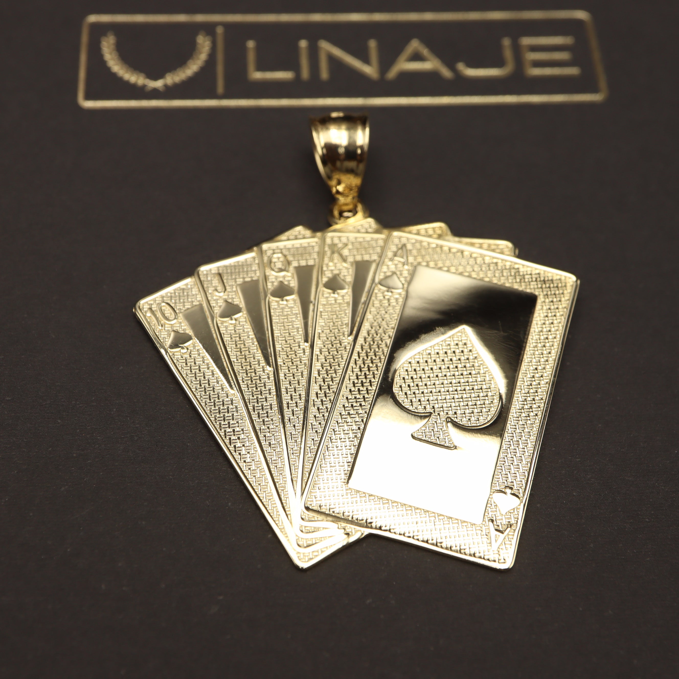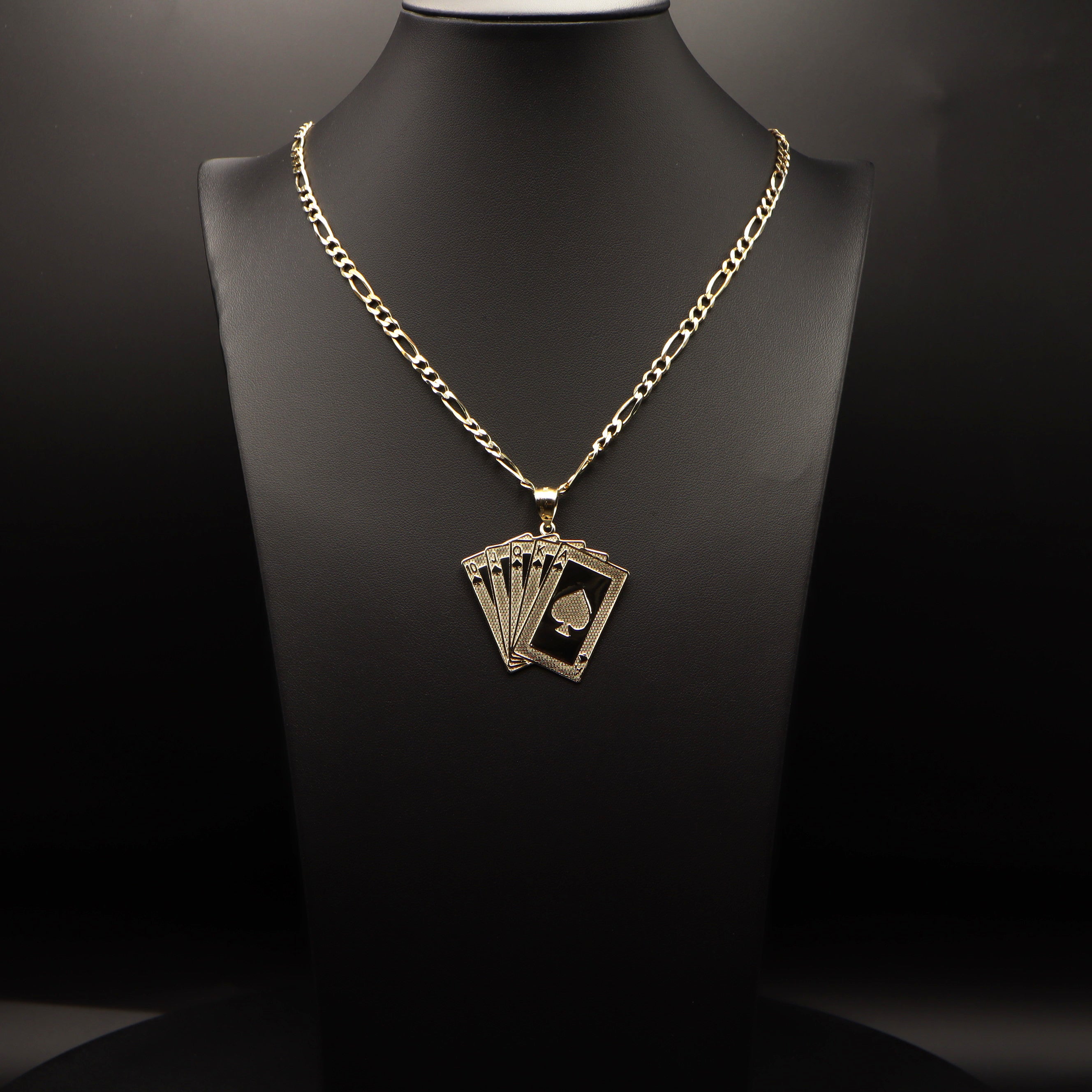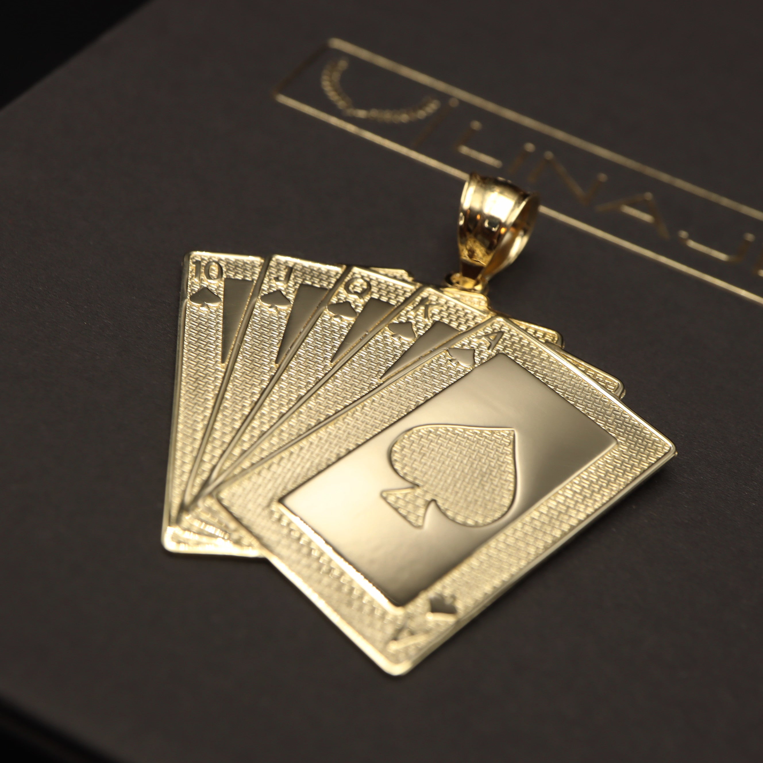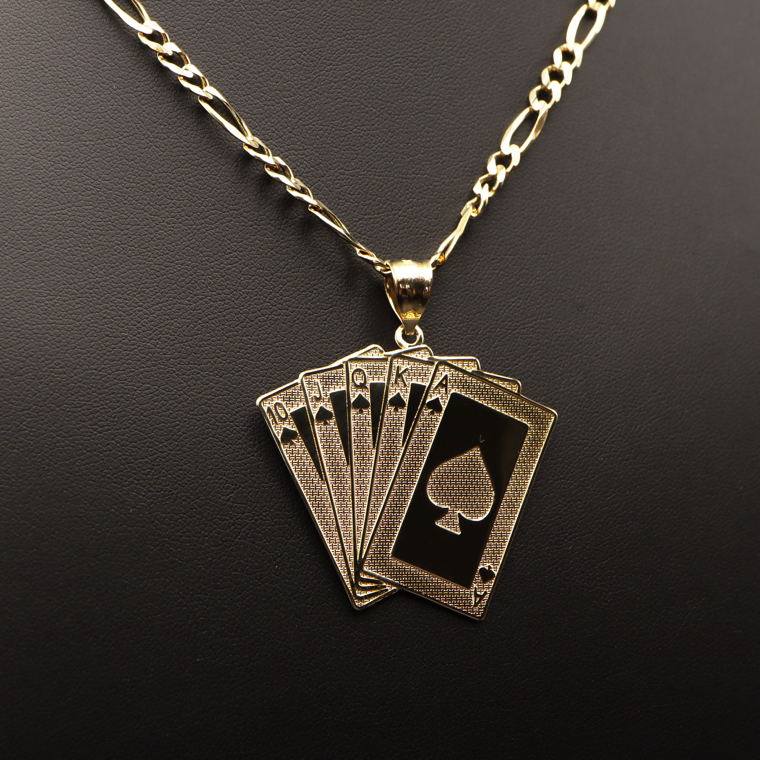 Introducing our royal flush poker pendant, crafted with precision and elegance in 14k gold. This exquisite piece pays homage to the thrill of the game with its iconic hand of cards, showcasing the royal flush in all its glory. Suitable for chains up to 6mm thickness.