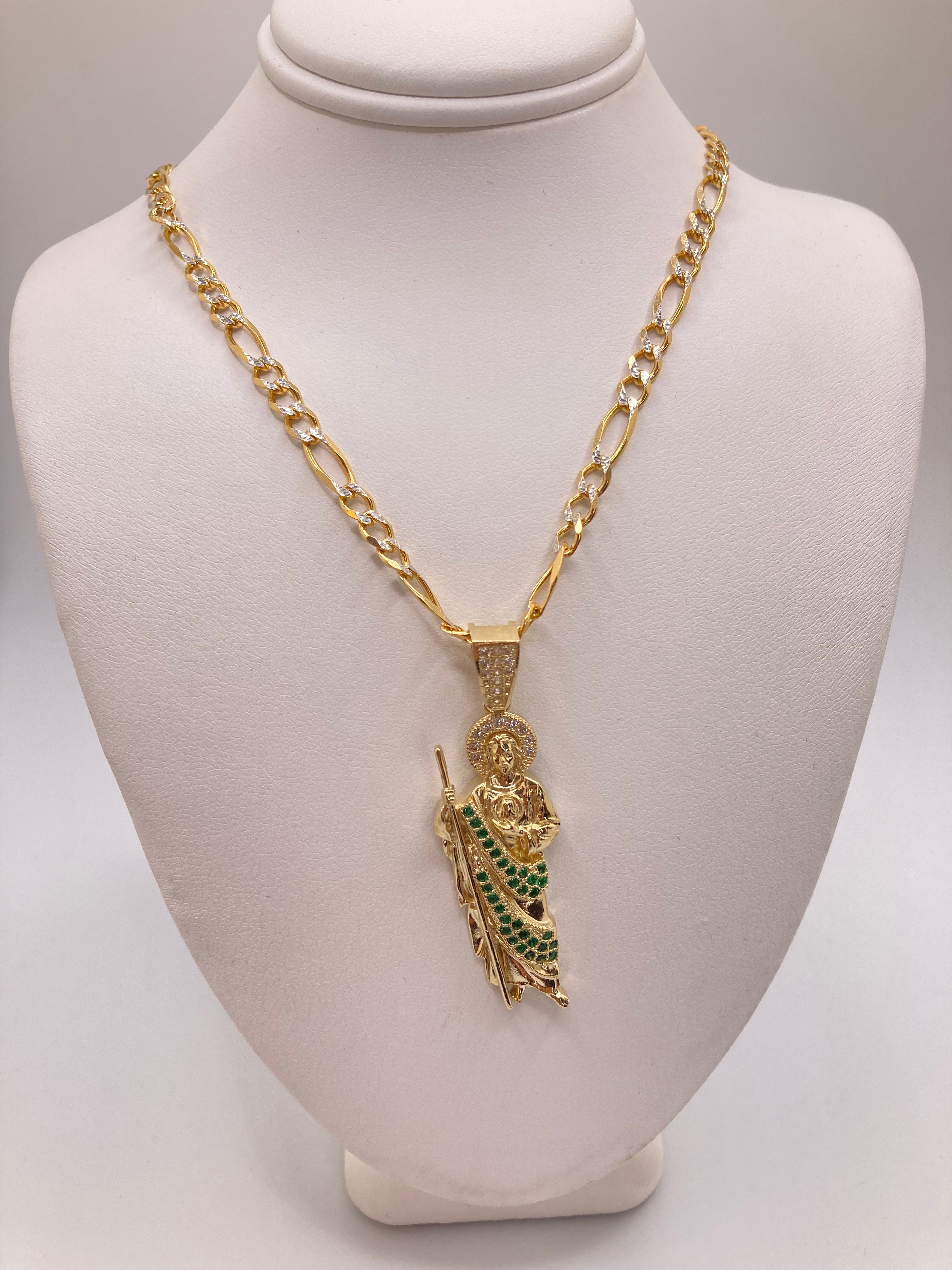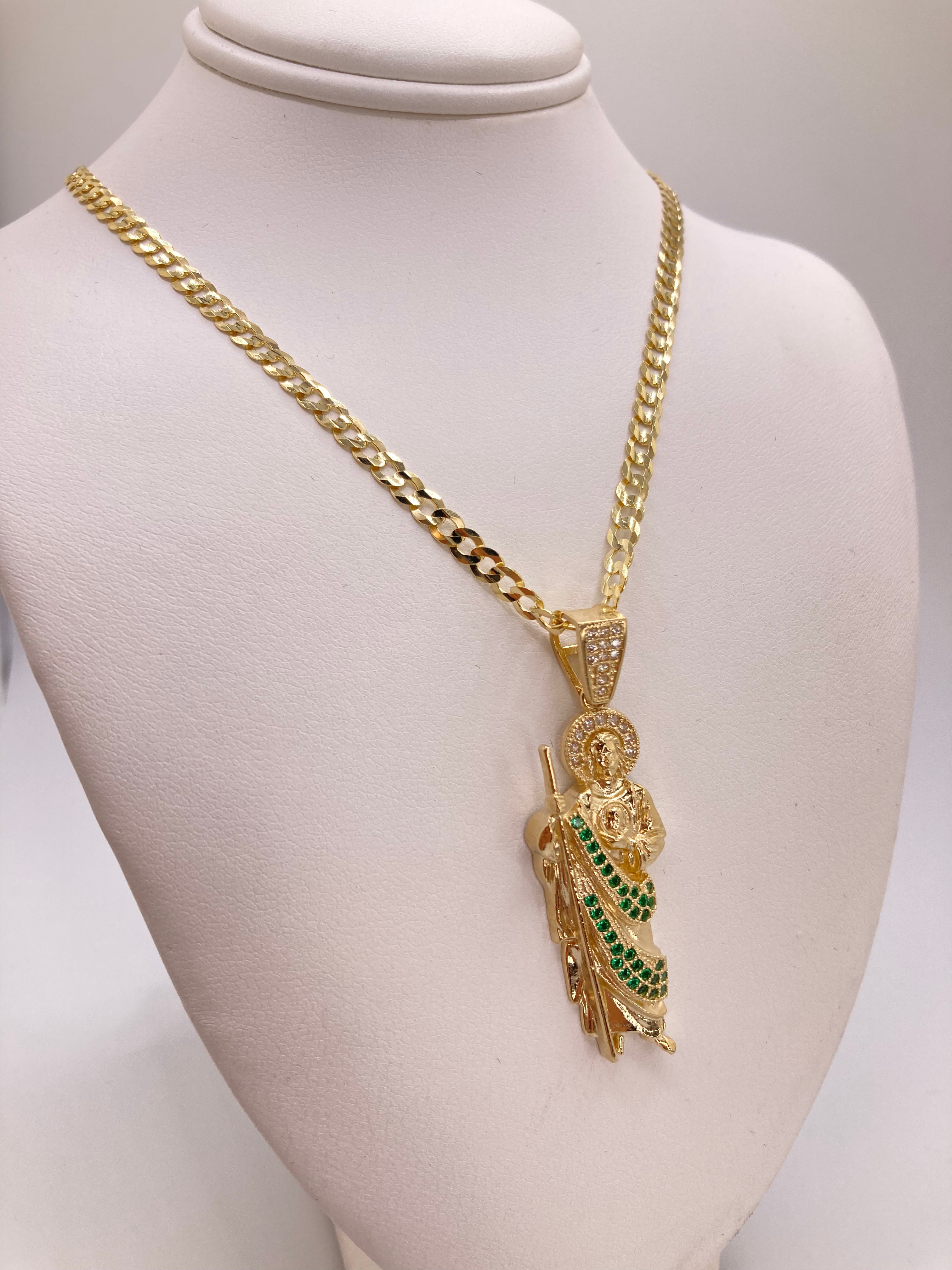 This set includes a 14K REAL gold San Judas pendant with green and white cubic zirconias. Avg weight for the pendant is 5.8 grams. Along with the pendant you also get to choose between a curb link chain and a figaro diamond cut chain. Both options are 14K gold.