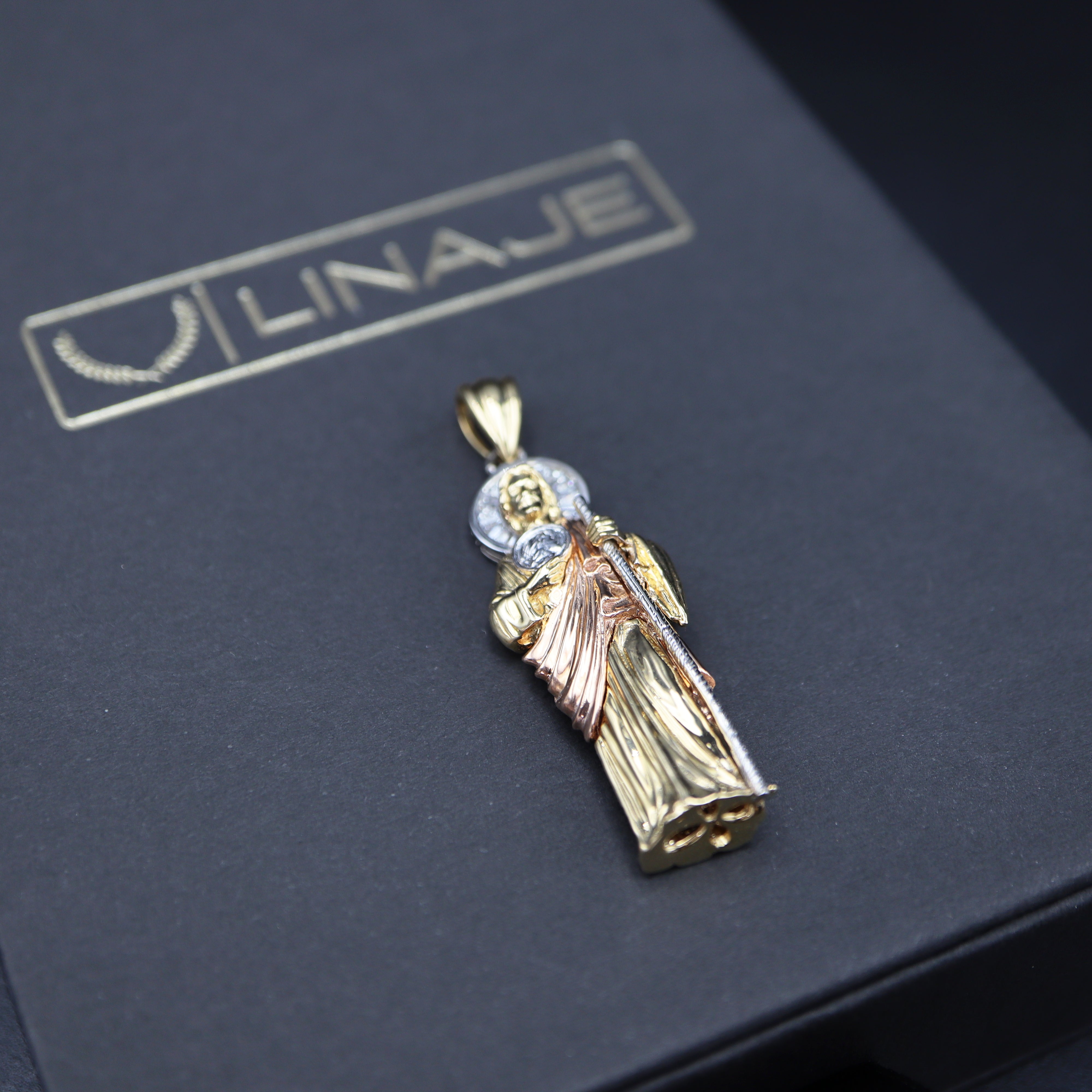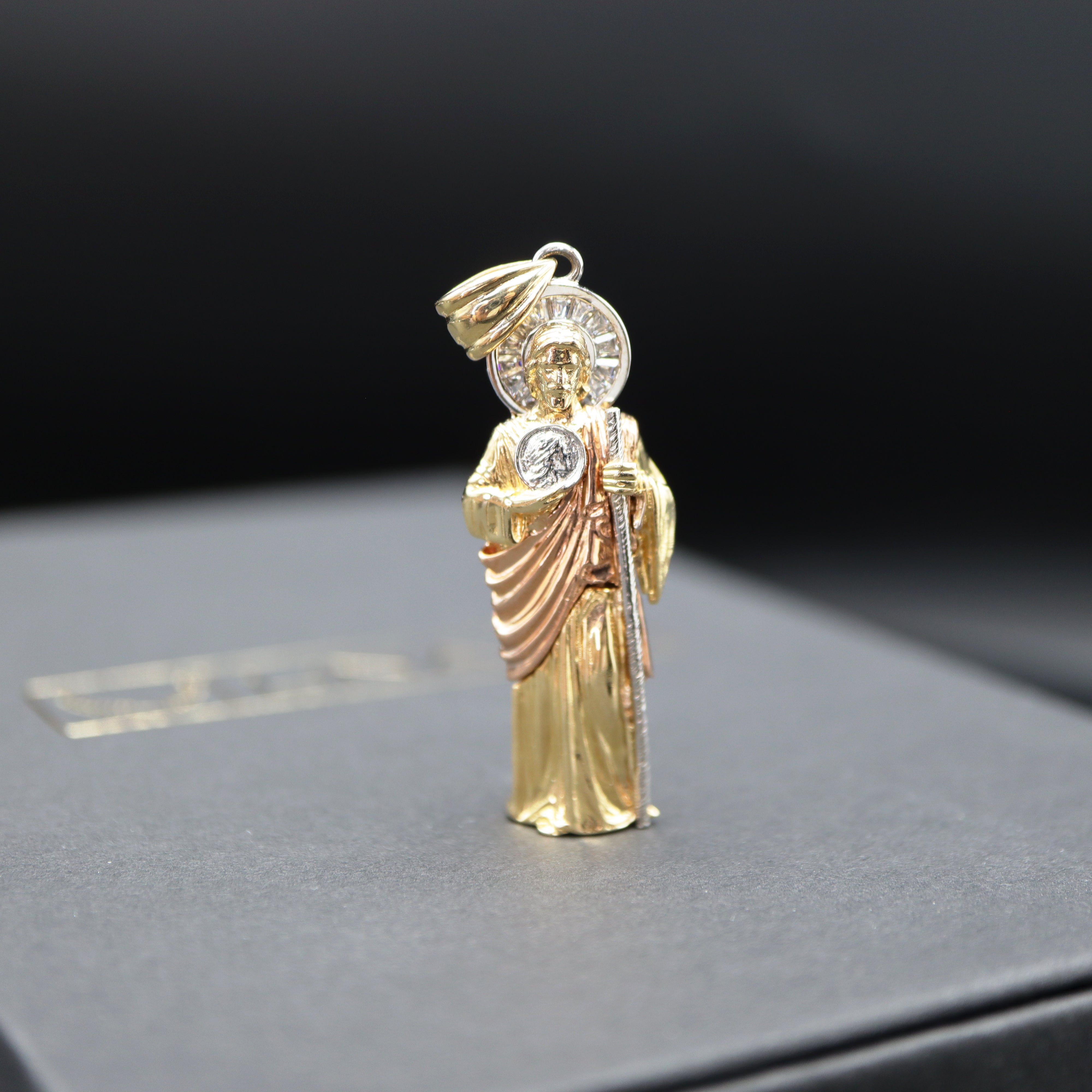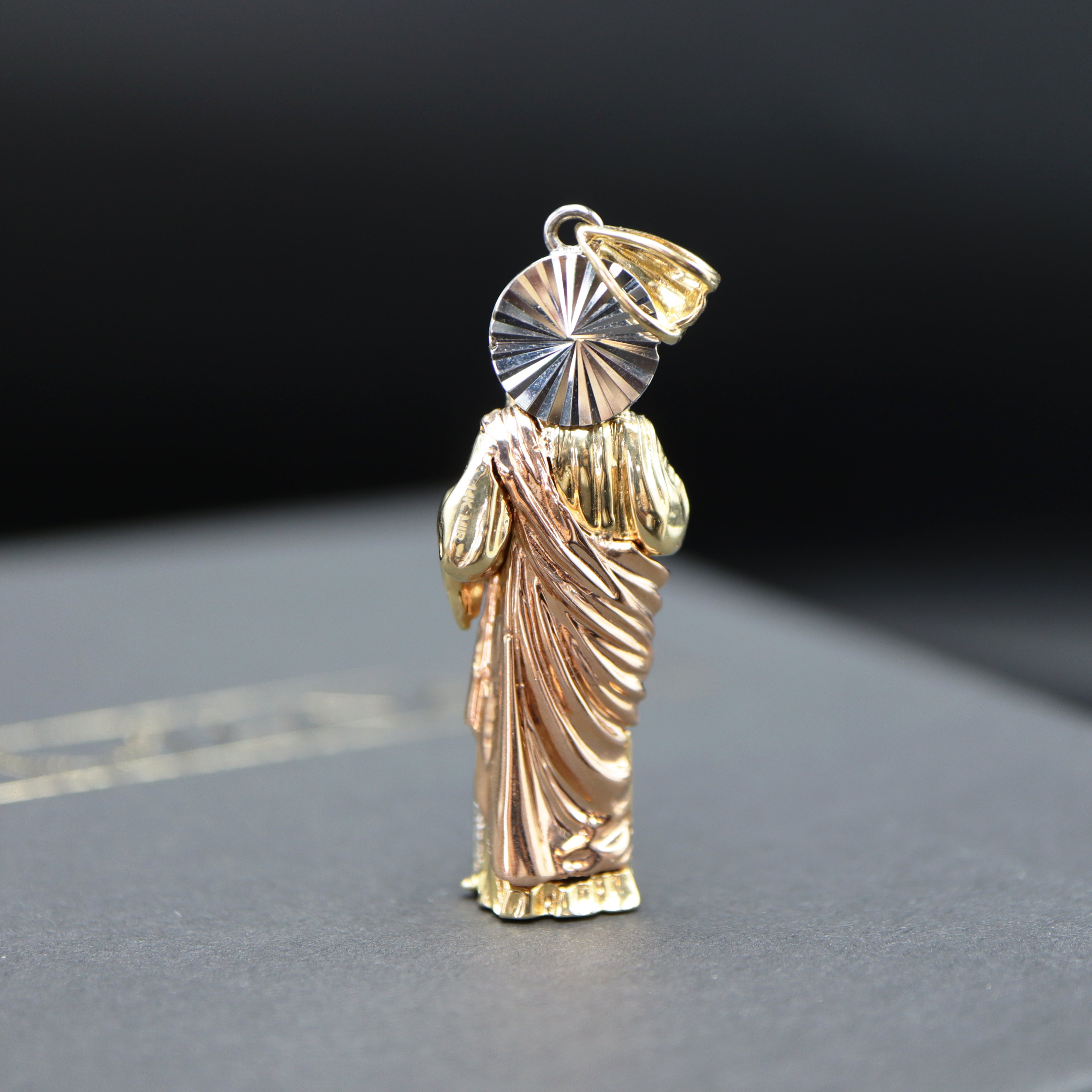 Crafted with meticulous attention to detail, this pendant showcases the harmonious blend of three gold tones—yellow, rose, and white—creating a captivating and versatile piece. The intricate design, excluding the bail, measures 1.5 inches, making it a statement of refined taste and enduring beauty.