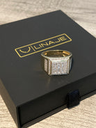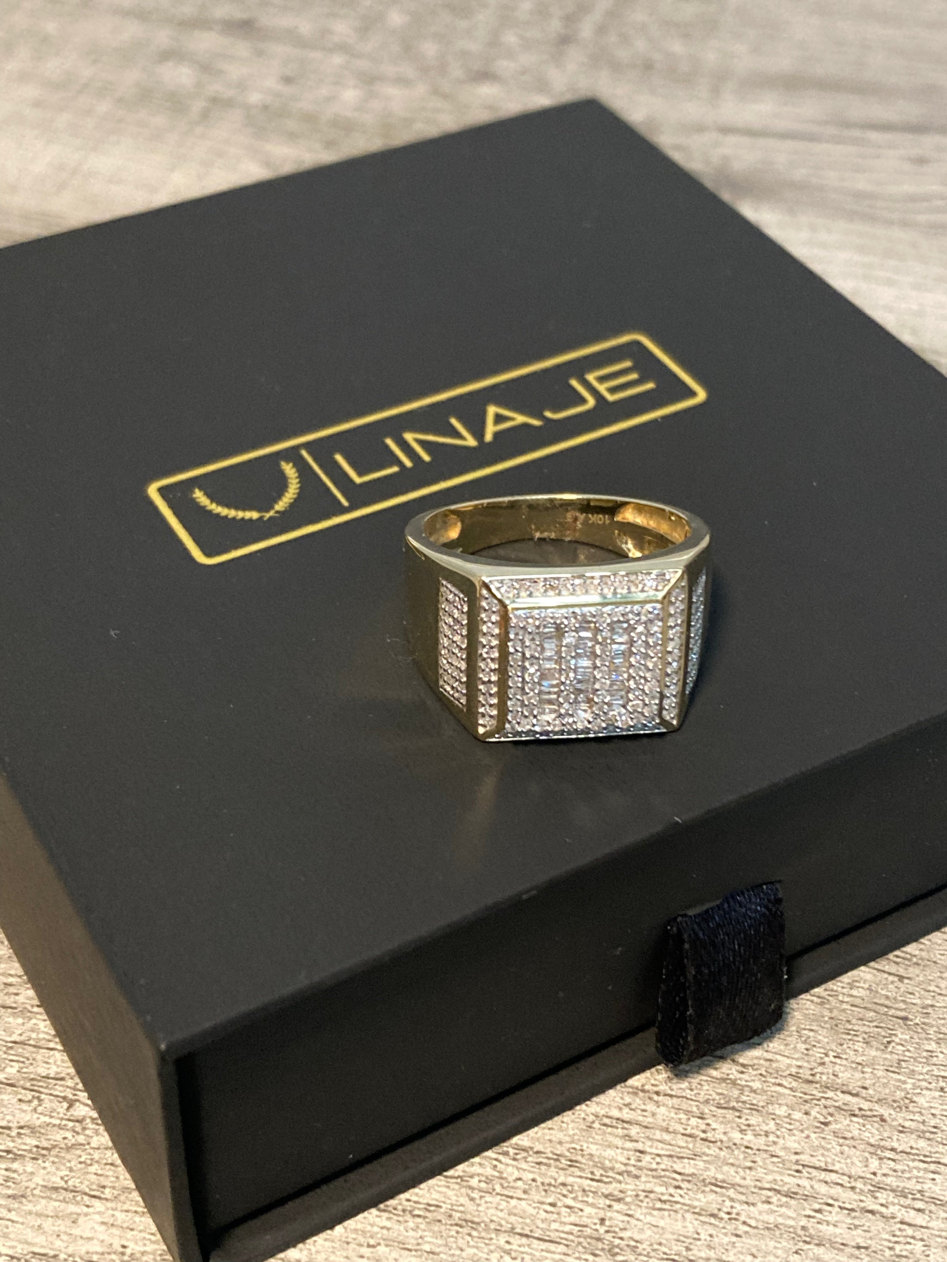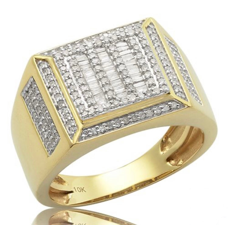 Command attention with this striking 10k ring, crafted for those who appreciate strength and style. Featuring a row of sleek baguette diamonds at the center, framed by round diamonds on the sides, this piece embodies refined power. Designed for the man who values precision and luxury, this ring makes a bold statement without saying a word.