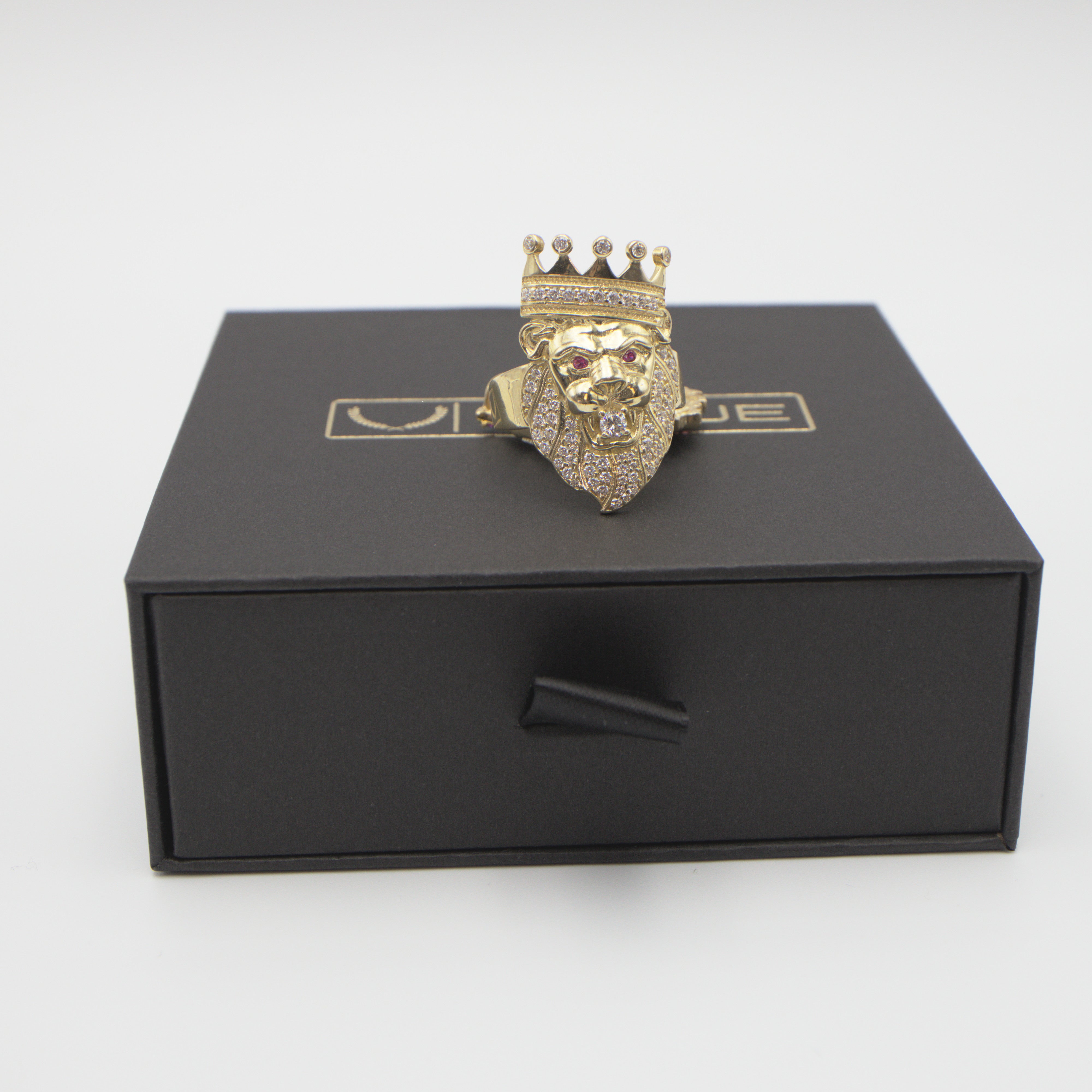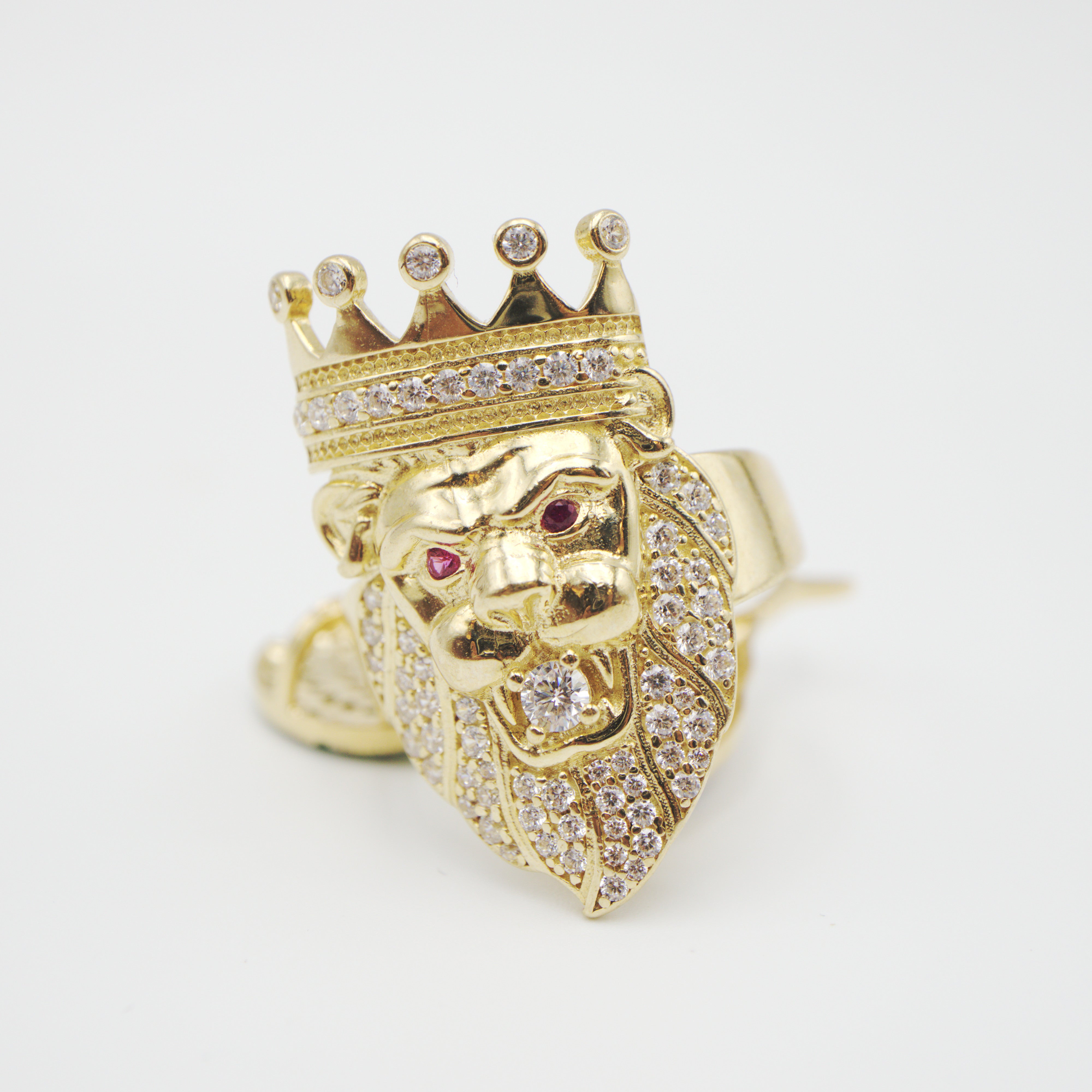 Unleash your inner royalty with our exquisite 10k gold lion ring. Crafted to perfection, this majestic masterpiece features a regal lion adorned with a dazzling crown, showcasing your majestic spirit.