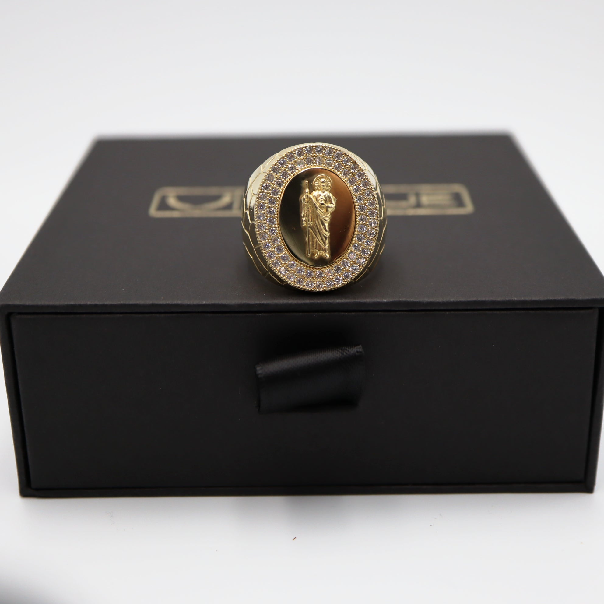 Our stunning San Judas ring is a true masterpiece, expertly crafted from high-quality 14K gold and adorned with dazzling zirconias. This ring is a beautiful tribute to Saint Jude, the patron saint of lost causes and desperate situations.