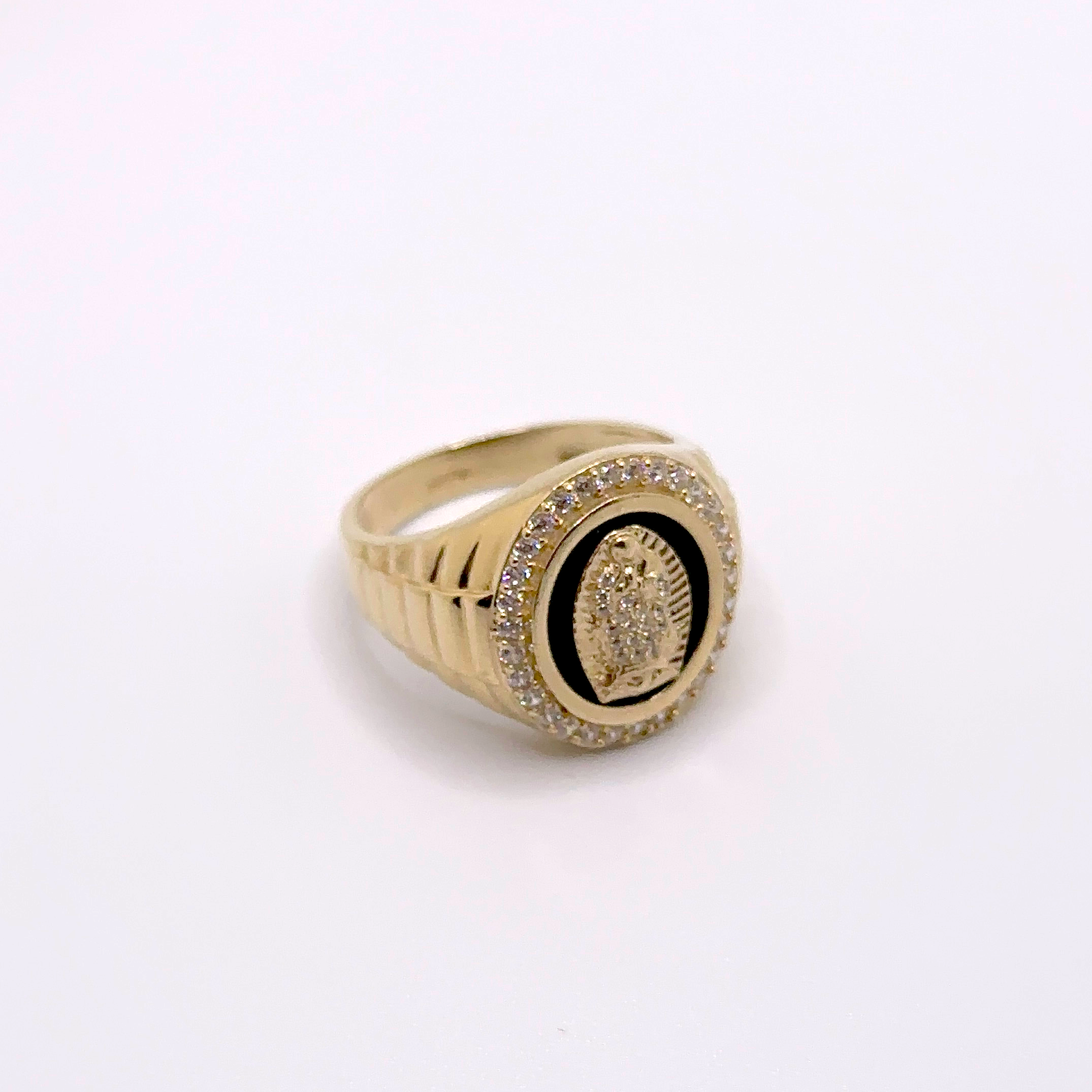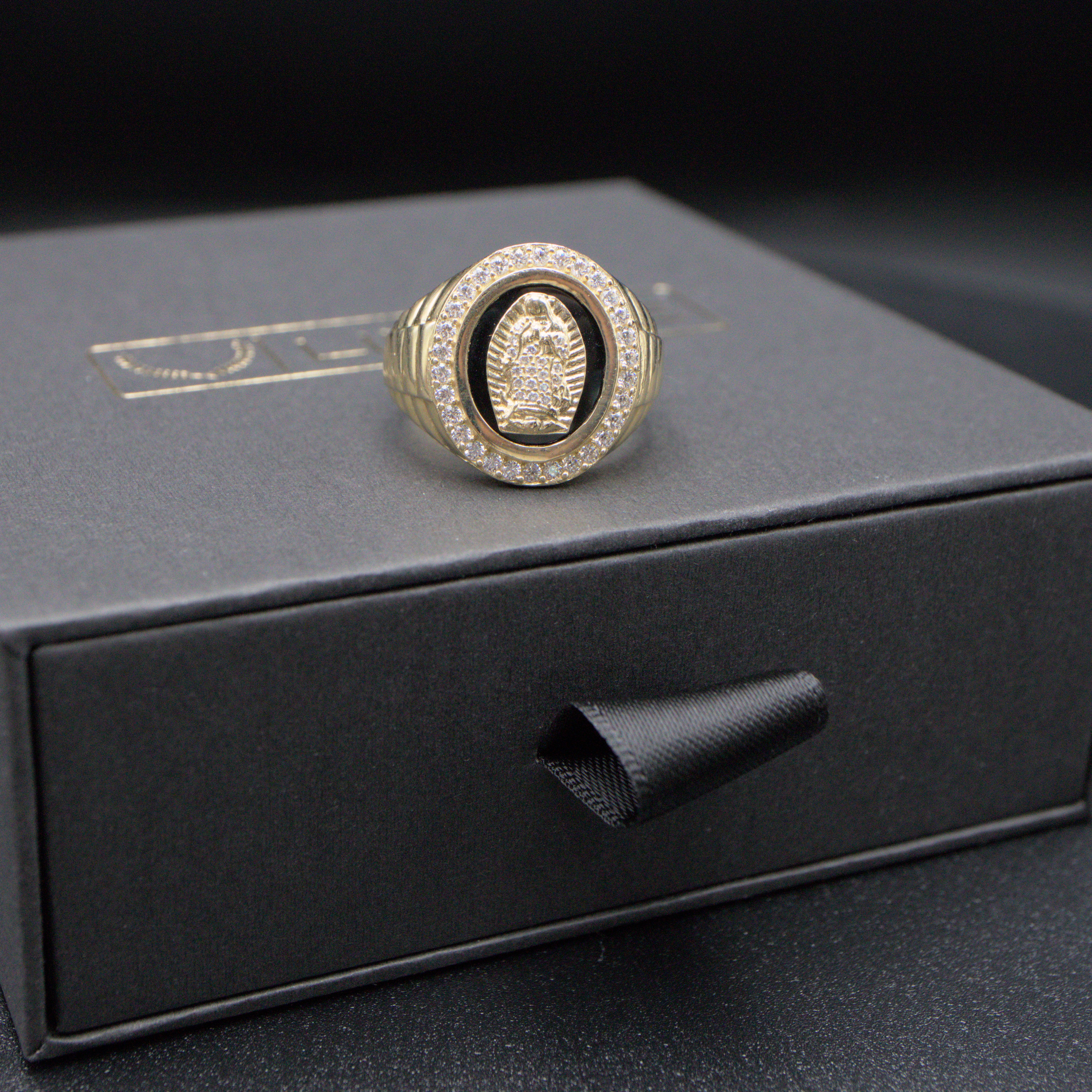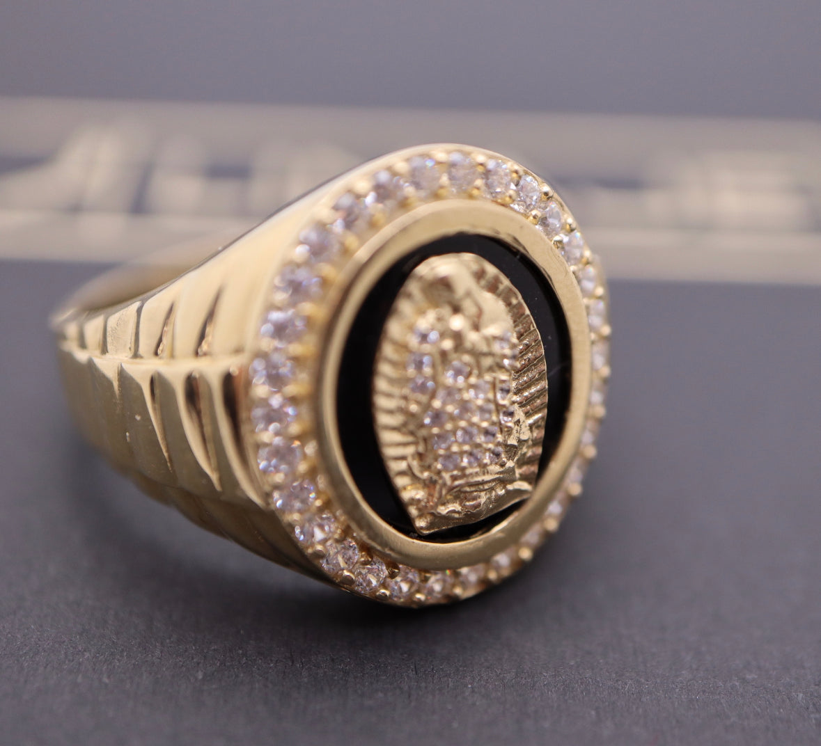 Elevate your devotion with our 14K Gold Virgen Ring, a sublime fusion of faith and elegance featuring a rich onyx background and sparkling CZ accents. Made from 14k gold and featuring an onyx background with encrusted high quality cubic zirconia's, this piece is a must in any gold collection.