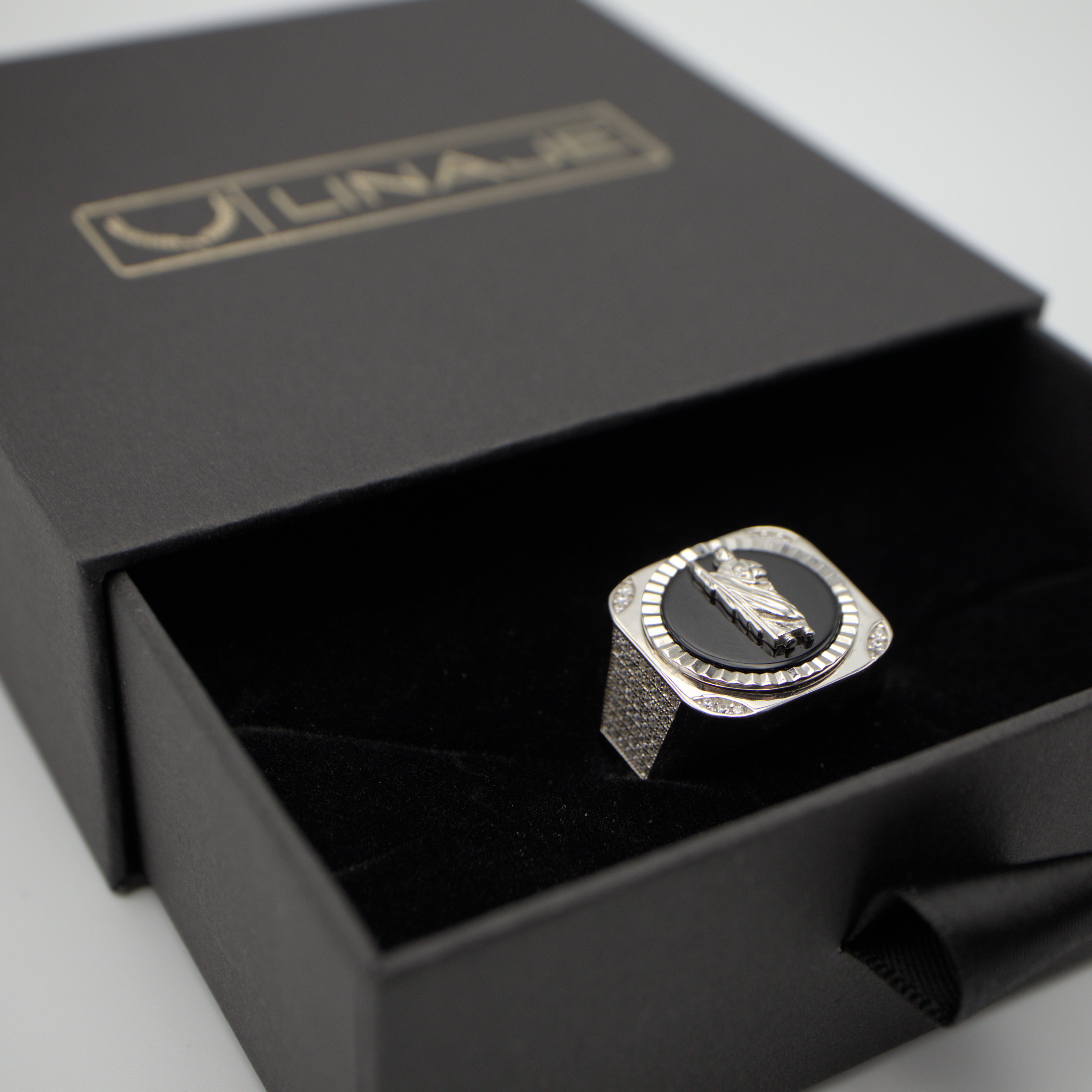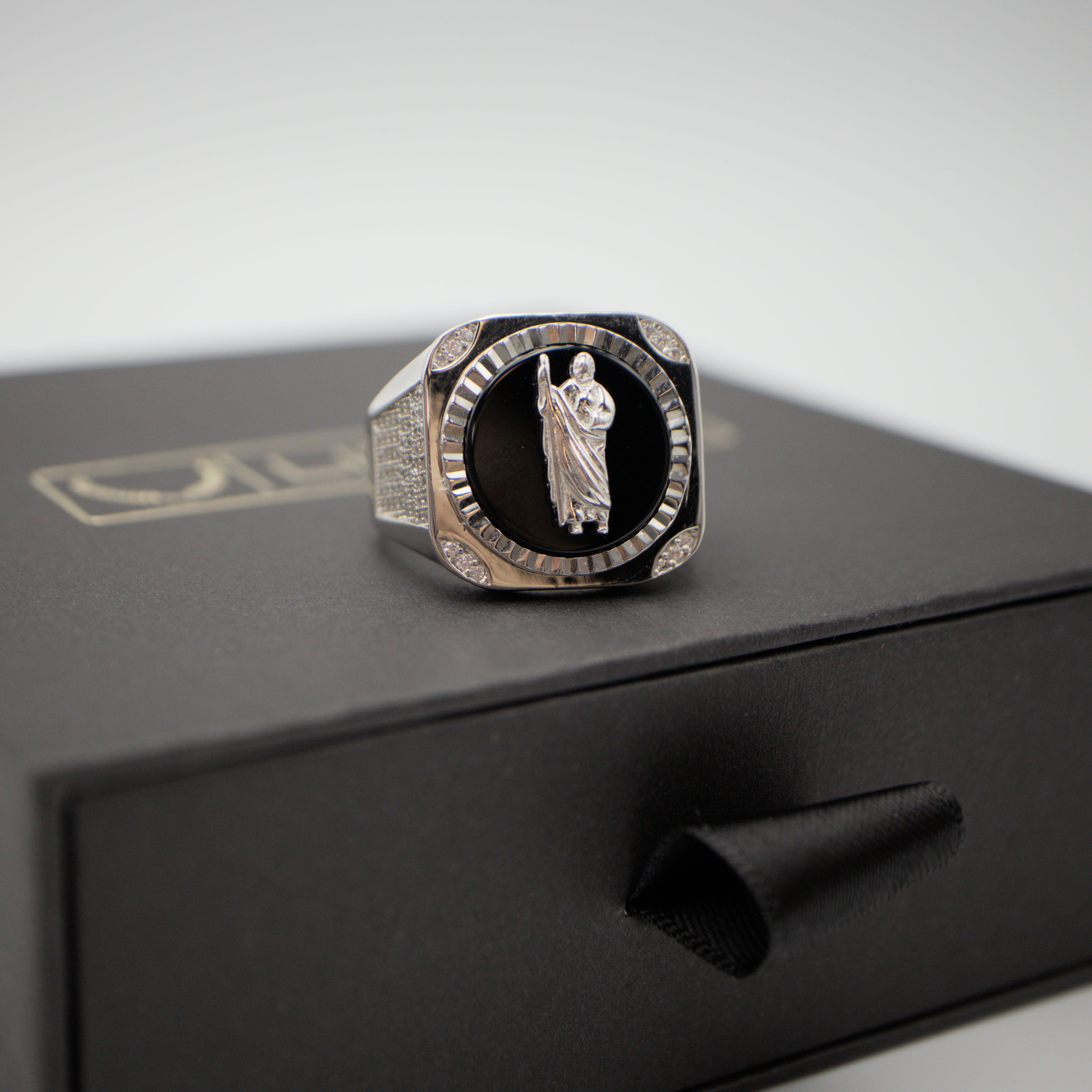 New addition to the Linaje Jewelry collection. Impressive black background San Juditas ring made from .925 silver. This piece showcases St. Jude on the center with an Onyx color background and cubic zirconia's that make this piece stand out.