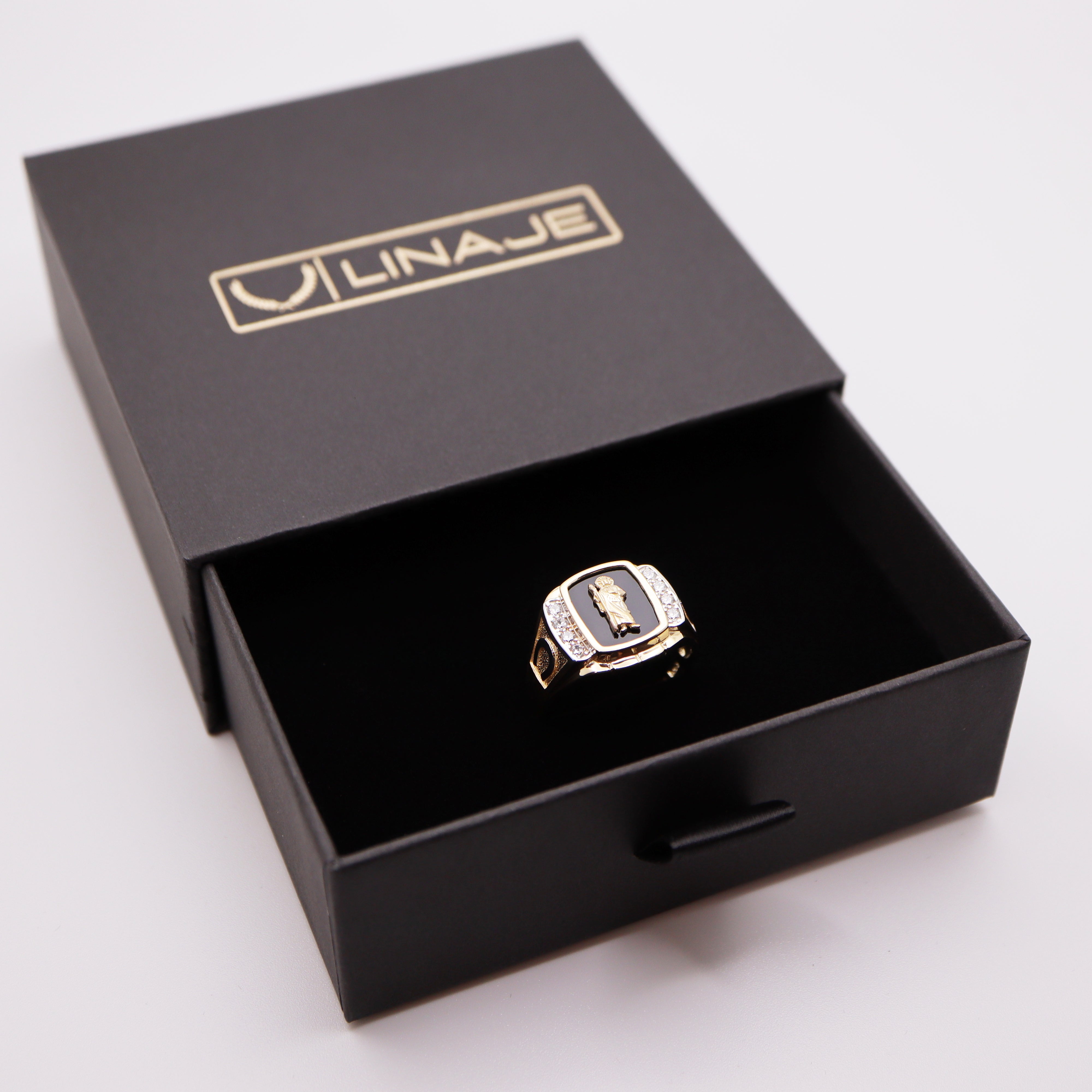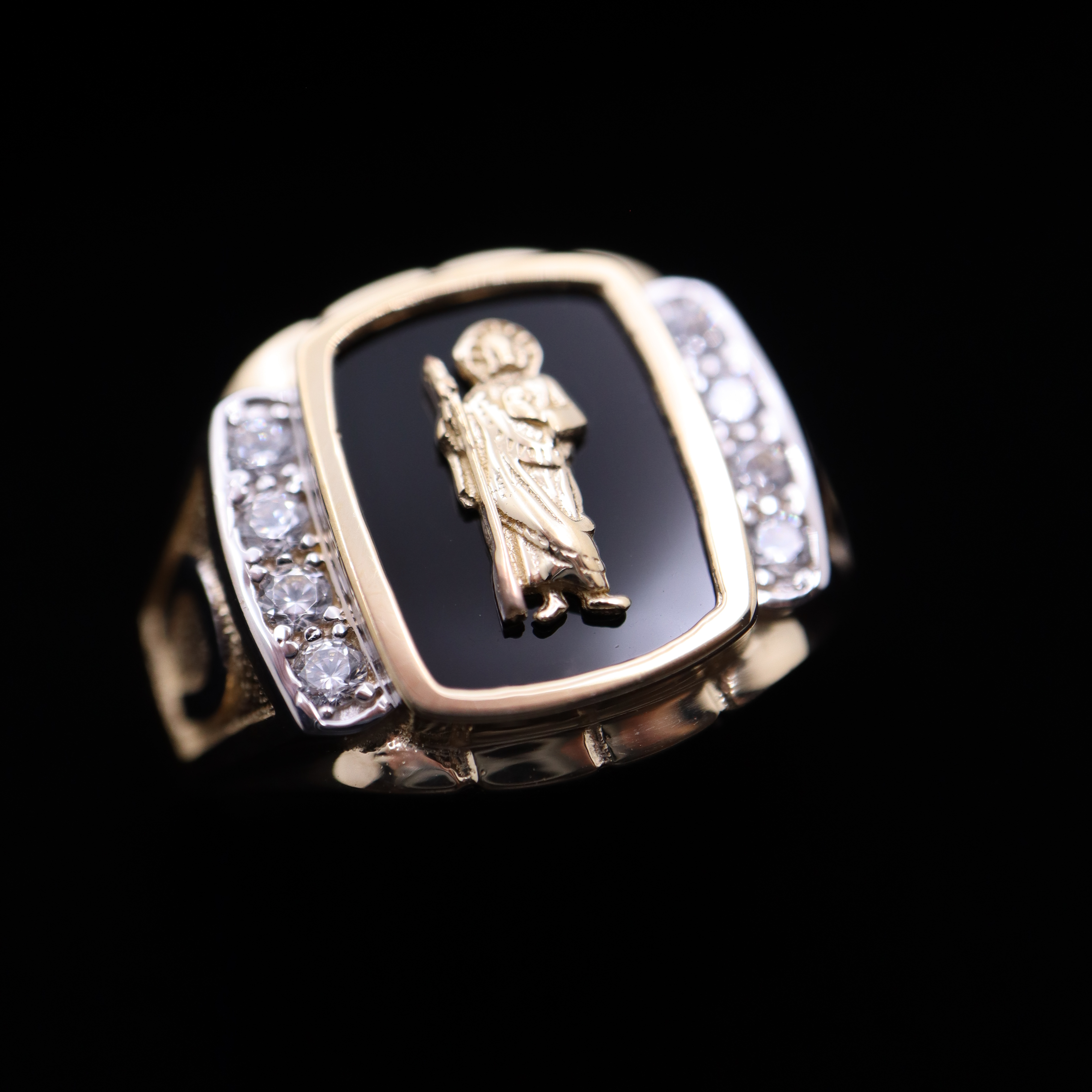 San Judas 14K solid gold ring. This piece features an onyx background with San Judas (St. Jude) center. This is high quality REAL solid 14K gold NOT gold plated.