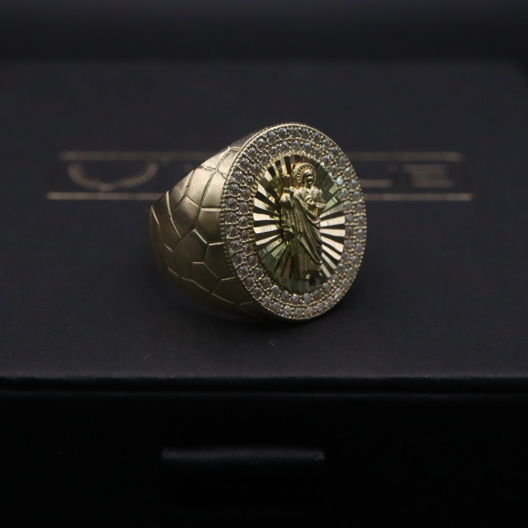 This solid 10K gold San Judas ring is a bold symbol of faith and protection. Featuring a detailed San Judas (Saint Jude) centerpiece, the design is finished with a CZ halo that adds brilliance without overpowering the gold.