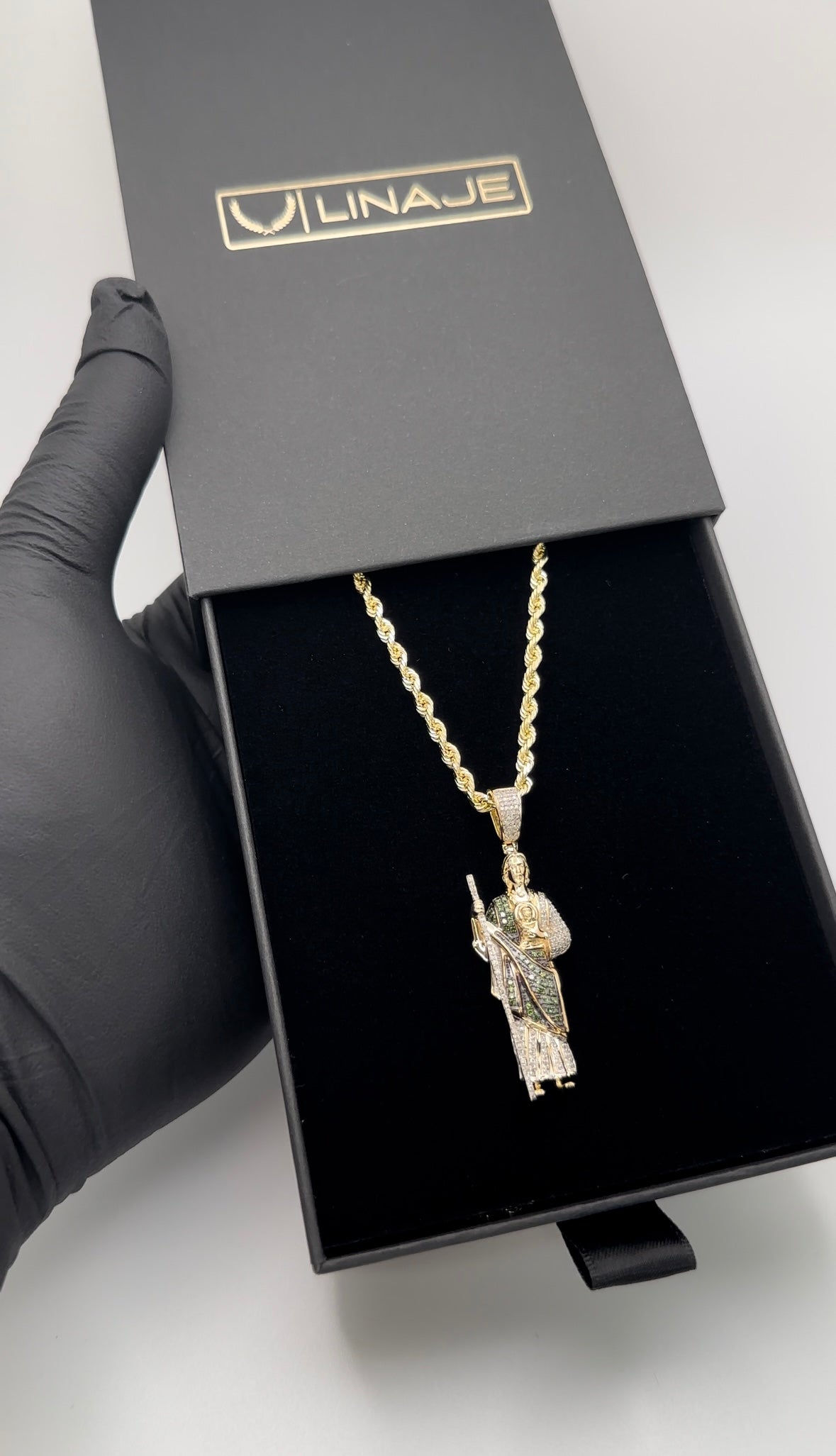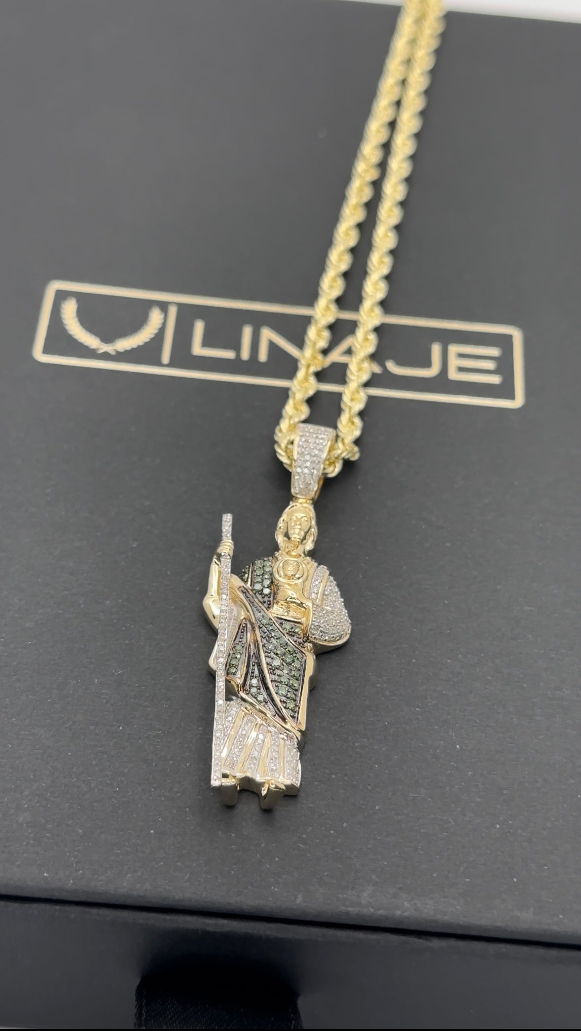San Judas pendant and rope chain set made from REAL 10K solid gold. Pendant showcases full set of real natural diamonds. Pendant height with bail is 1.75 inches total.