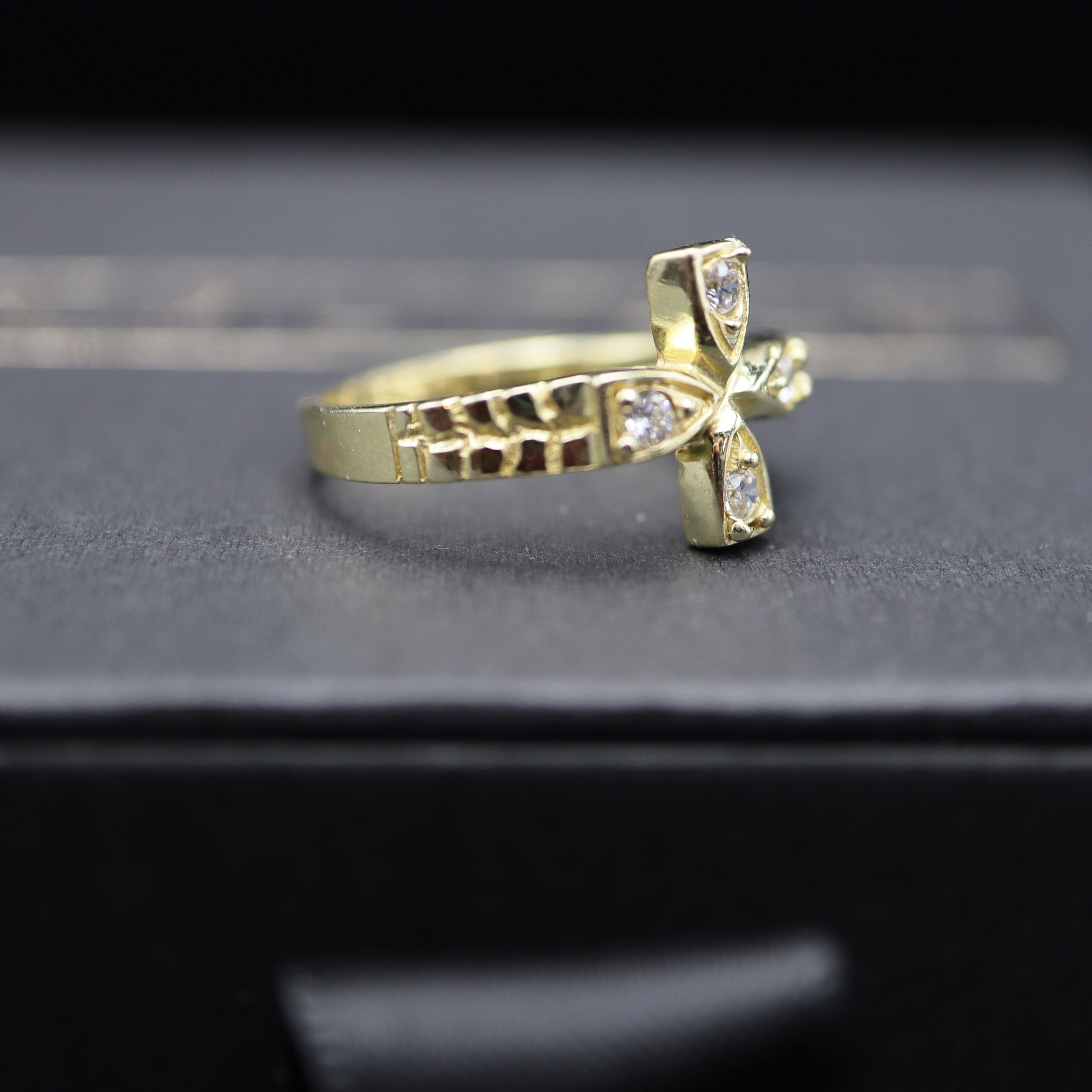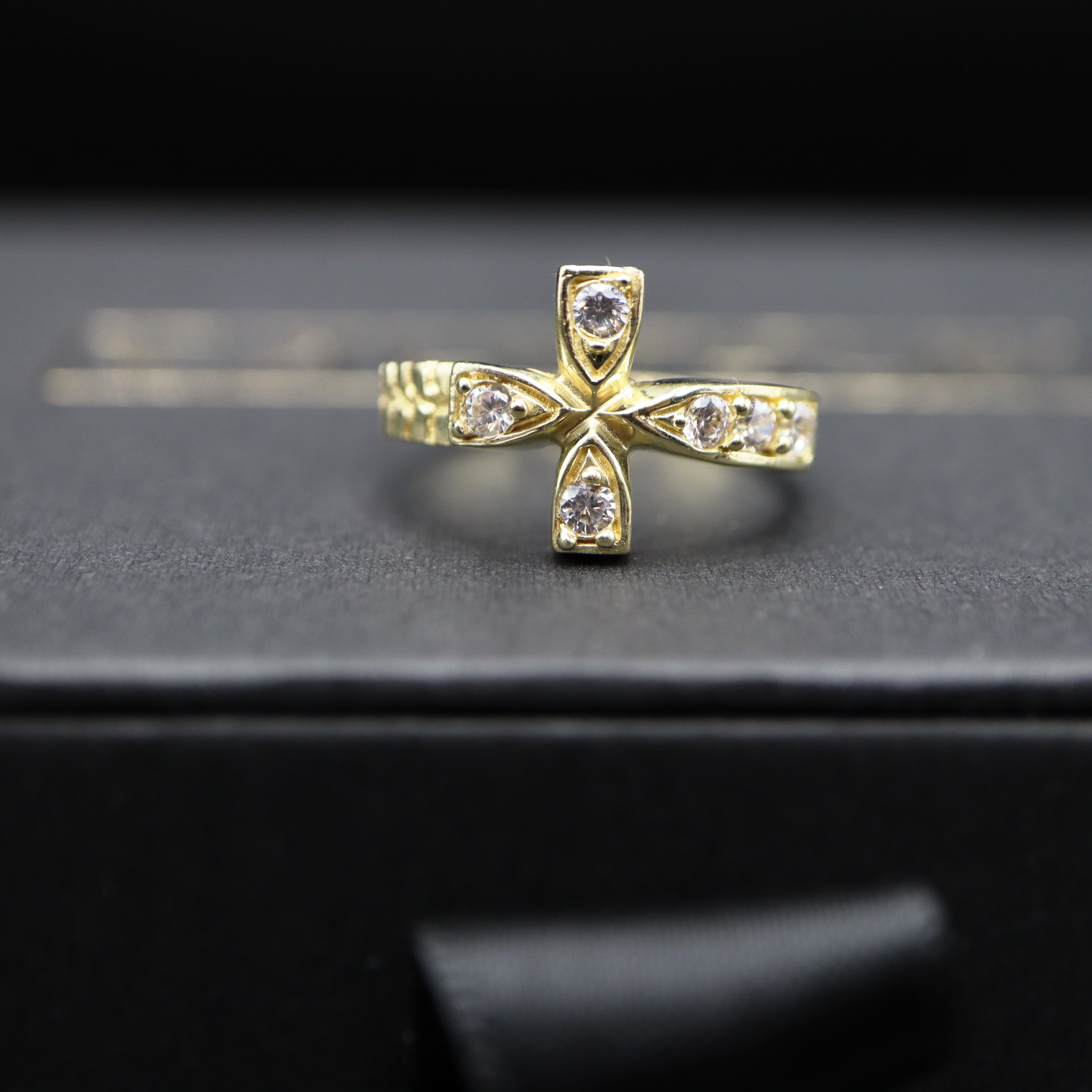 Elevate your faith with our Women's 10K Gold Cross Ring adorned with shimmering CZ stones. Crafted with precision and devotion, this exquisite ring embodies both spirituality and style. Each CZ-studded cross is a symbol of unwavering faith and enduring elegance.