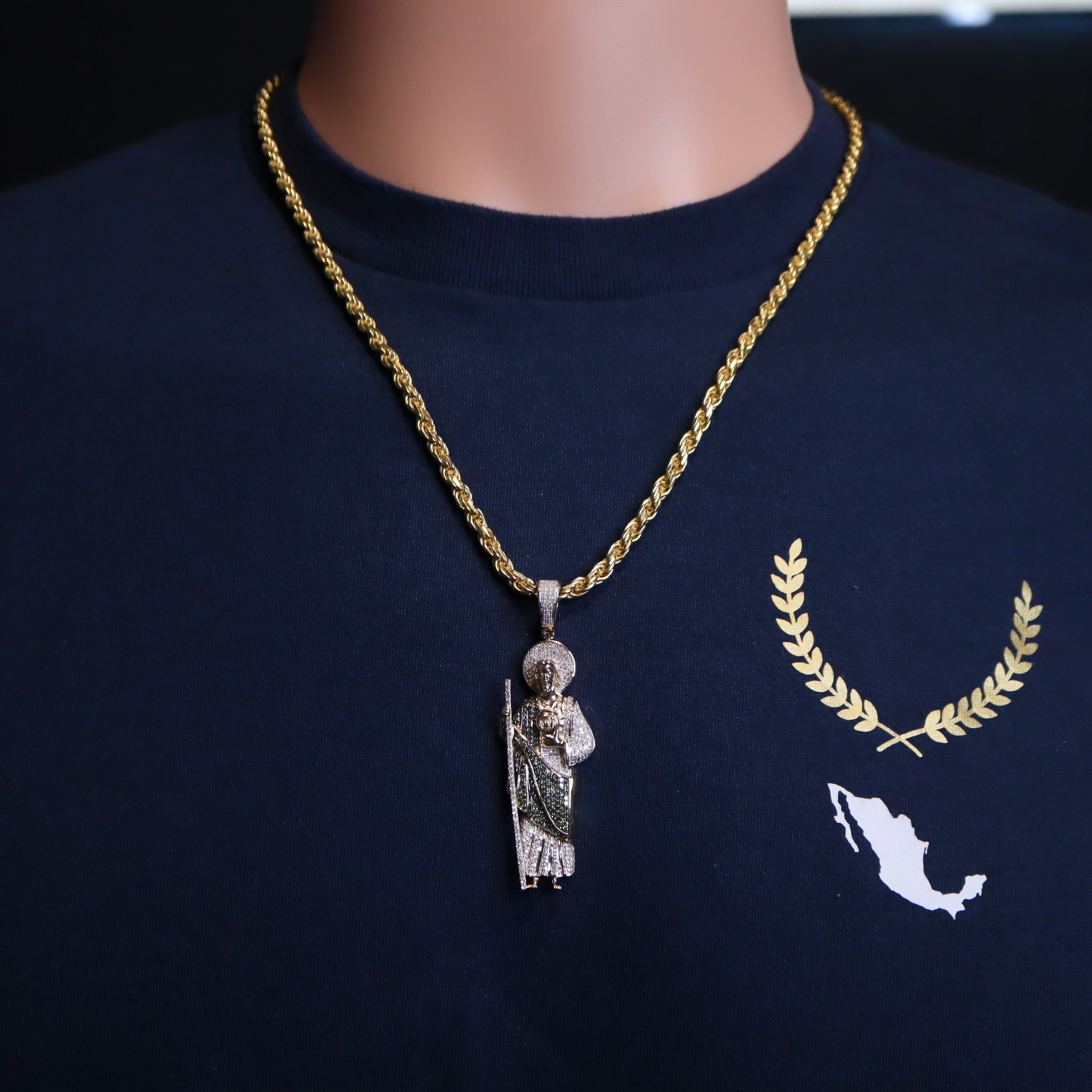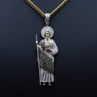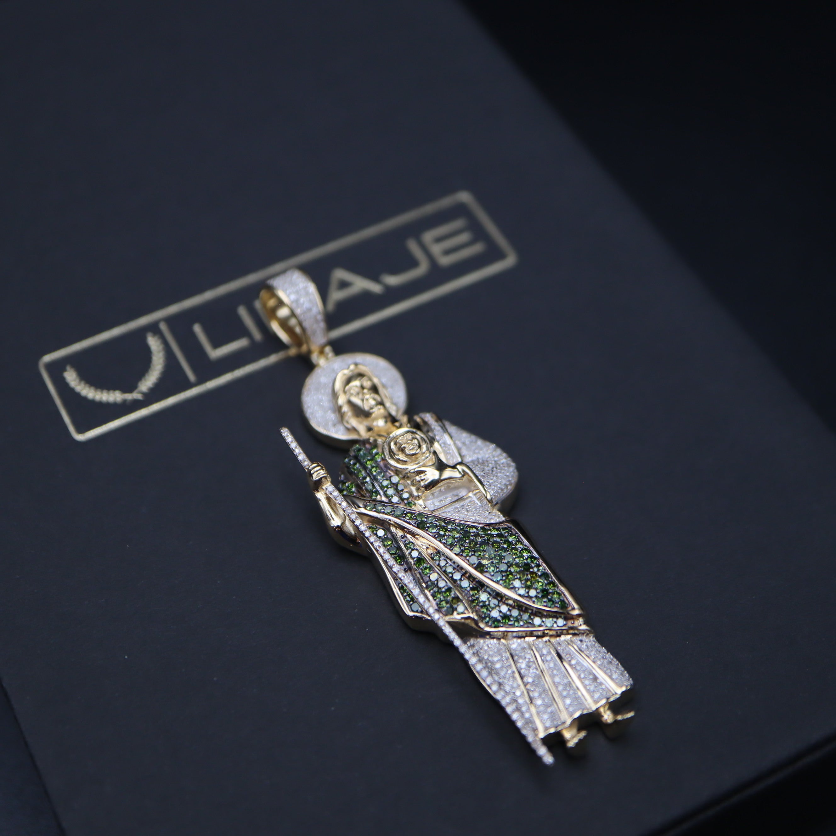Experience divine elegance with our Diamond San Judas Pendant, a masterpiece crafted from exquisite 14K gold. Adorned with a robe embellished in resplendent white and green diamonds, this pendant is a symbol of faith and protection. This piece showcases 1.25 carats of beautiful natural diamonds. Approx. height 2 inches (San Judas only) & 2.5 inches including bail.