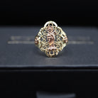 At the heart of this exquisite ring, La Santa is elegantly rendered in alluring rose gold. The distinct hue adds an enchanting touch to the sacred design, symbolizing life's delicate balance and the embracing of both light and shadow.