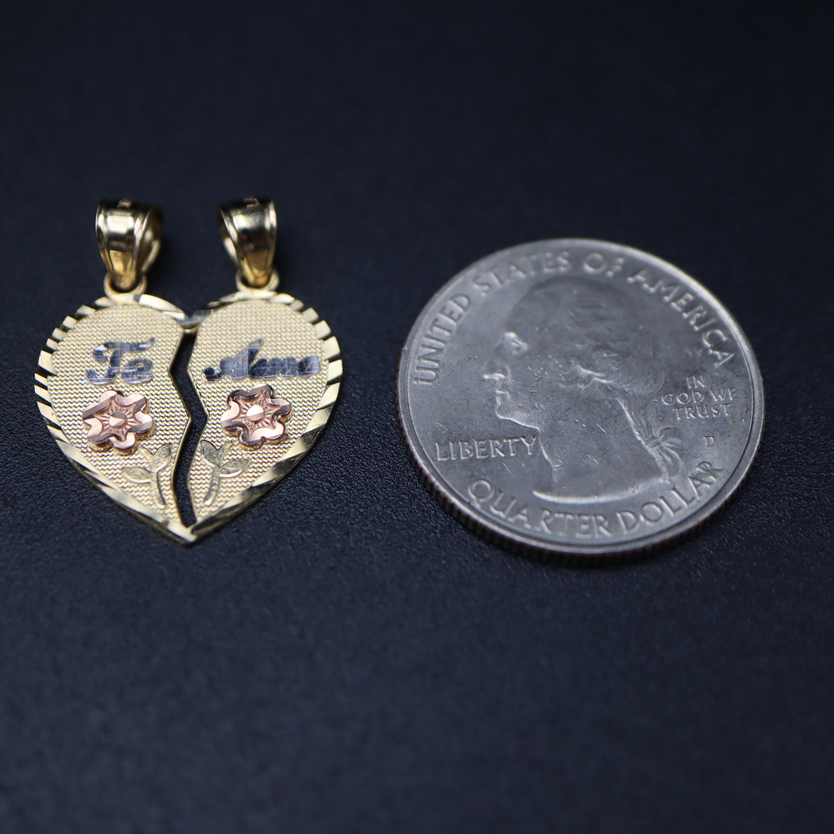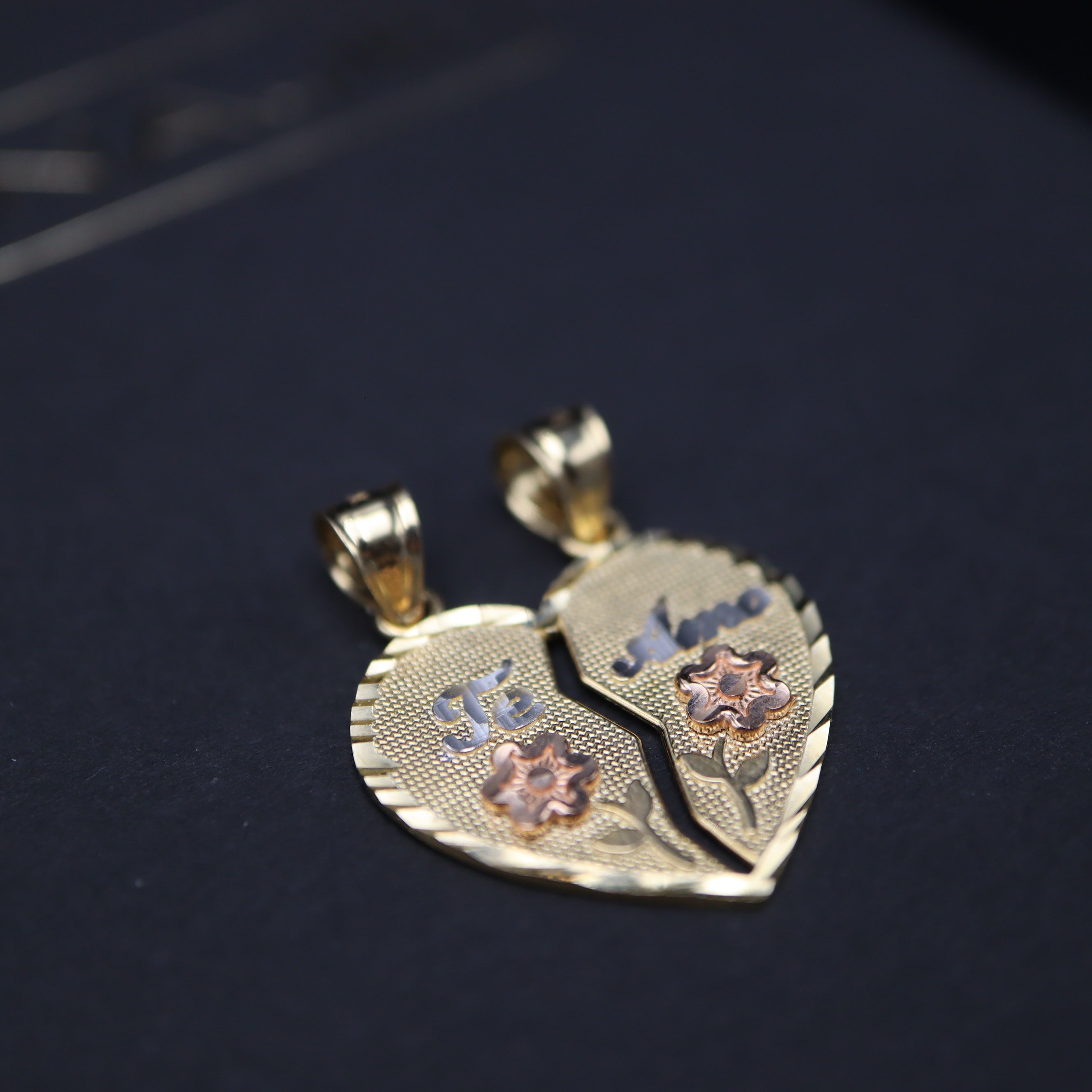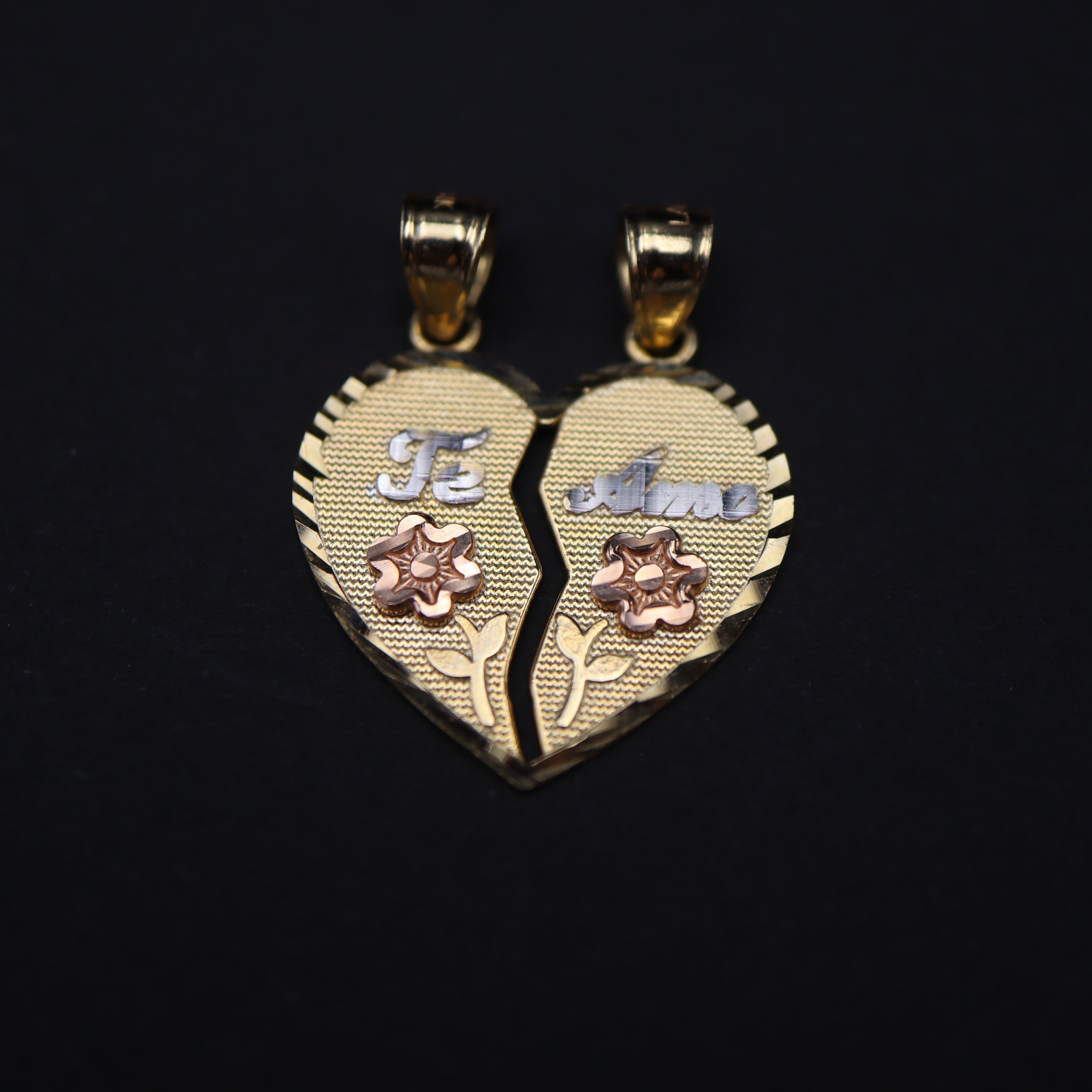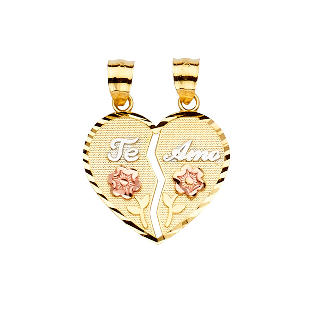 Express your love with our 14k Gold Breakable 'Te Amo' Pendant, featuring delicate roses on each side. Crafted for cherished moments, this unique pendant elegantly separates into two halves, symbolizing the unity of two hearts.
