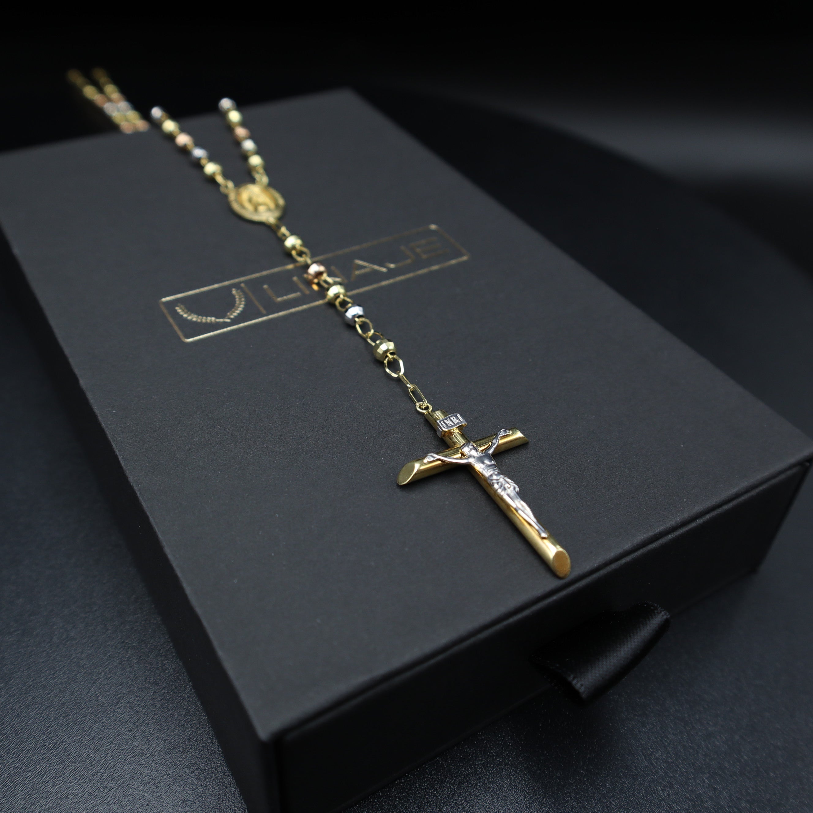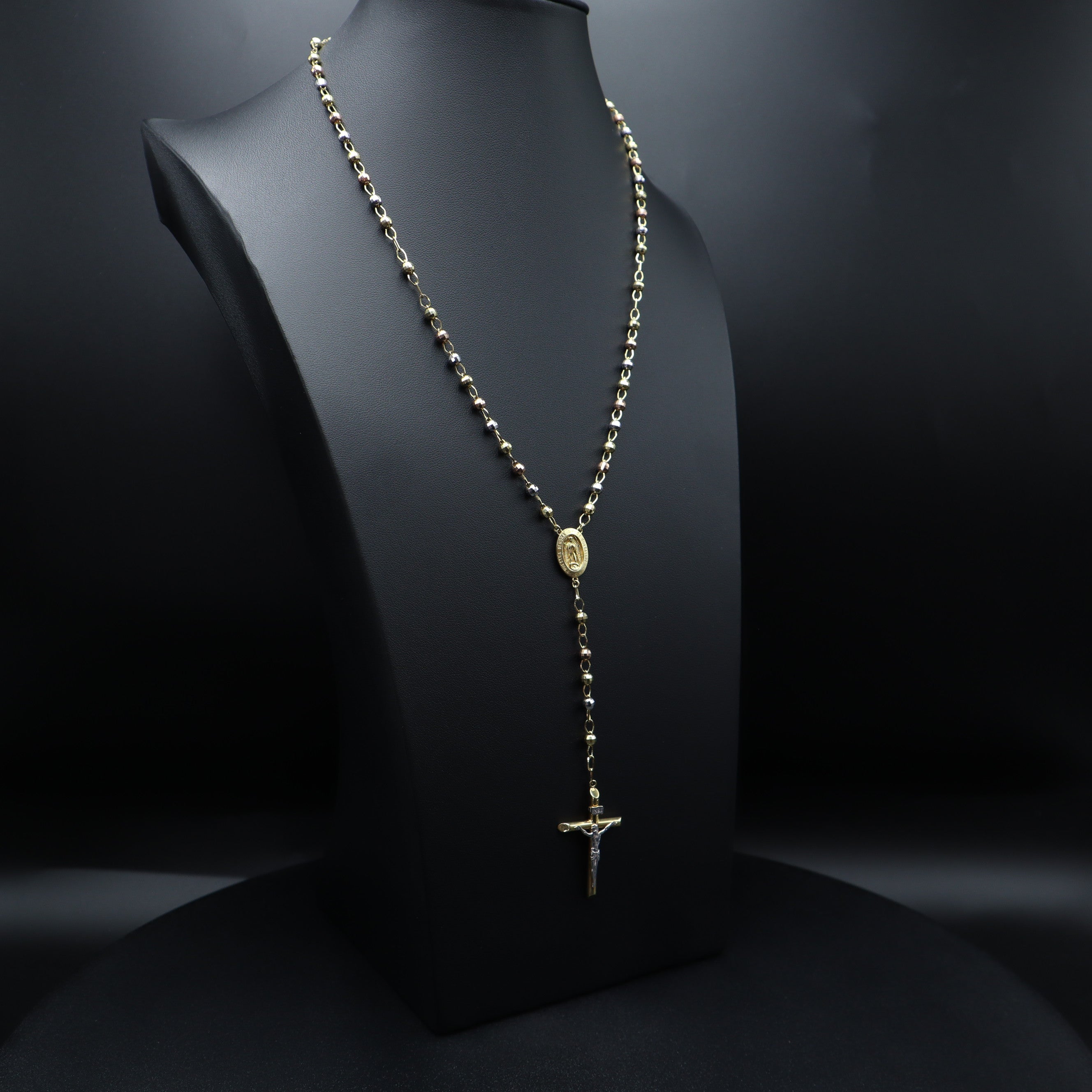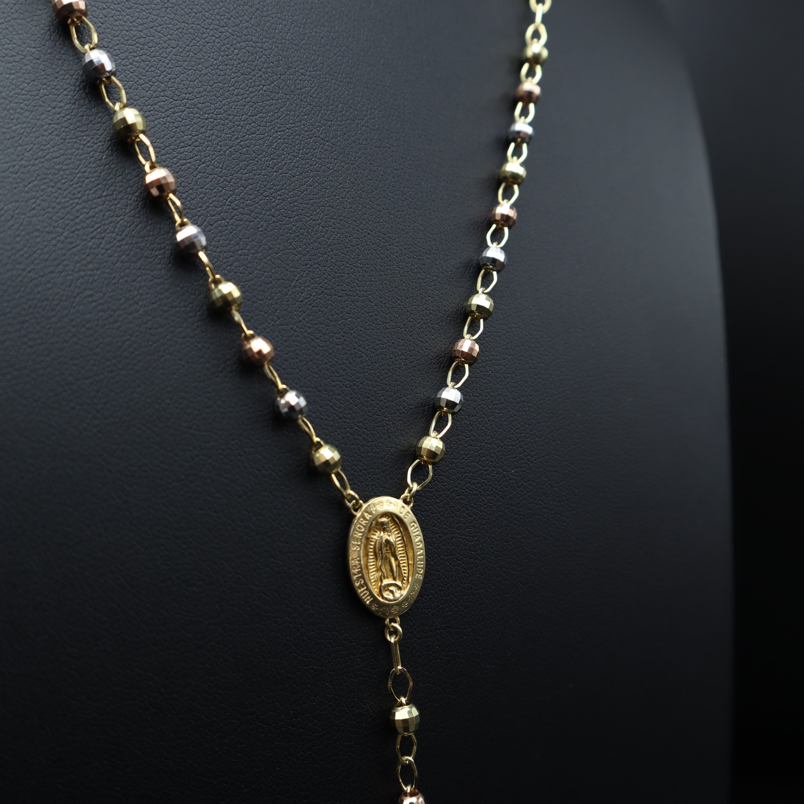 Featured in three shades of gold (yellow, white, rose) this piece is a must for any jewelry collection. The Rosary is 20 inches in length with an additional 4 inches from la Virgen to Cross.