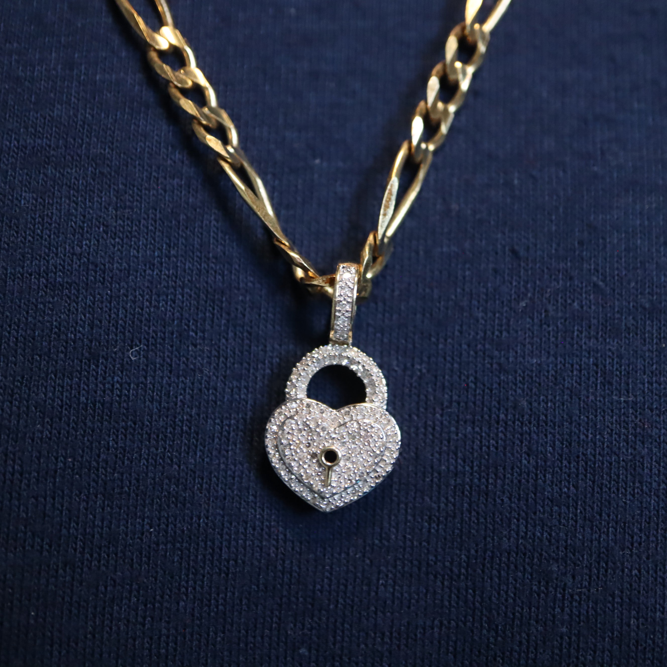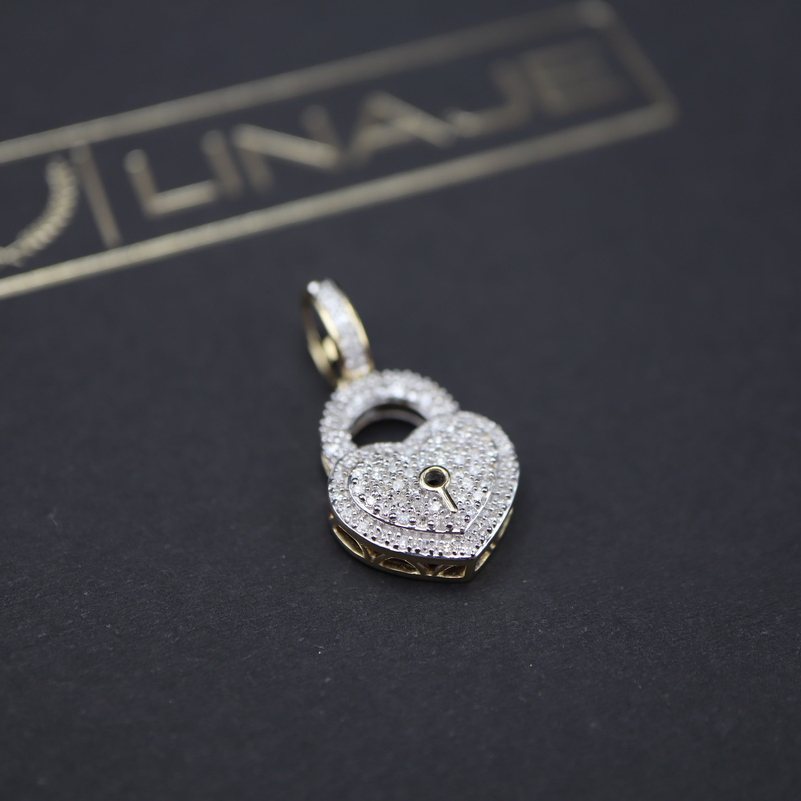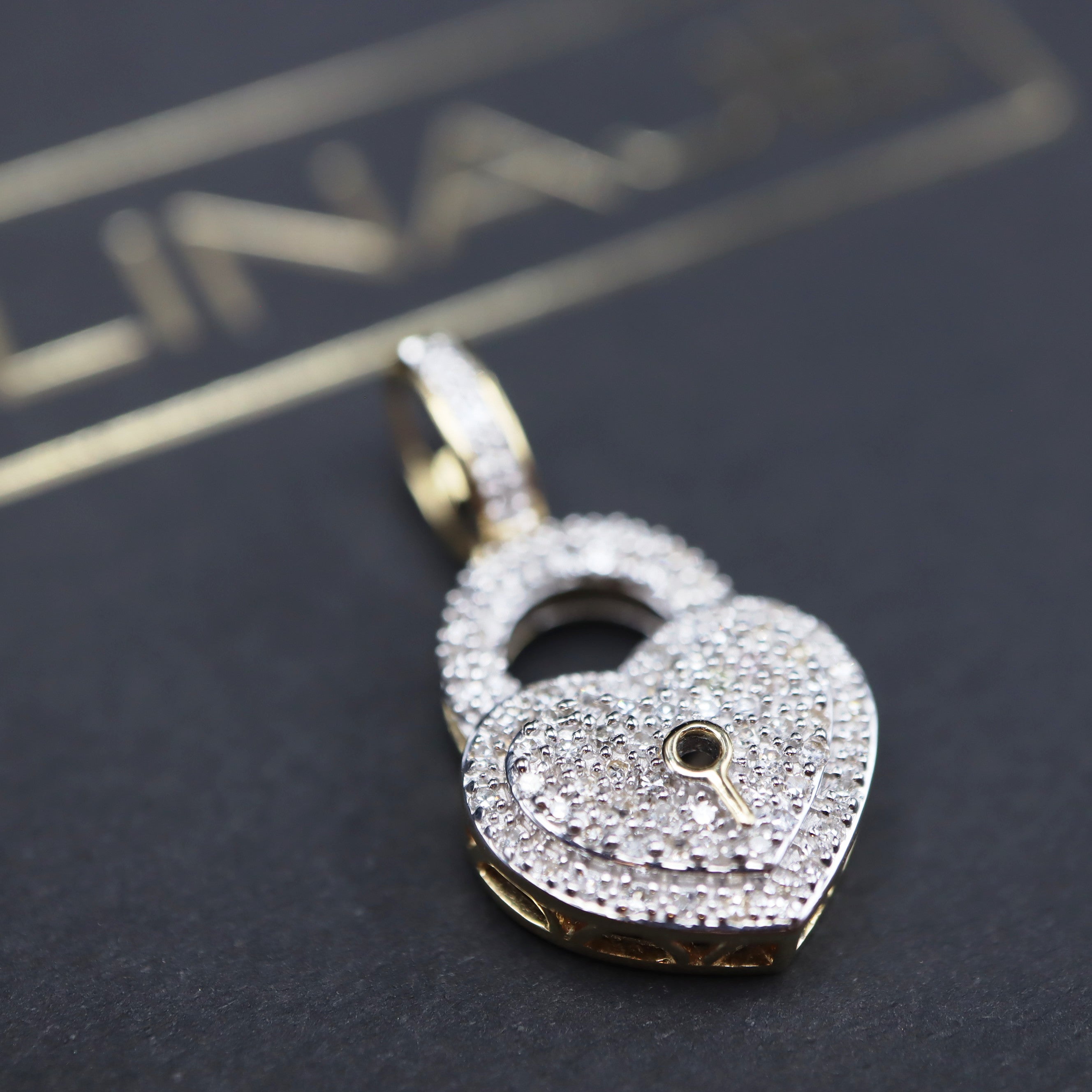Unlock the language of love with our Heart Lock Pendant in radiant 10k gold, gracefully adorned with .25 carats of dazzling diamonds. This exquisite piece captures the essence of elegance and sentiment, making it the perfect symbol of lasting affection. Elevate your style and embrace the brilliance of love with our diamond-incrusted Heart Lock Pendant.