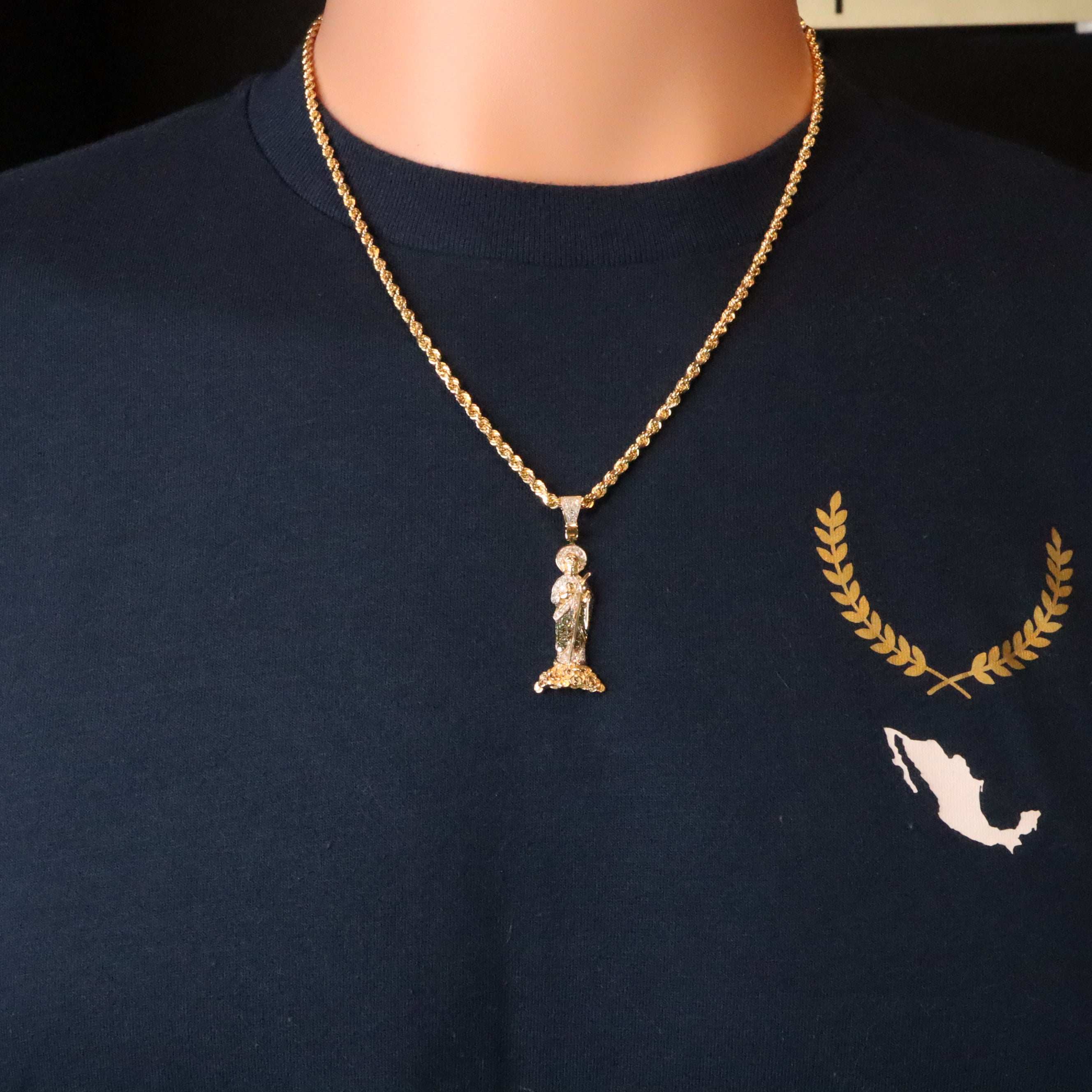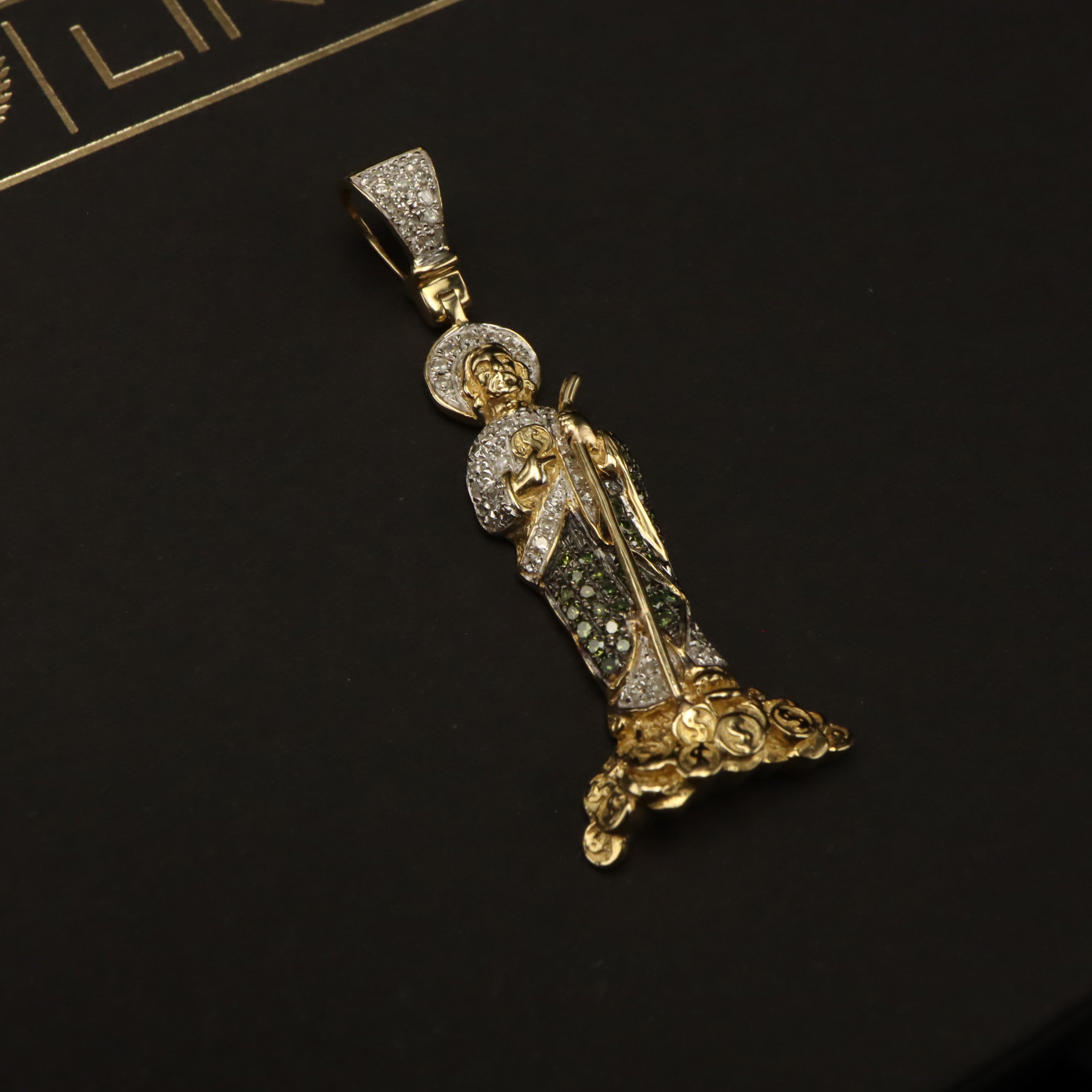 Experience divine protection with our Diamond San Judas pendant, adorned with .35 carats of natural diamonds crafted from luminous 14k gold. Featuring a mesmerizing array of white and green diamonds over a mountain of gold coins as a sign of good luck and wealth attraction.