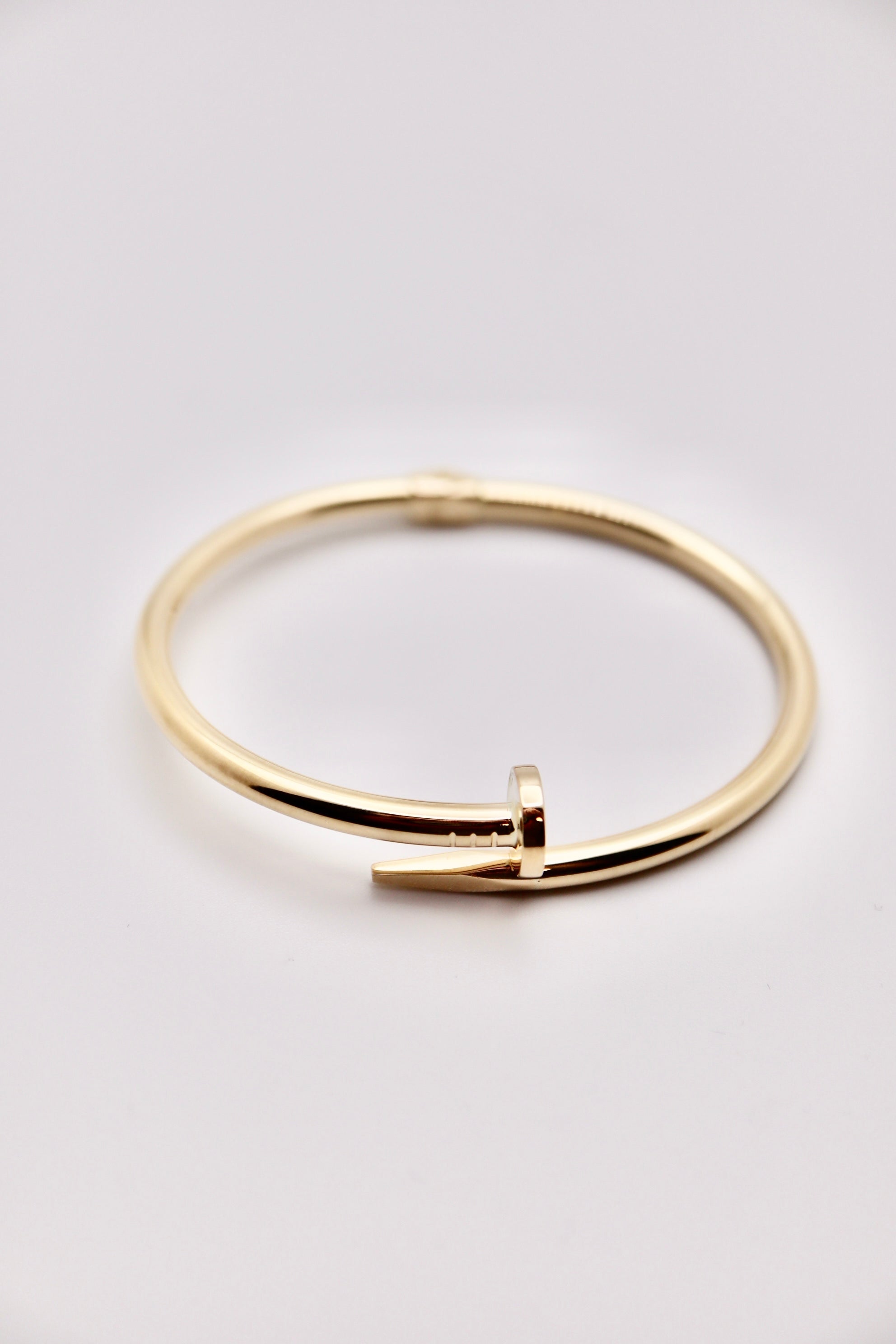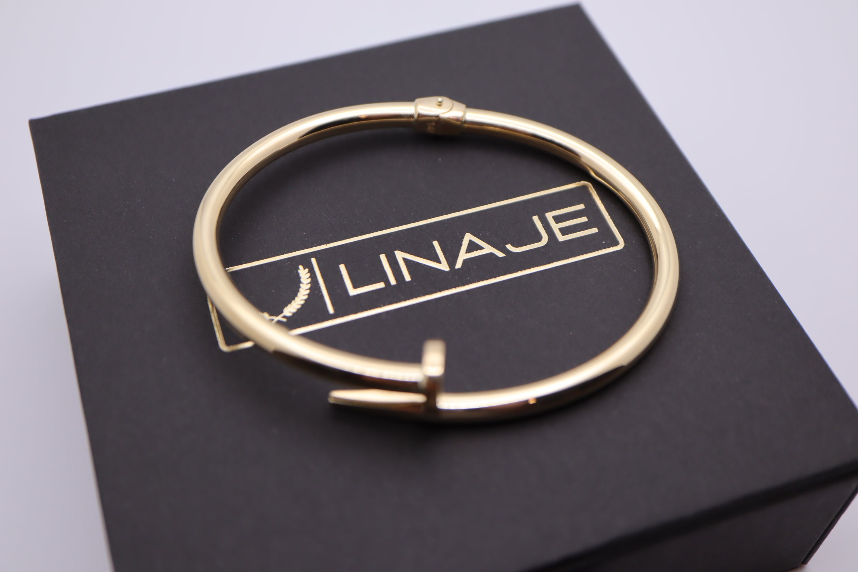 Crafted from premium 14k gold, this bracelet is designed to resemble a nail, with its sleek and modern look making it the perfect addition to any outfit. The attention to detail in its design is evident, and it's versatile enough to be worn with both casual and formal attire.