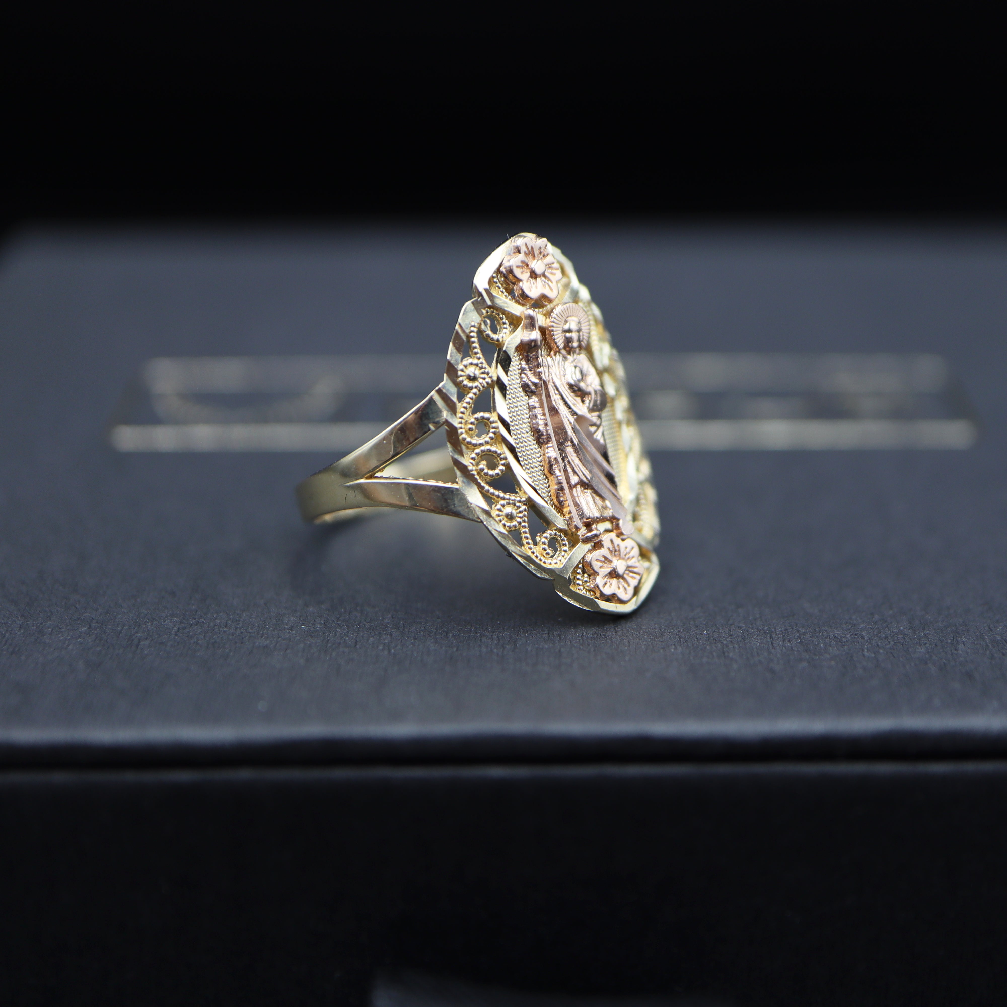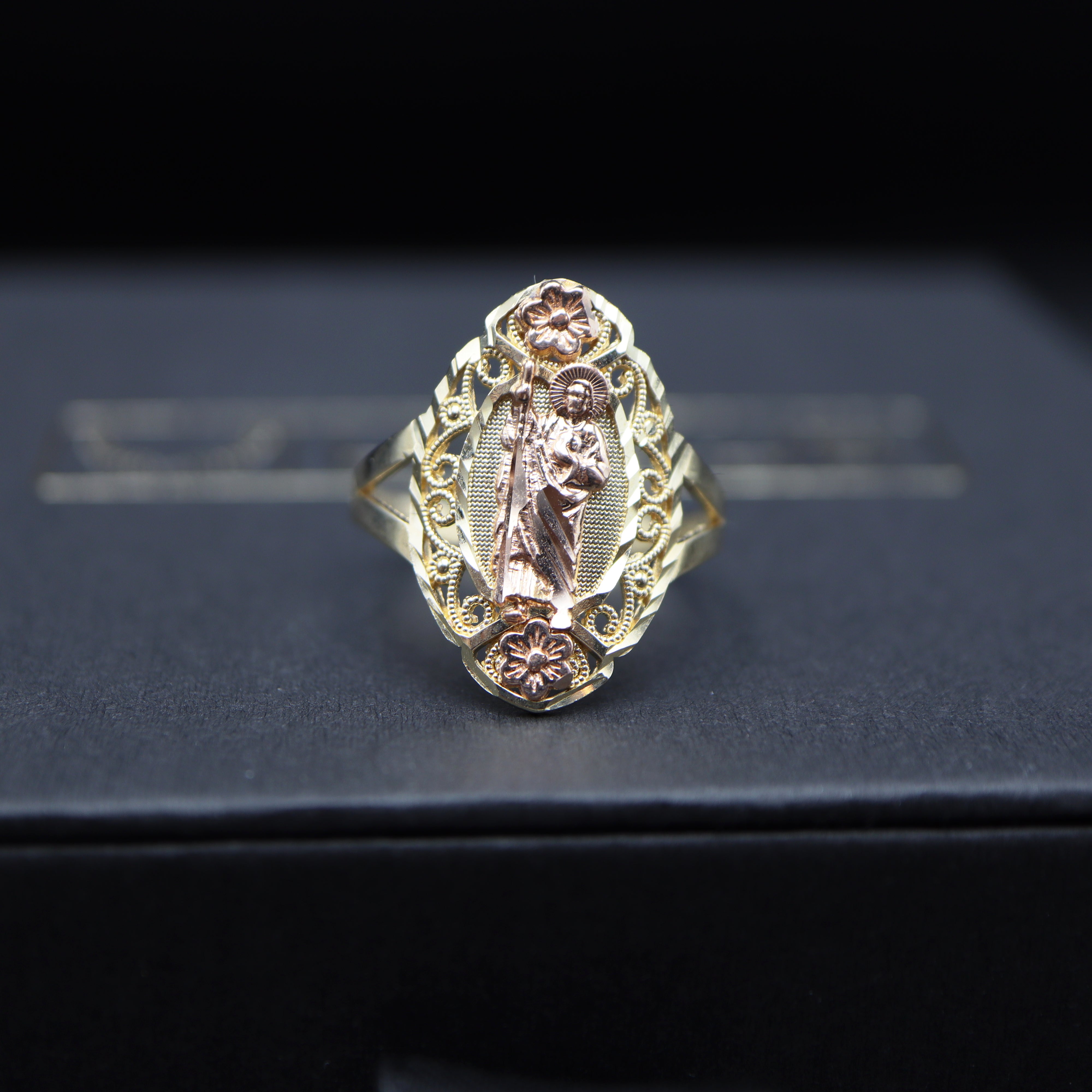Embrace the divine beauty of our San Judas Gold Ring—an exquisite expression of faith and floral elegance.