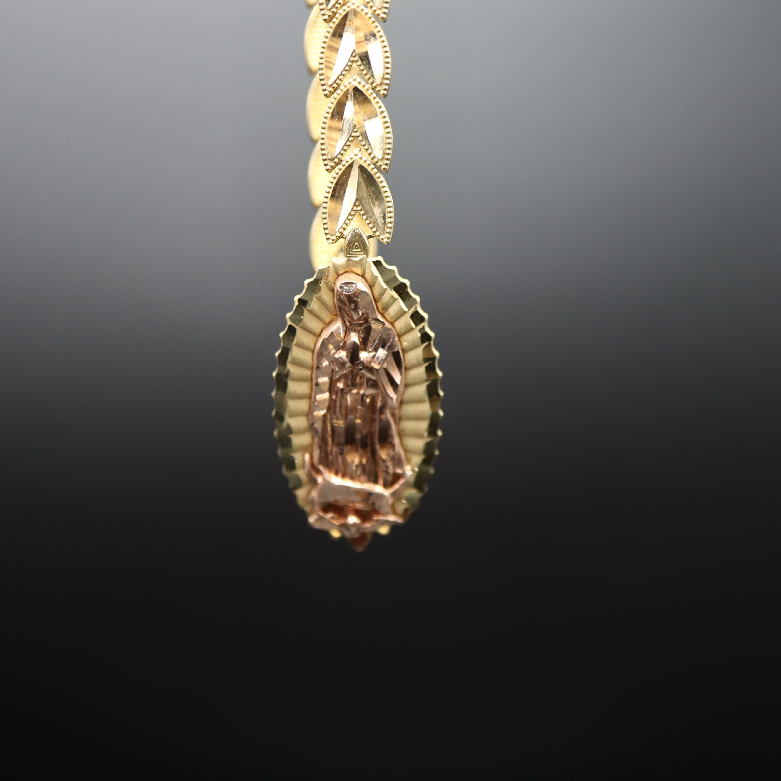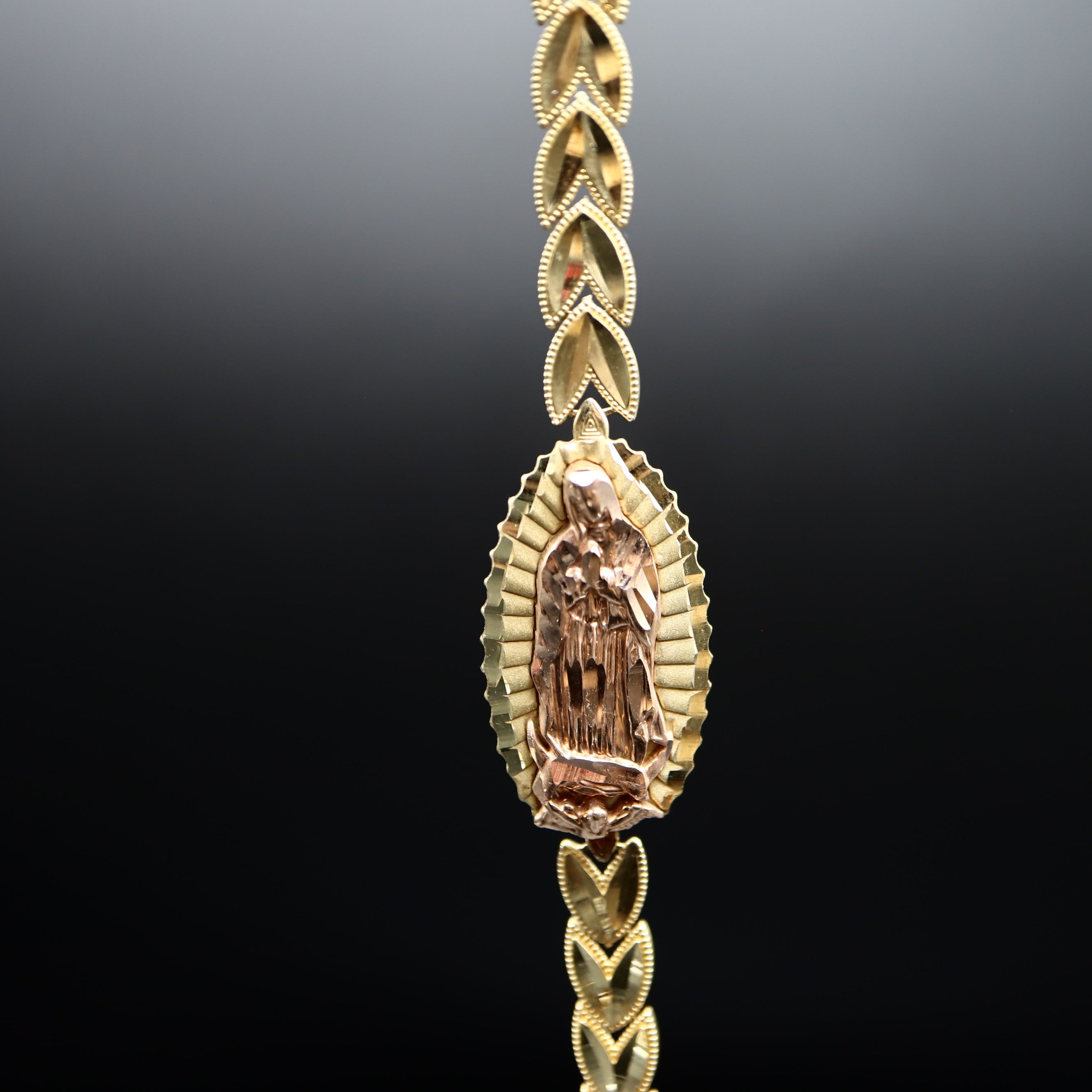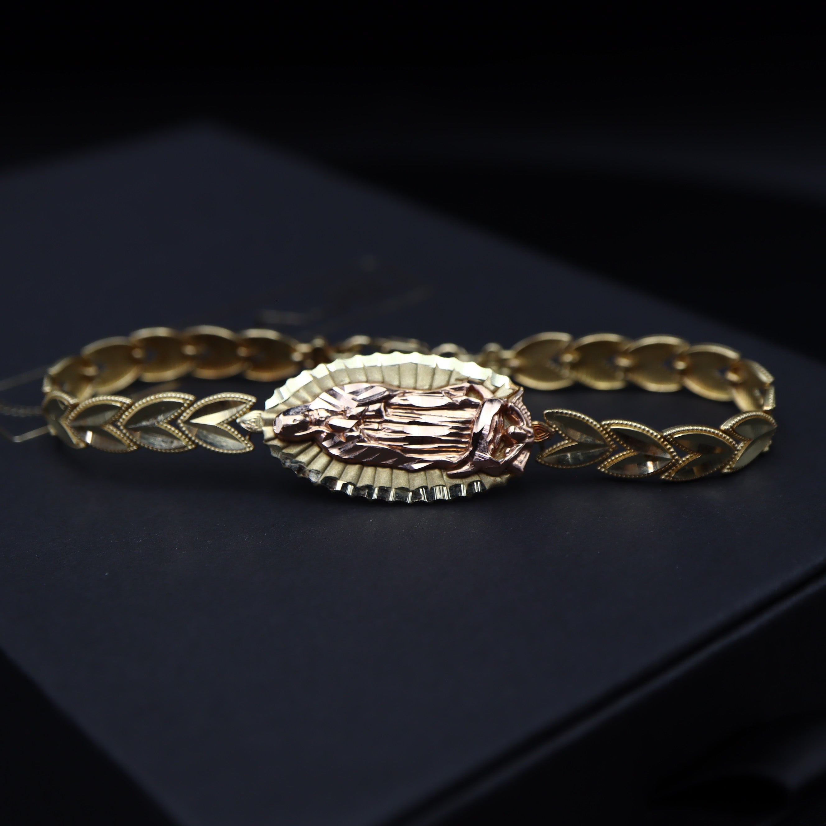 Introducing our 14k Gold Virgen de Guadalupe Bracelet, a divine fusion of faith and elegance. This exquisite piece features the iconic Virgen de Guadalupe in Rose Gold in the center, embraced by a heart-shaped band in yellow gold.