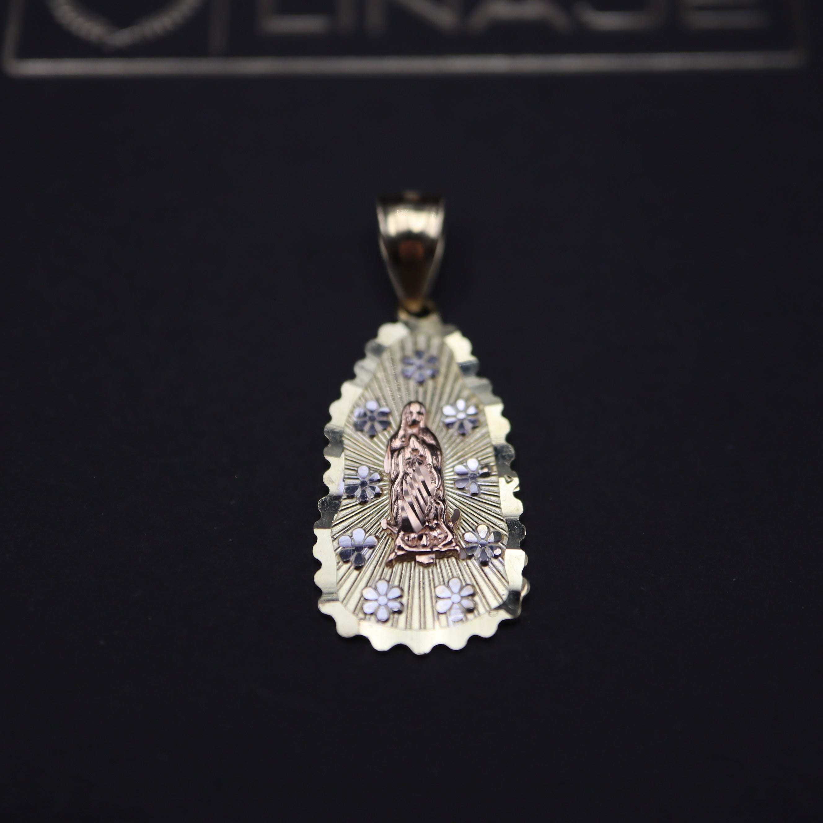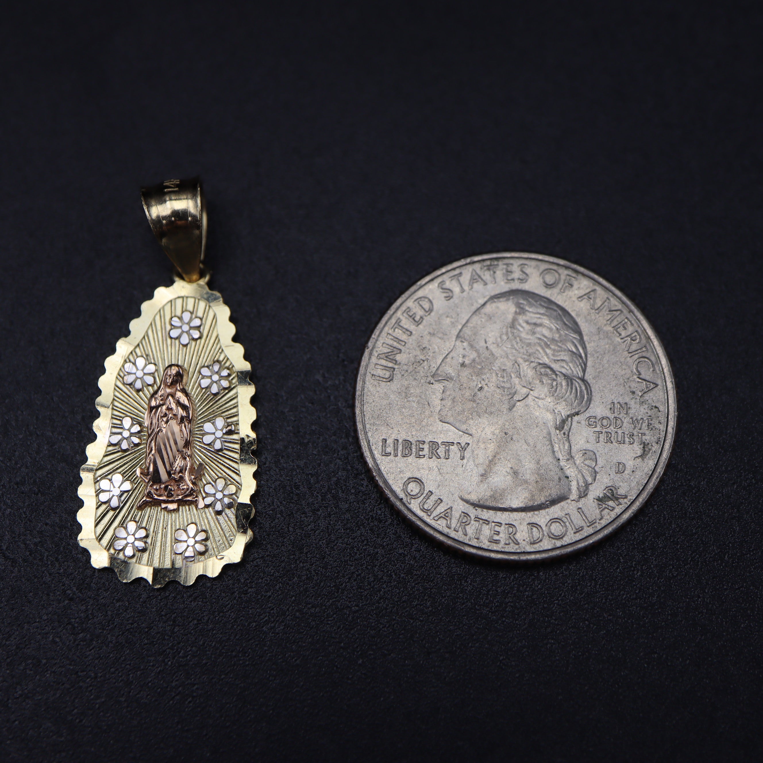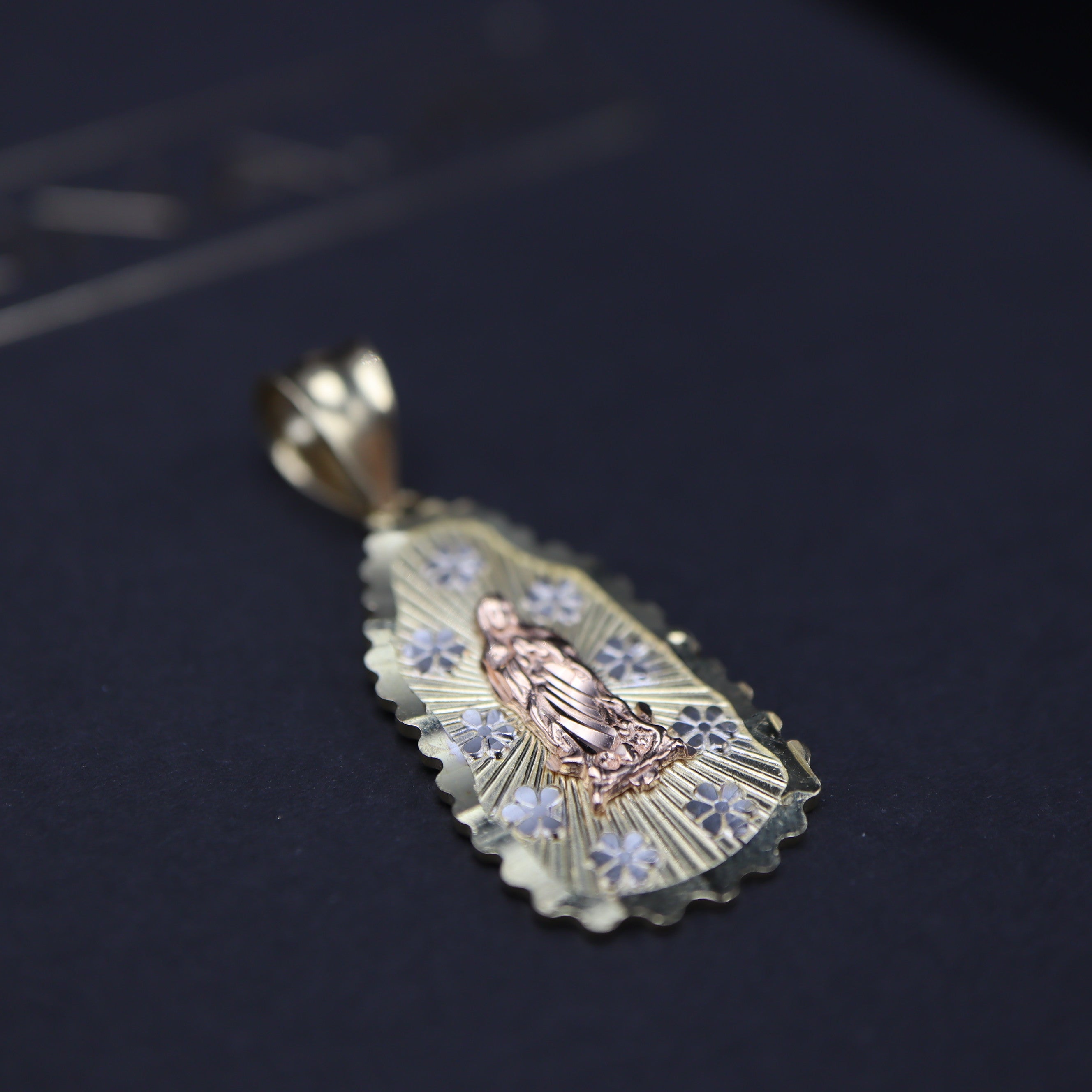 Discover divine beauty with our 14k Gold Virgencita Pendant adorned with an exquisite floral pattern. Meticulously crafted, this pendant captures the grace of La Virgencita in radiant 14k gold, blending spirituality with timeless elegance. The delicate floral design adds a touch of sophistication, making it a cherished symbol of faith and natural beauty.