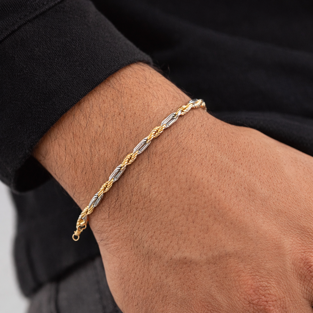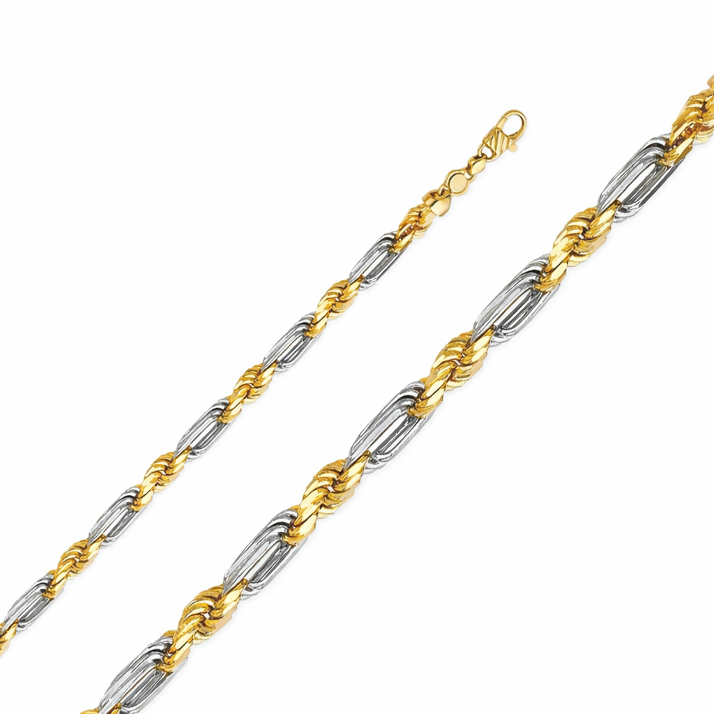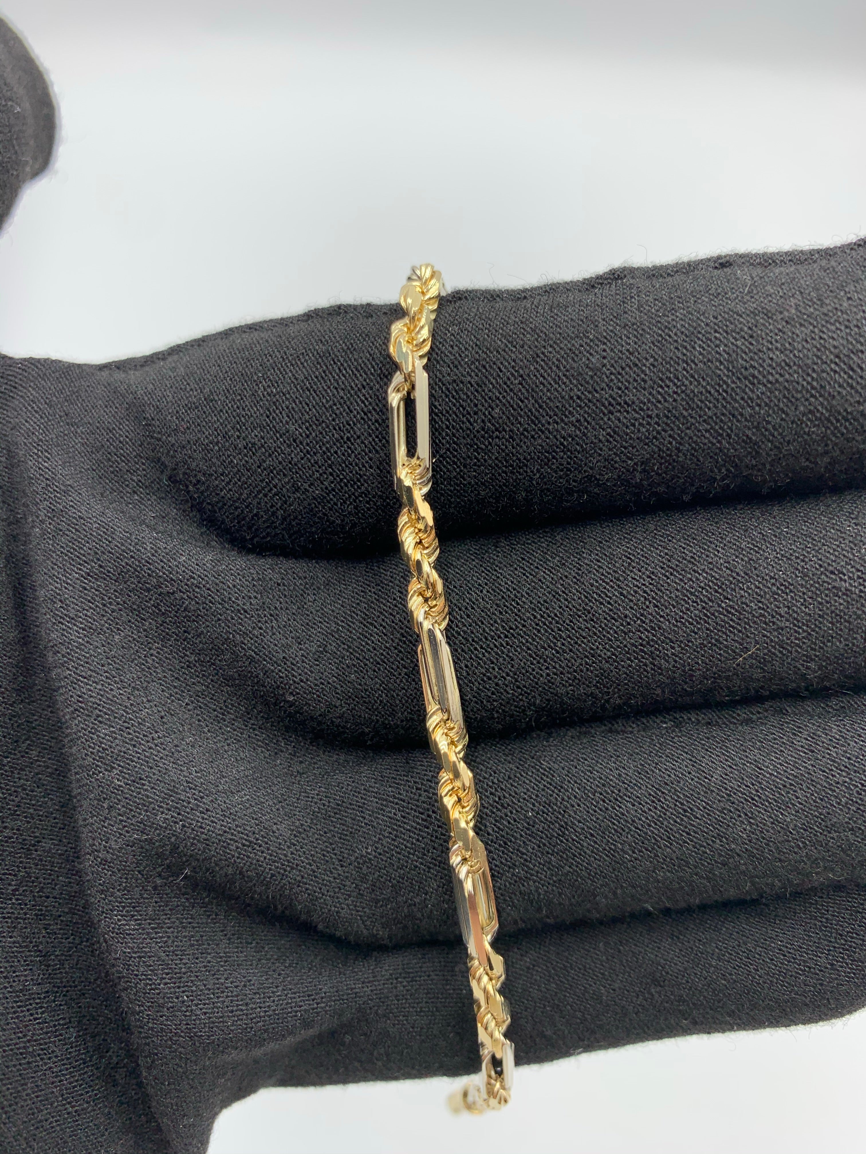Incredible handmade design that combines the figaro and rope designs. This piece features a two-tone design in white and yellow 14K REAL gold NOT gold plated. It also has a very secure lobster clasp with a smooth mechanism. This piece weighs 9.12 grams of solid gold and is 3.5mm thick. Hand made in Italy by the best jewelry designers this is a piece you will enjoy for a lifetime. This Bracelet will catch a lot of attention and is a must for your gold collection.