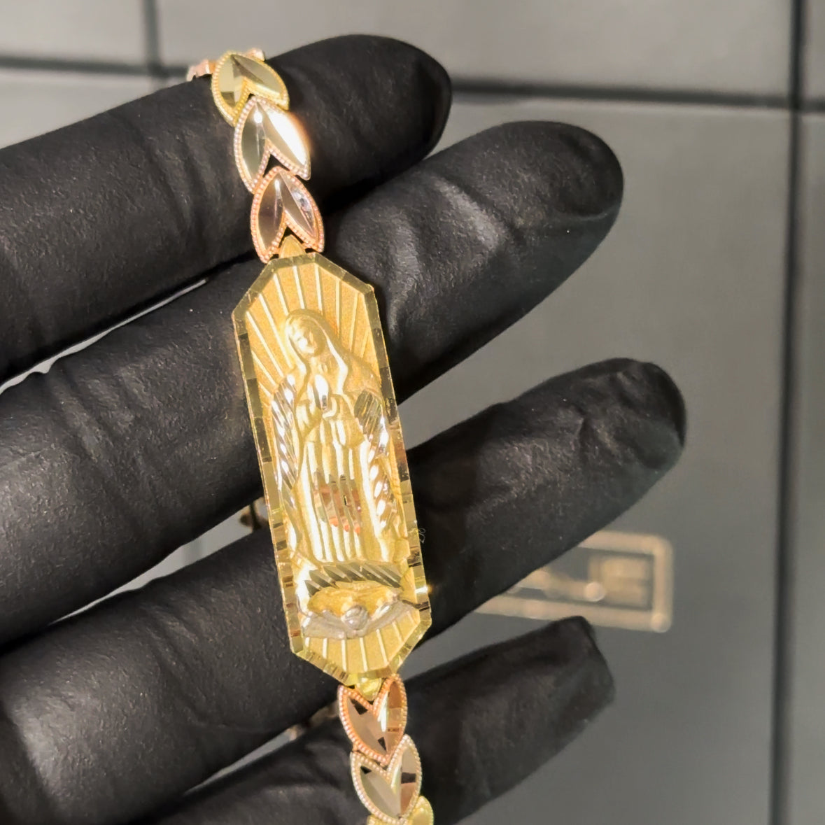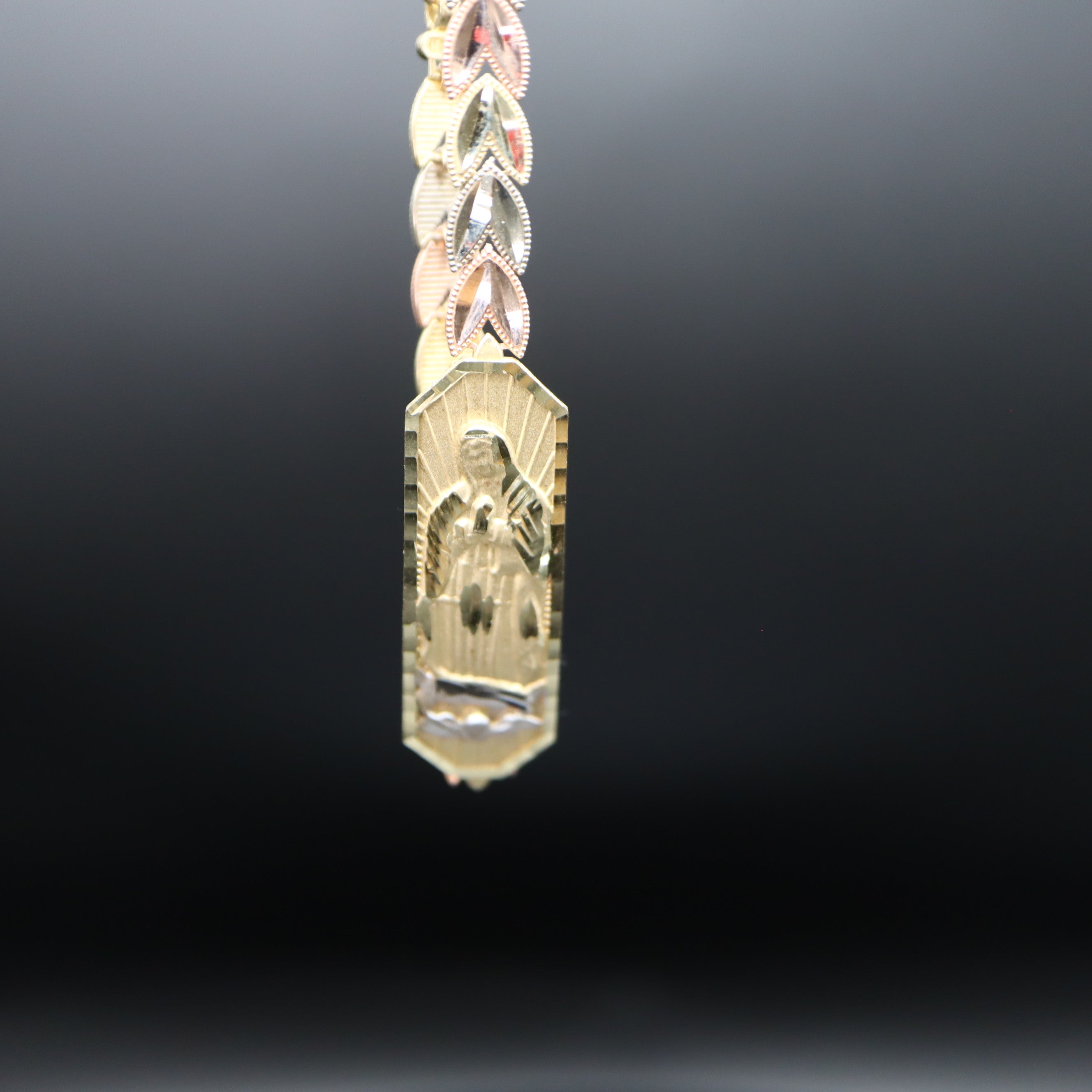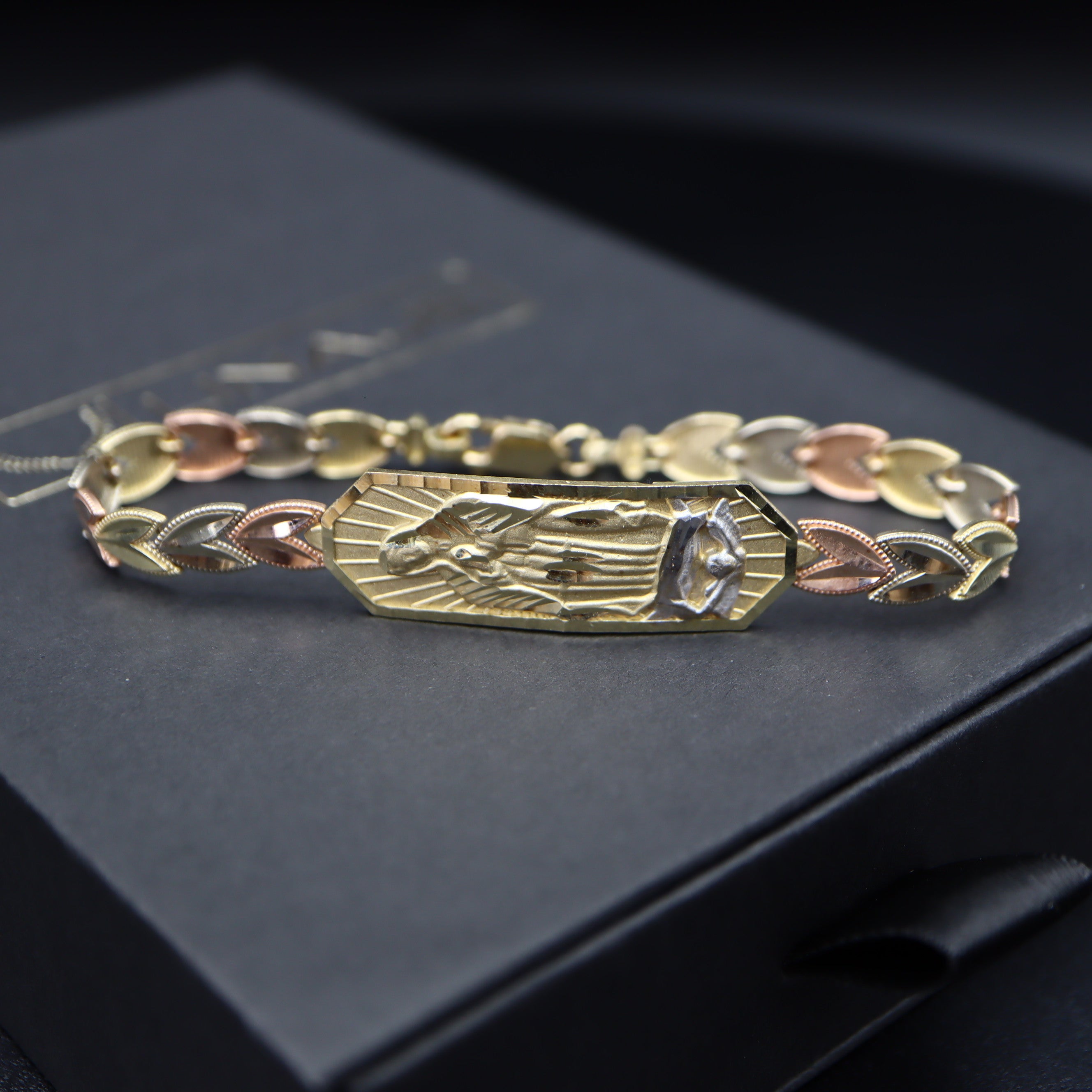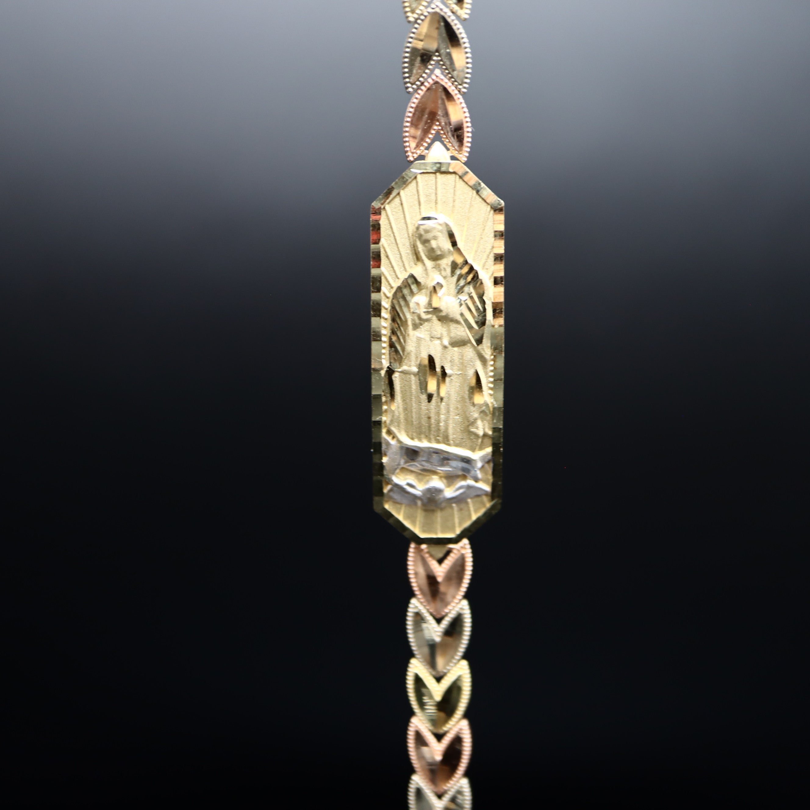 Introducing our 14k Gold Virgen de Guadalupe Bracelet, a divine fusion of faith and elegance. This exquisite piece features the iconic Virgen de Guadalupe in the center, embraced by a heart-shaped band crafted from three hues of gold – rose, white, and yellow.