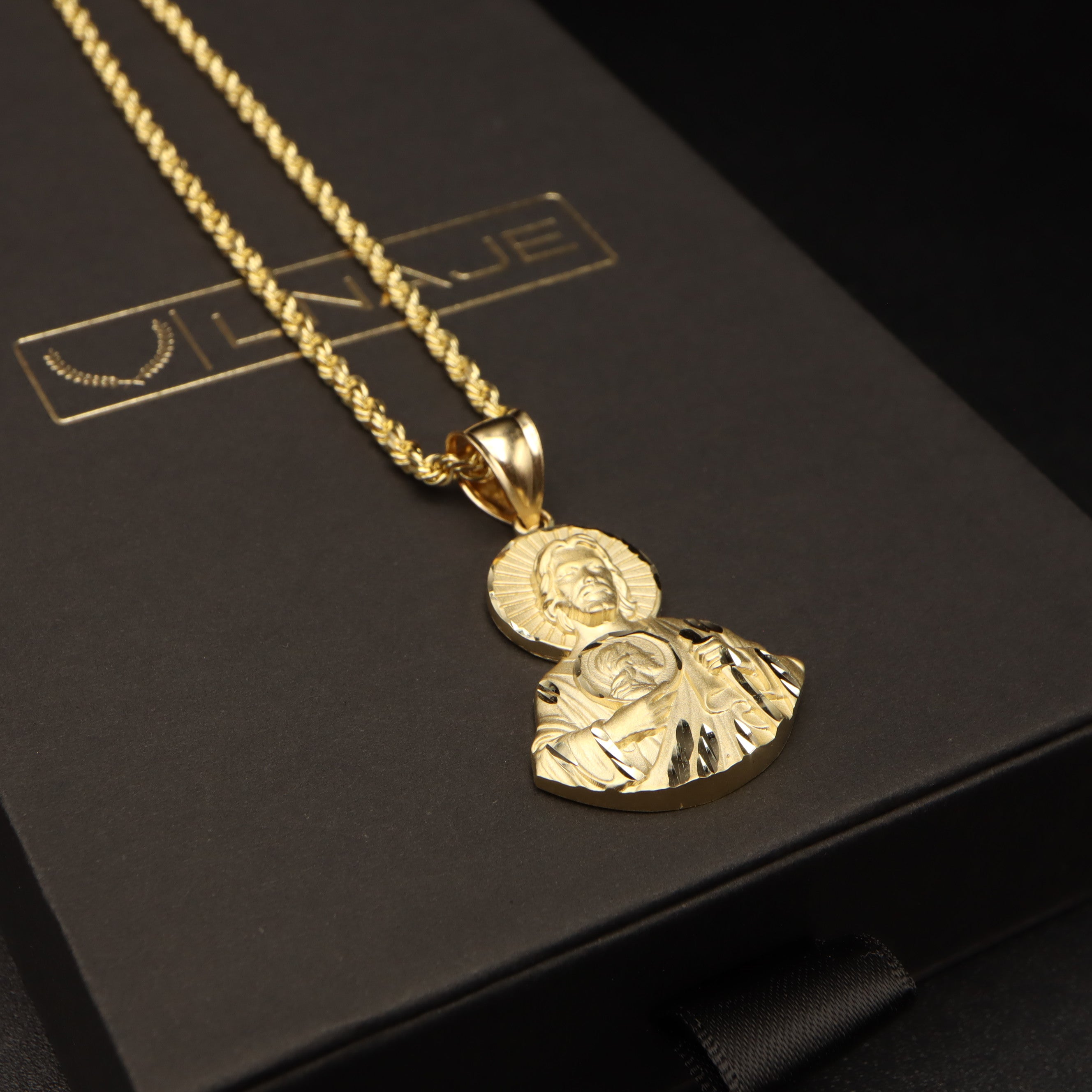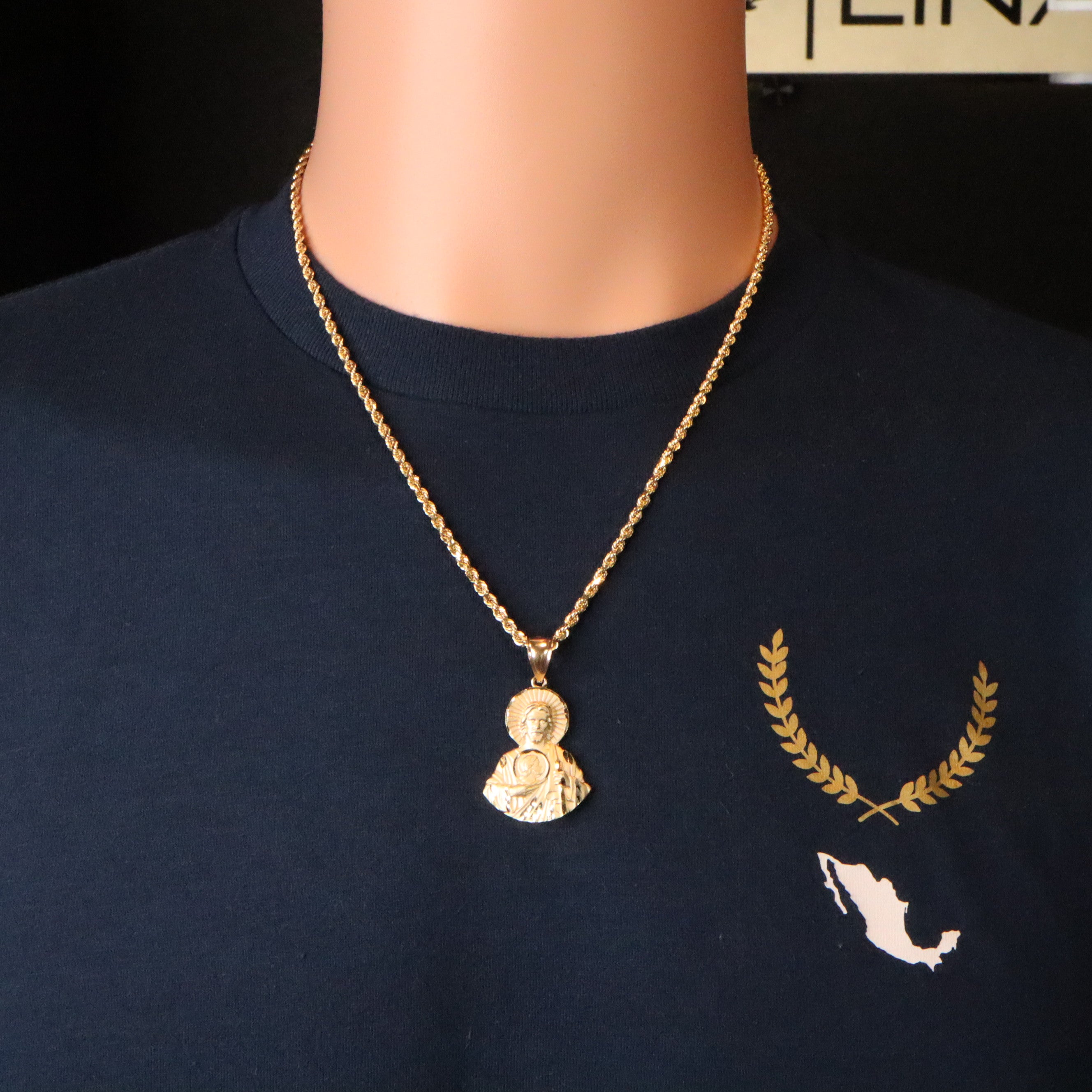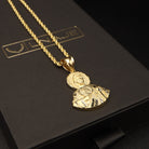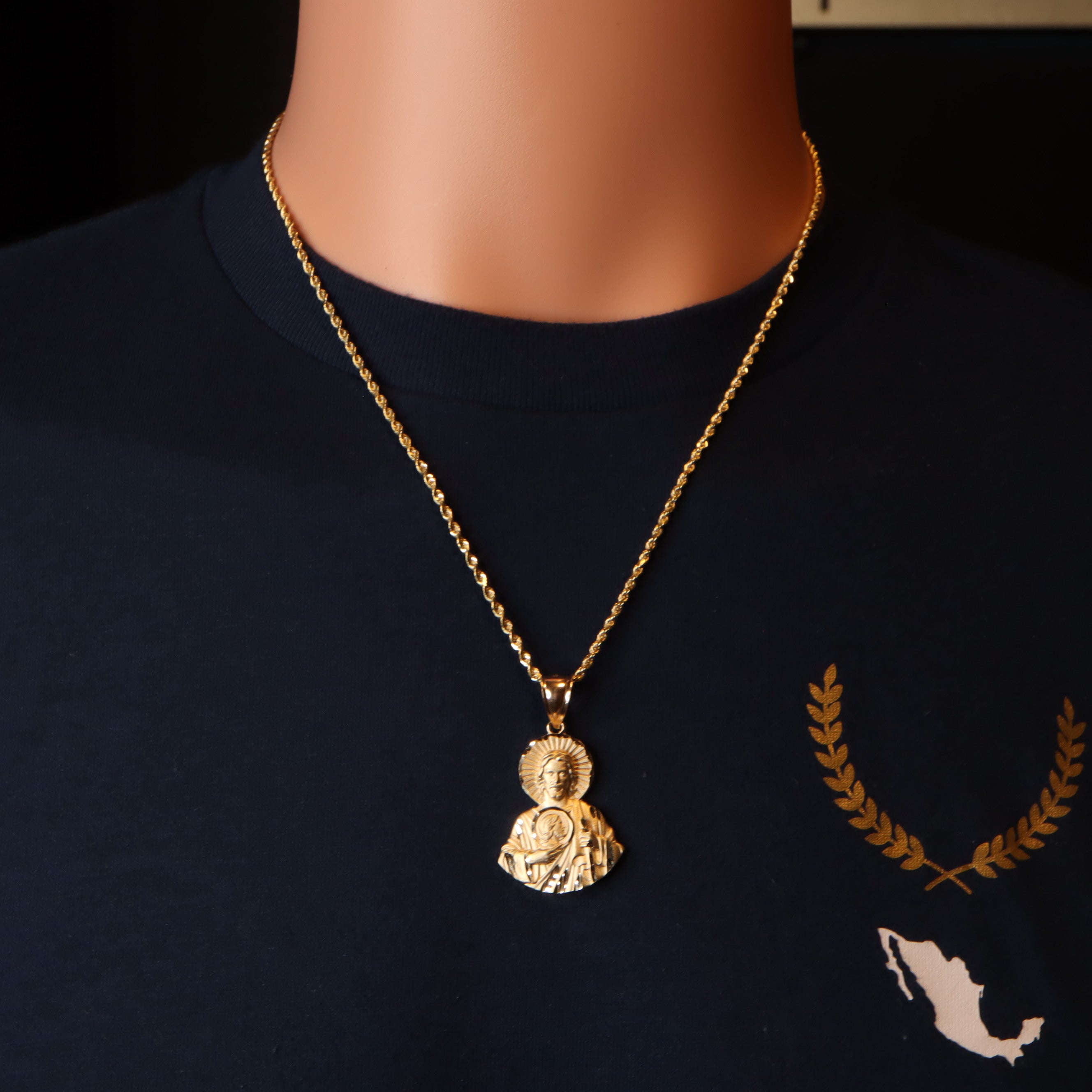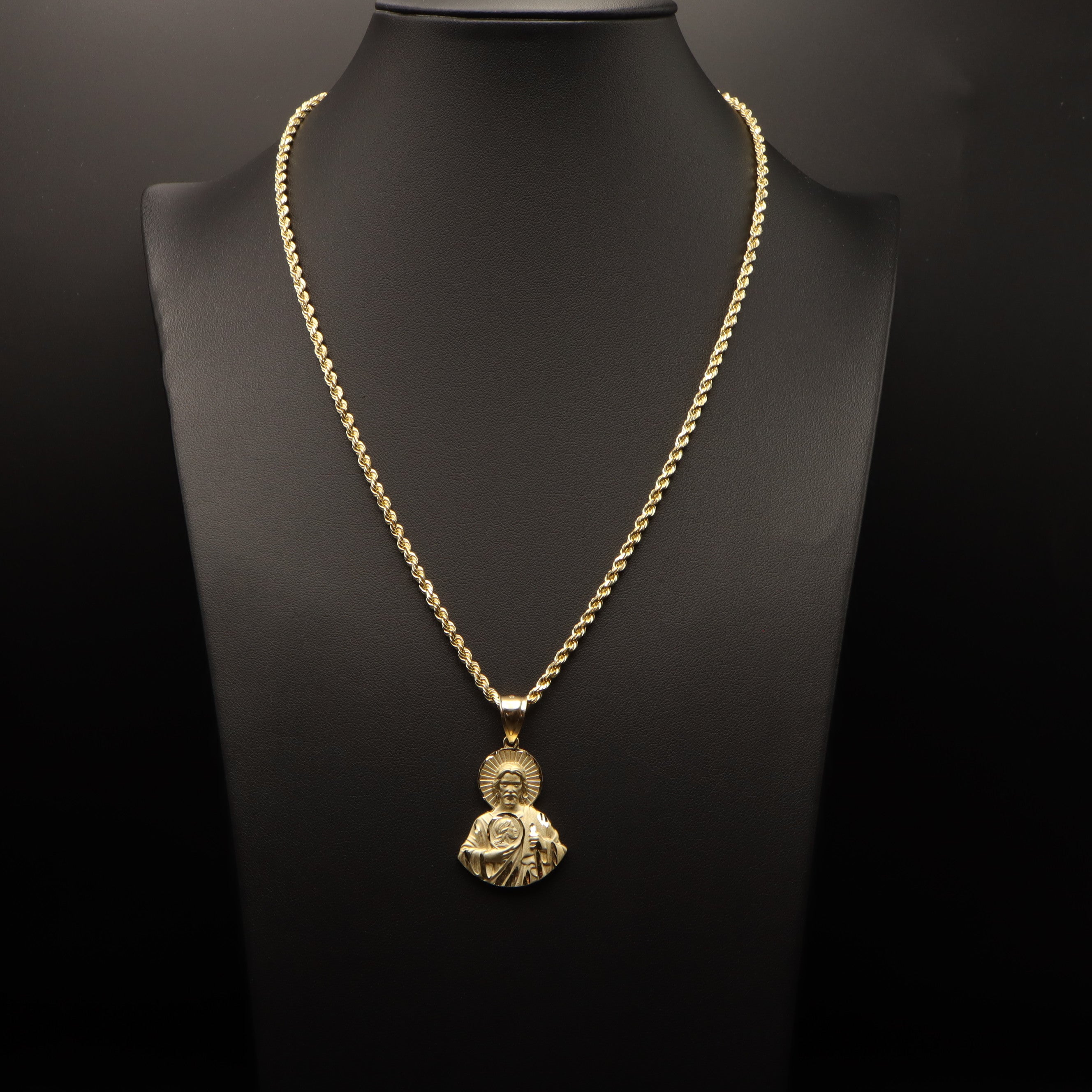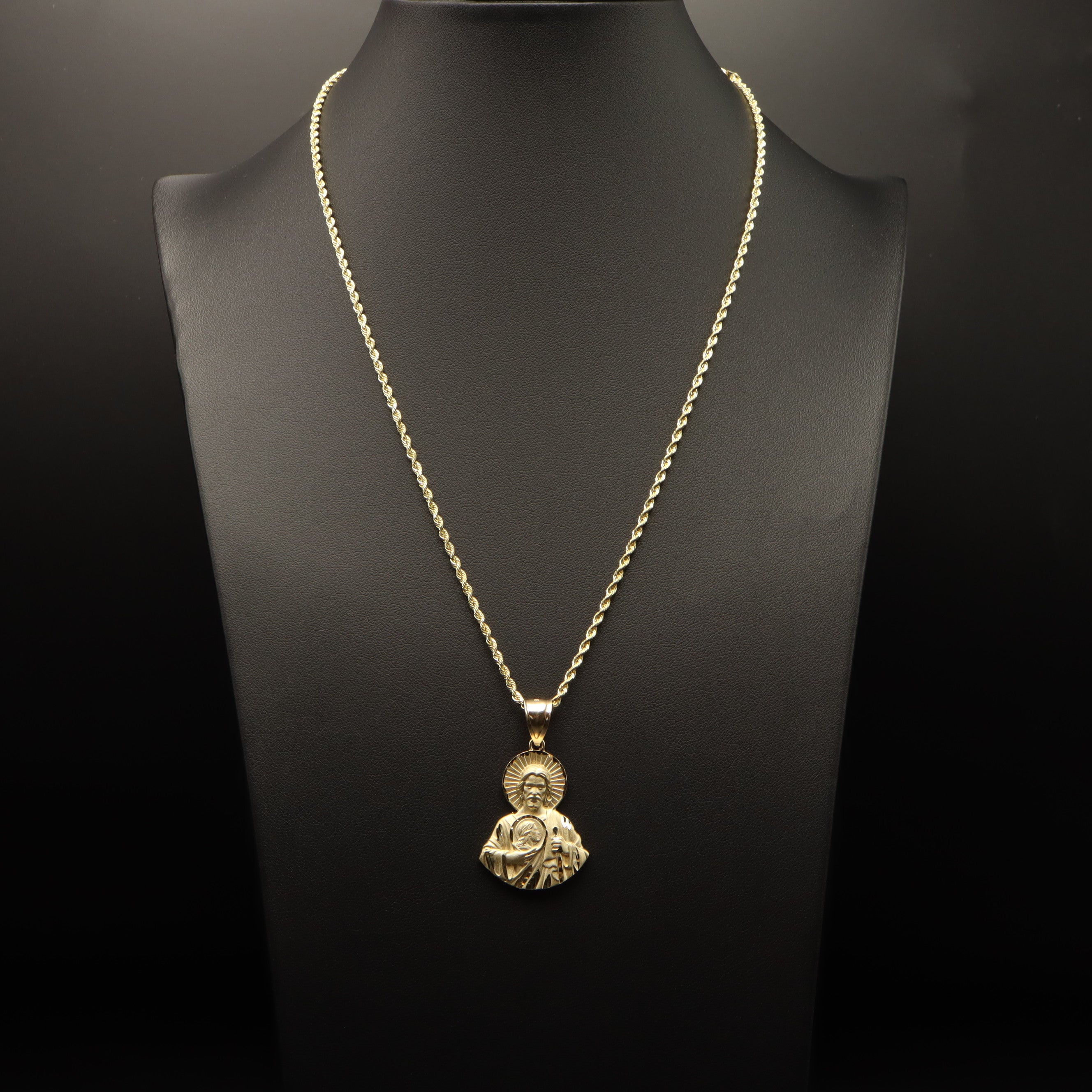 Elevate your faith with our exquisite half-body San Judas pendant, meticulously crafted from radiant 14k gold. Paired with a luxurious 14k gold rope chain, available in your choice of 2mm or 3mm thickness, this set offers a timeless symbol of devotion and style. Choose your preferred chain size and save money by buying in bundle.