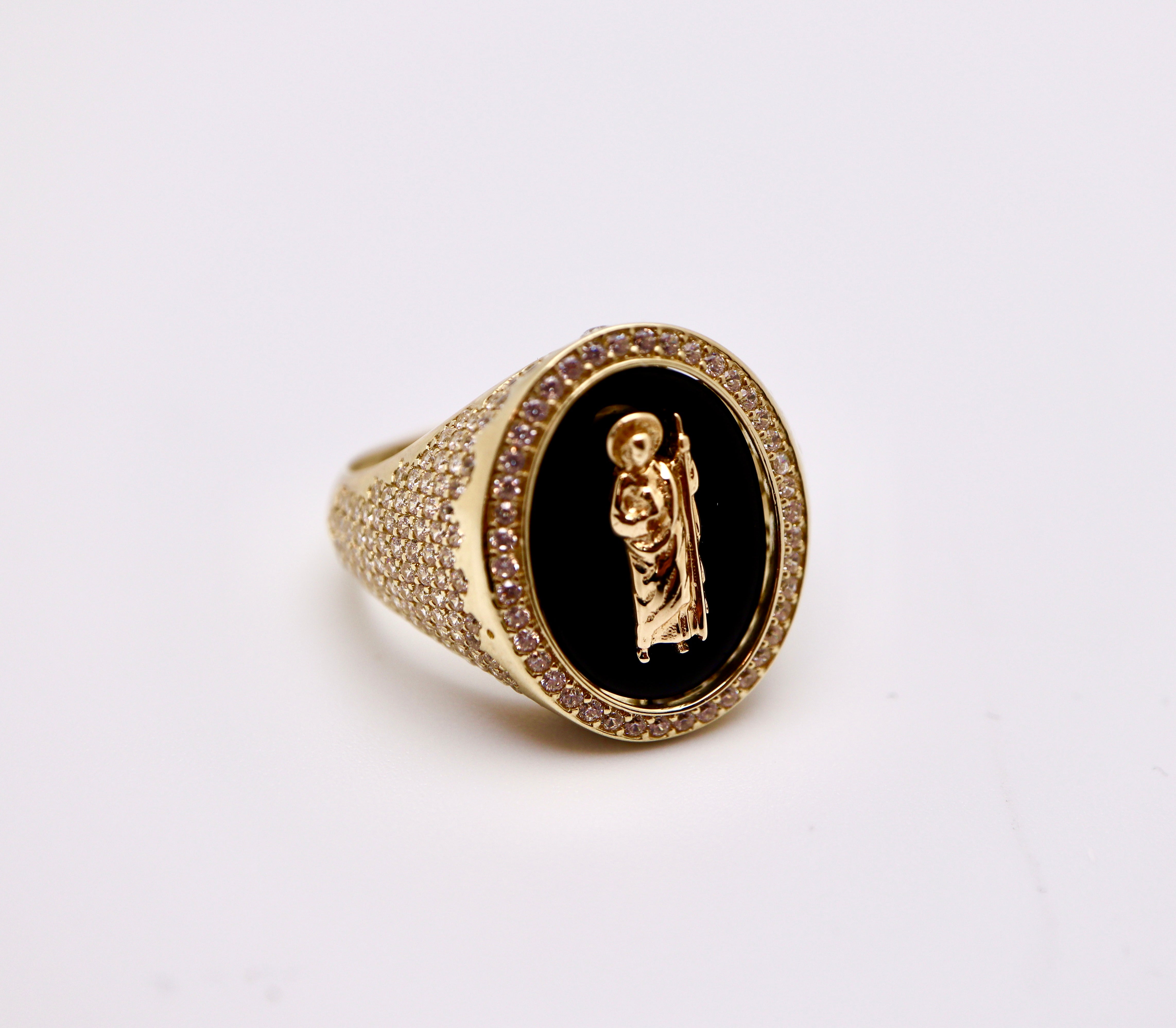 San Juditas ring made from 10 Karat gold and featuring encrusted Cubic Zirconias.