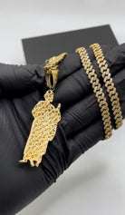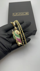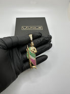 Dije de San Juditas hecho de oro 14 kilates con tres colores de zirconias. Esta pieza mide 2.75 pulgadas.