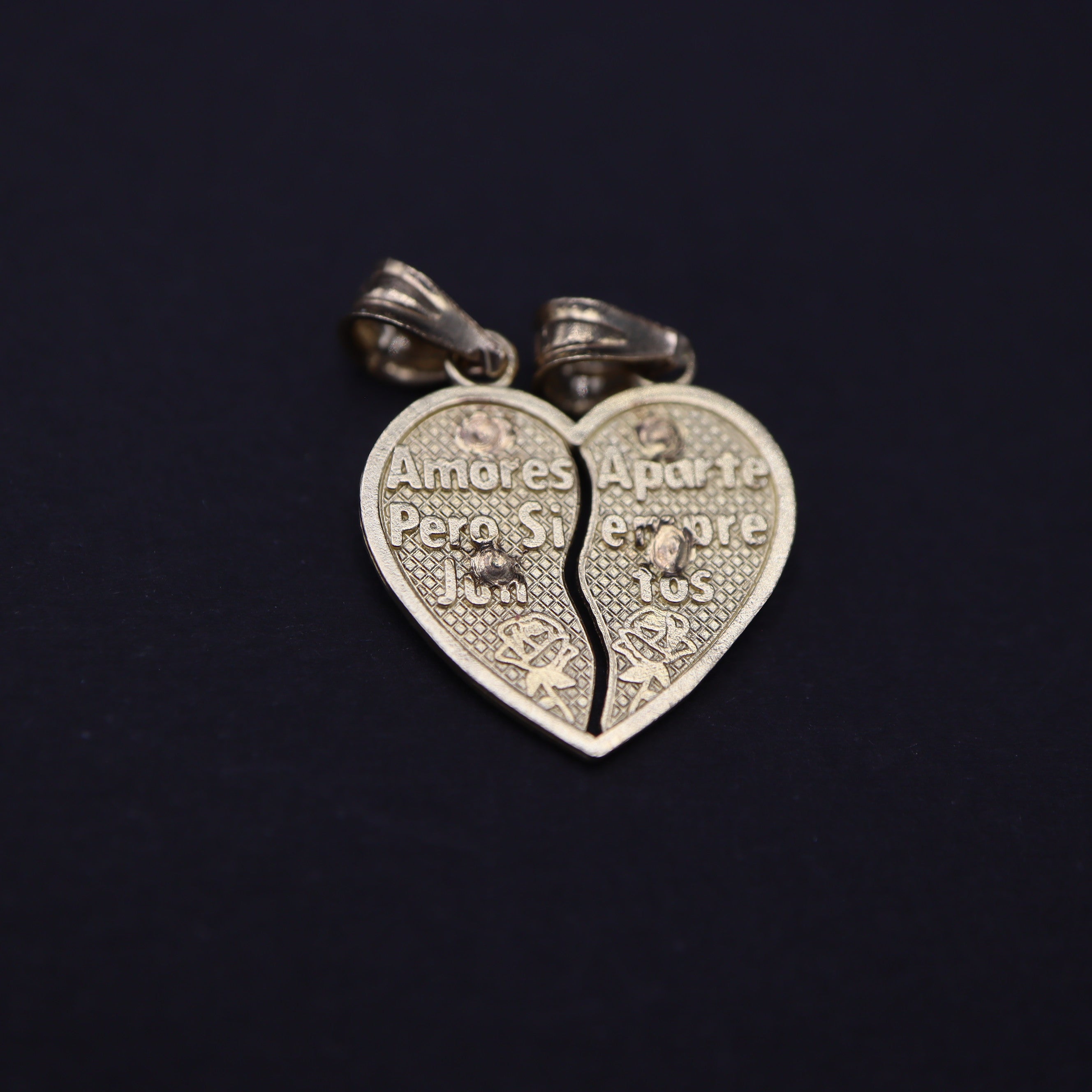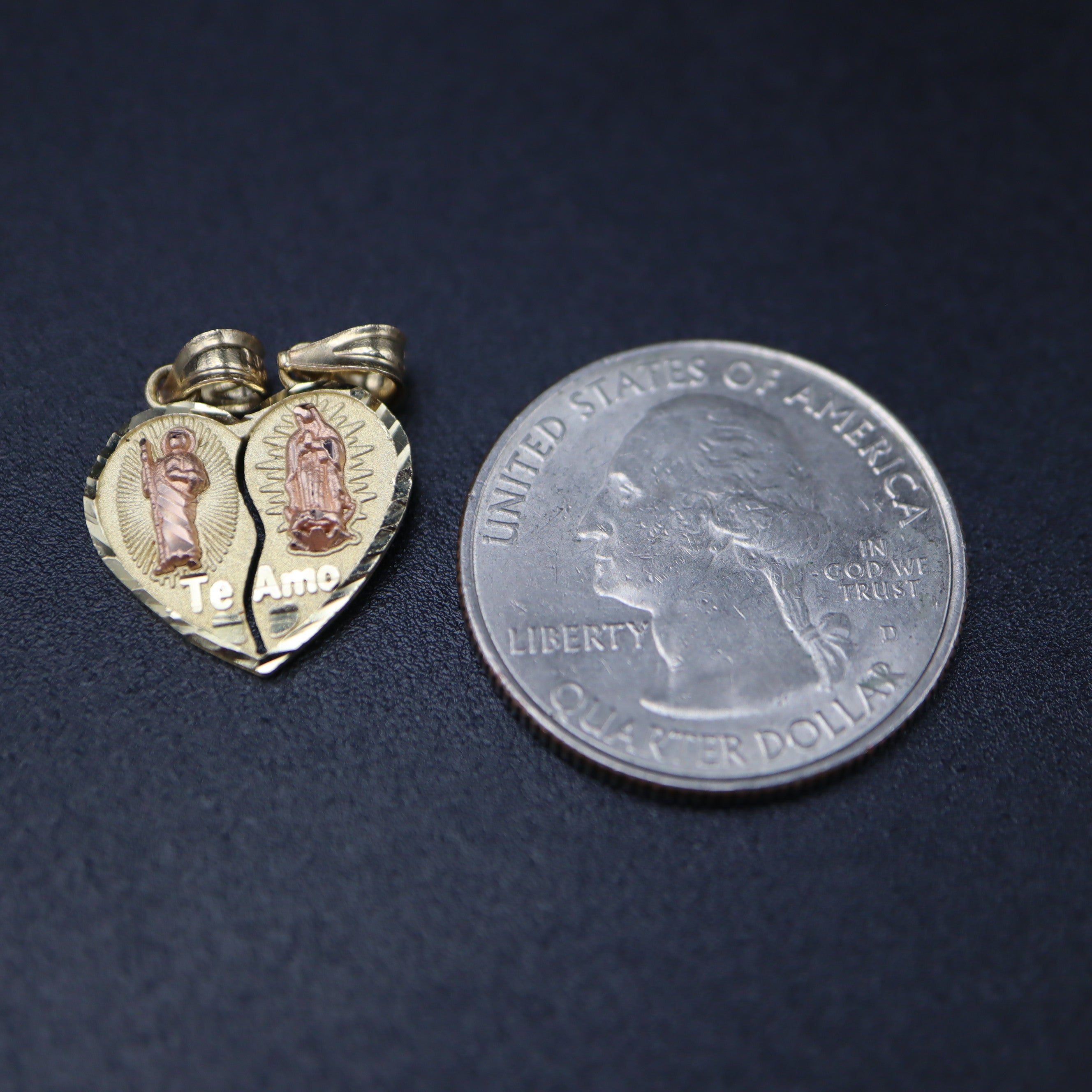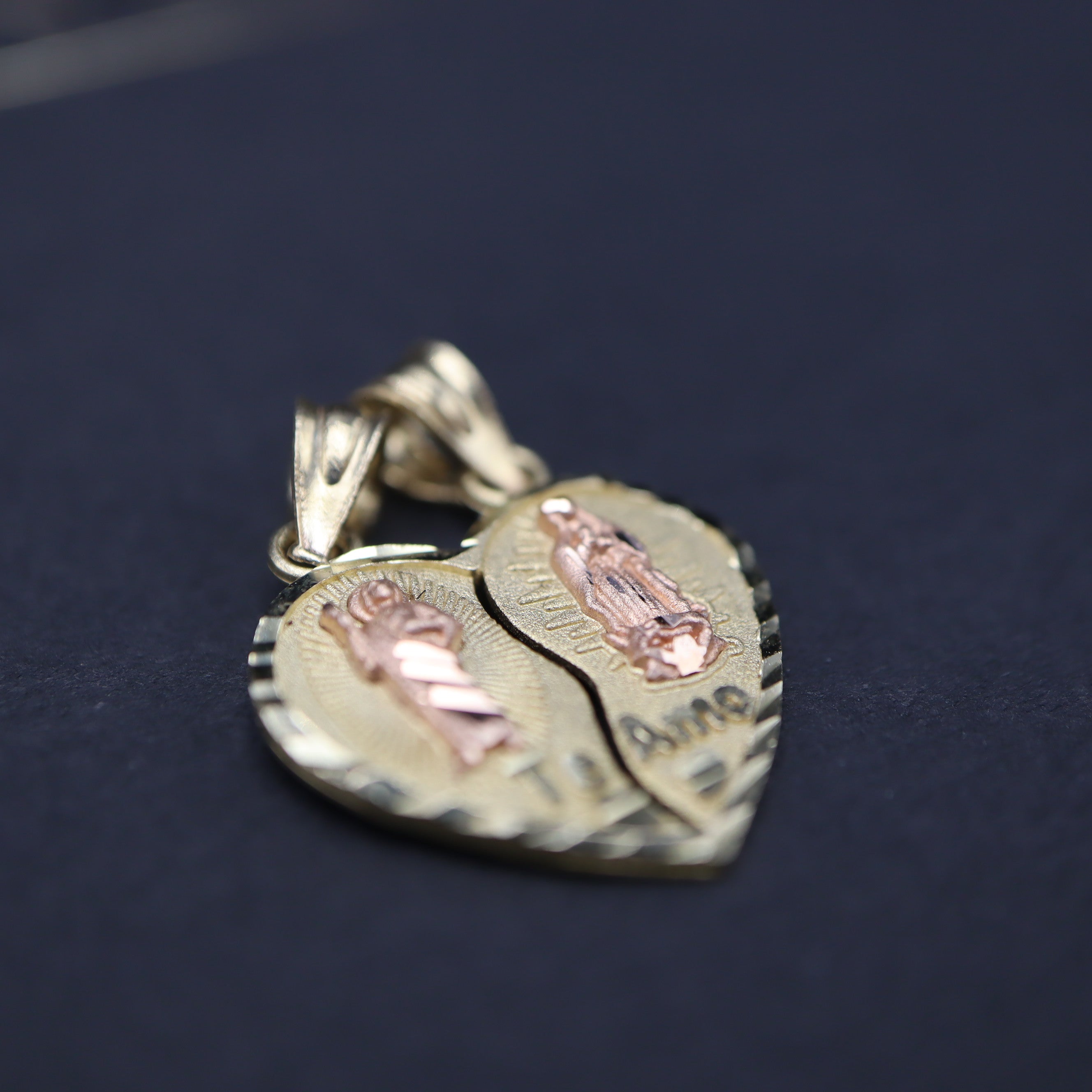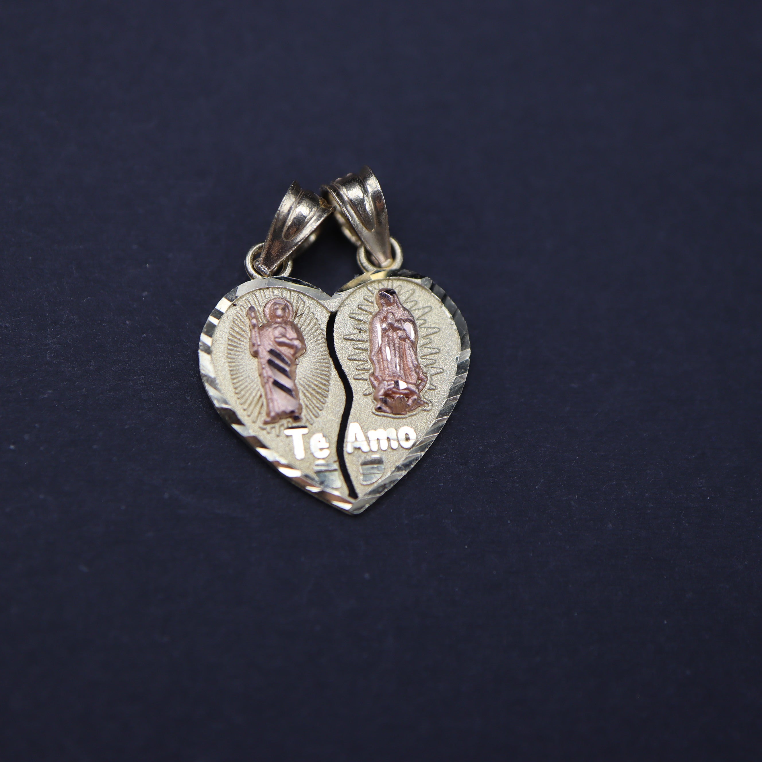 Experience the union of faith and love with our 14k Gold Heart-Shaped Breakable Pendant. Crafted with devotion, one side features the revered San Judas, while the other side showcases the Virgen de Guadalupe. This unique piece beautifully intertwines divine grace and heartfelt affection. The pendant delicately separates into two halves, symbolizing the shared bond of two hearts. Embrace the sentiment with the words 'Te Amo' inscribed, making this pendant not just a symbol of faith but also a testament to enduring love in radiant 14k gold.