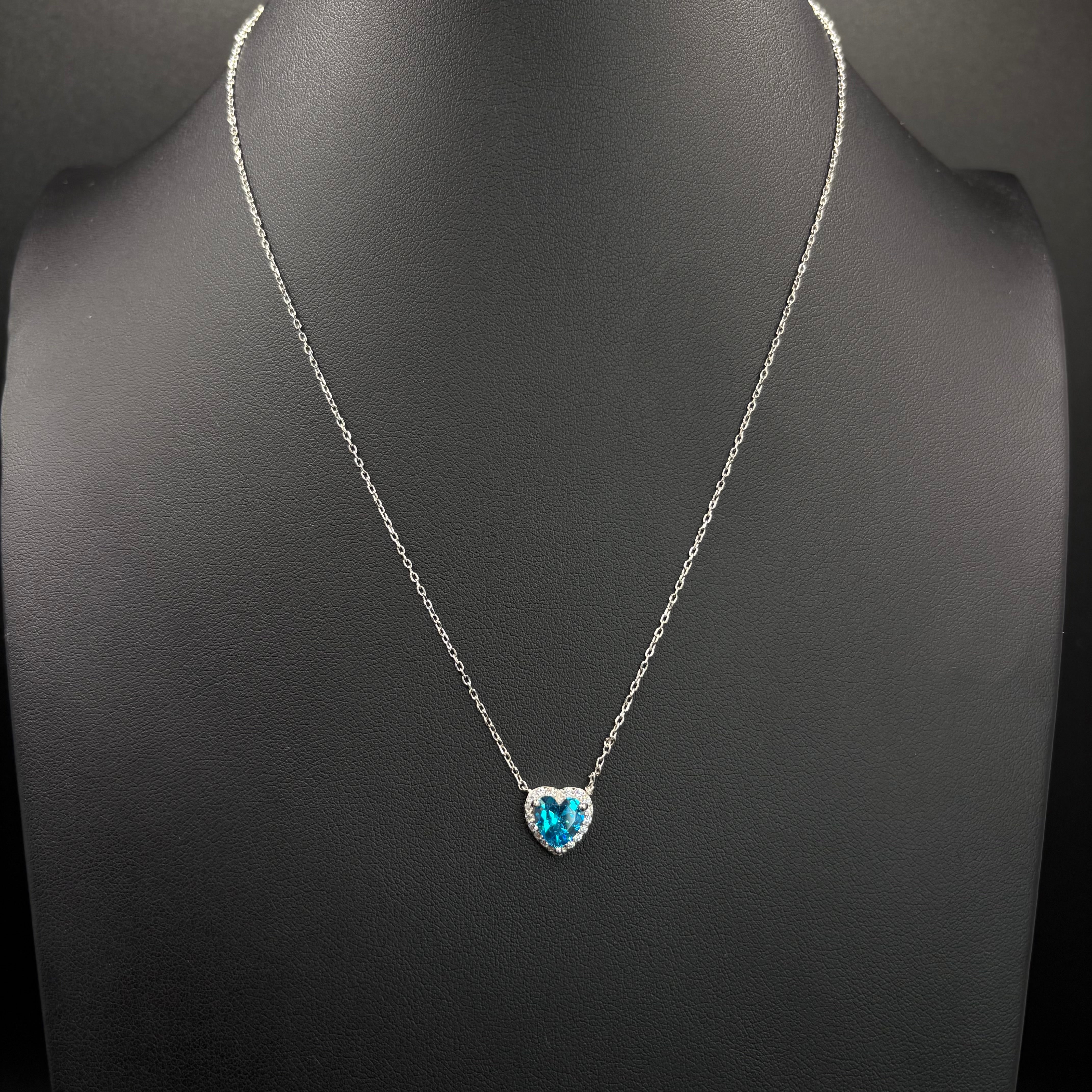 Sterling Silver Blue Topaz & Clear CZ Heart Halo Necklace – .925 Silver, Rhodium Finish