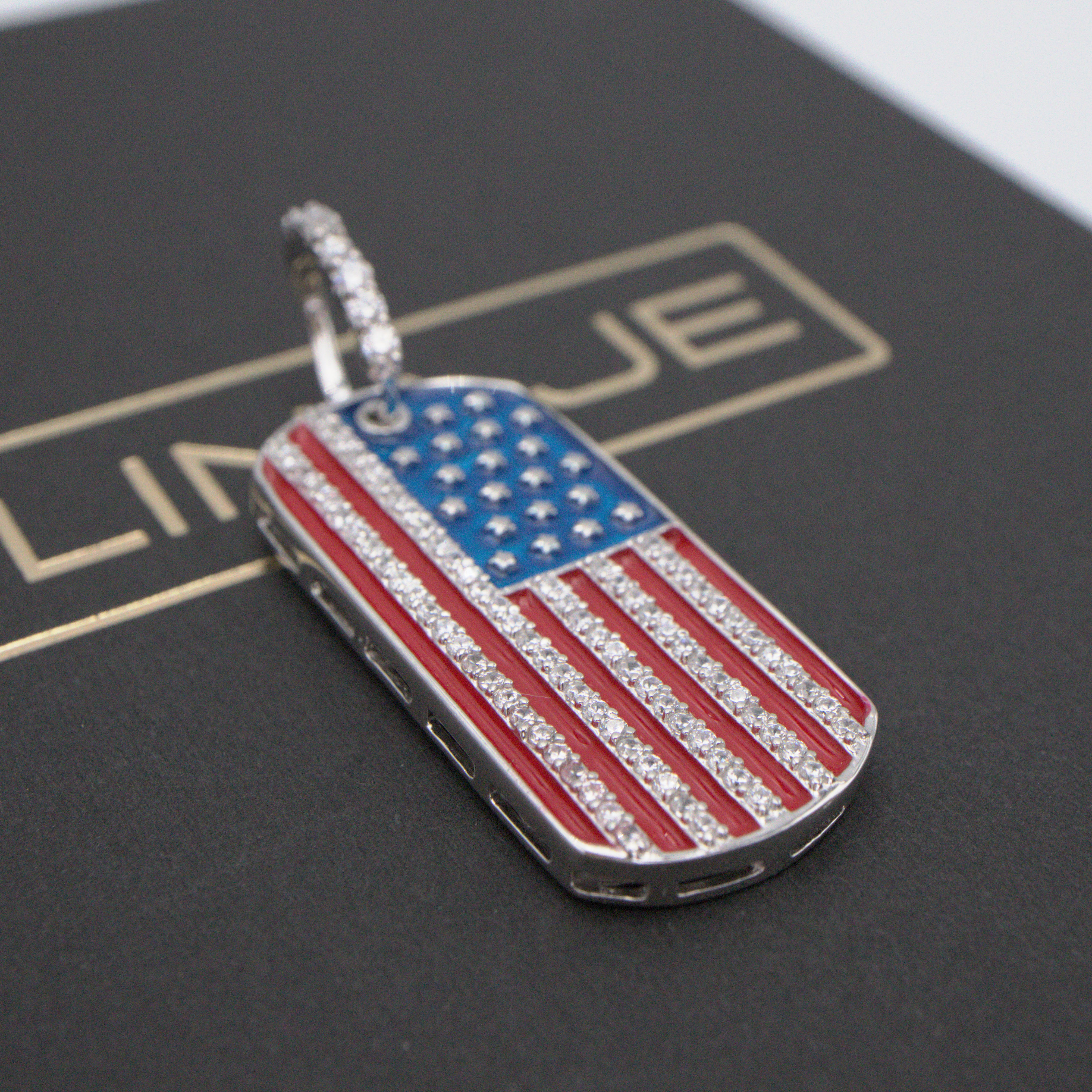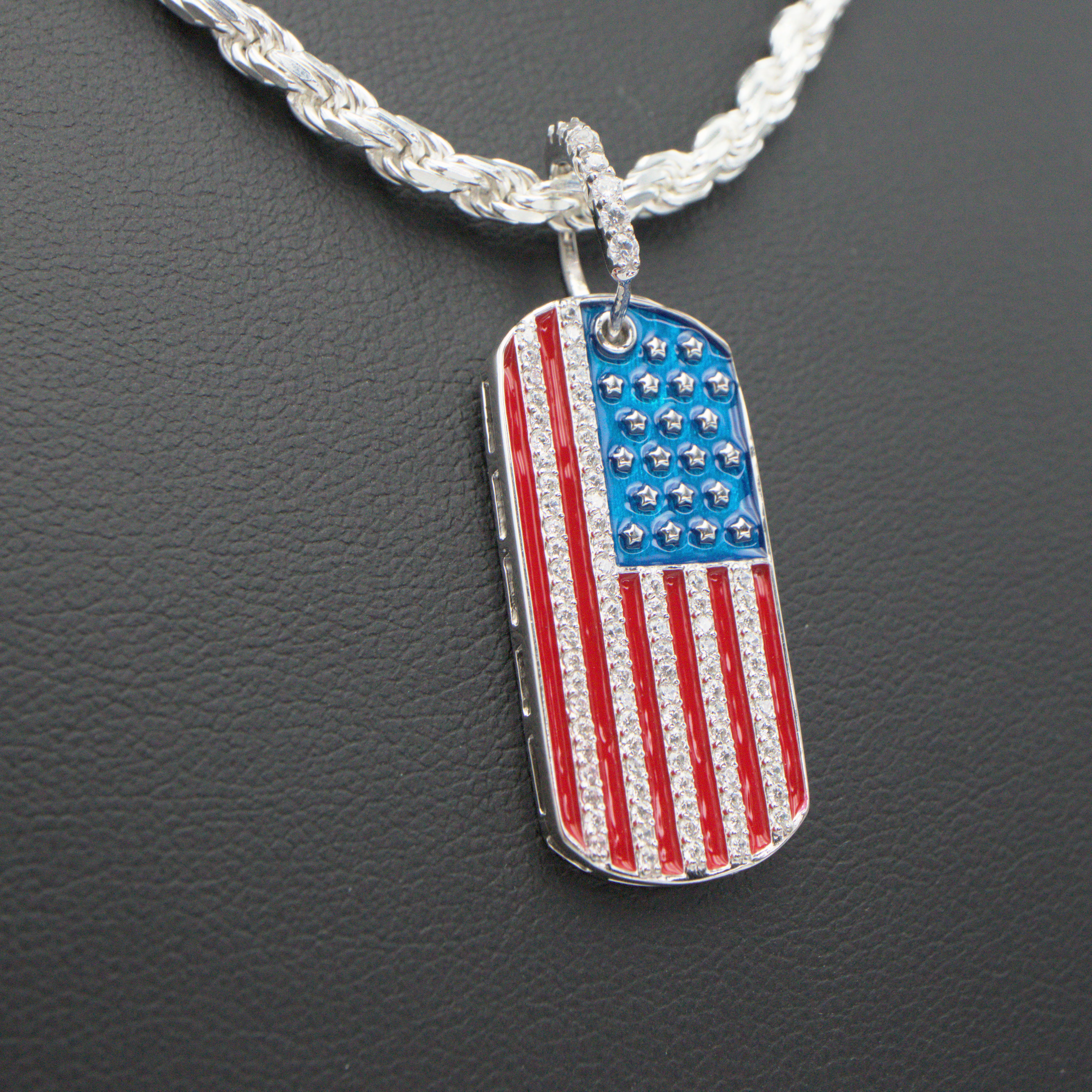 Showcase your patriotic spirit with our USA Flag Dog Tag Pendant – a symbol of pride and unity crafted from sterling silver. This pendant proudly displays the iconic stars and stripes, accentuated with sparkling cubic zirconias for a touch of brilliance.