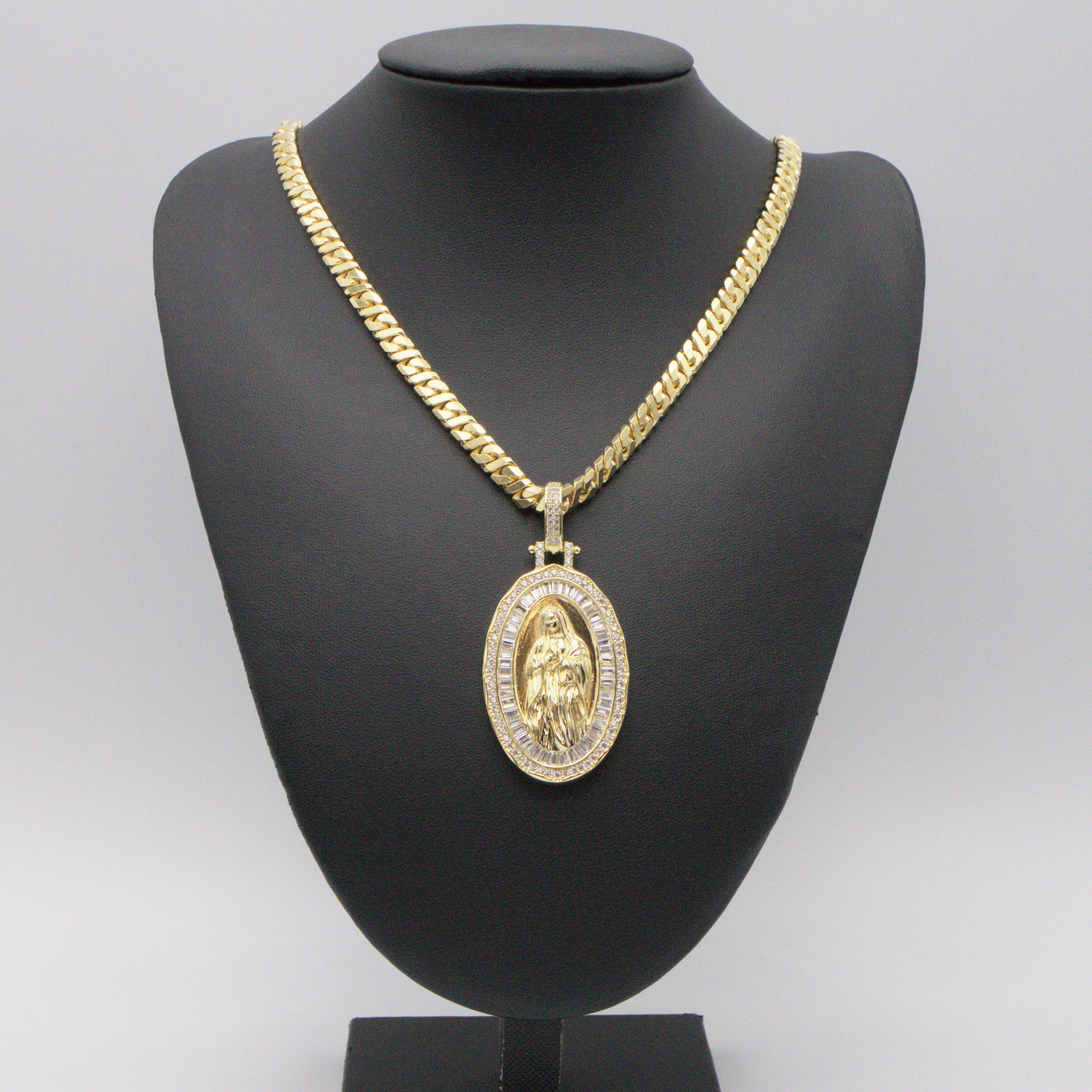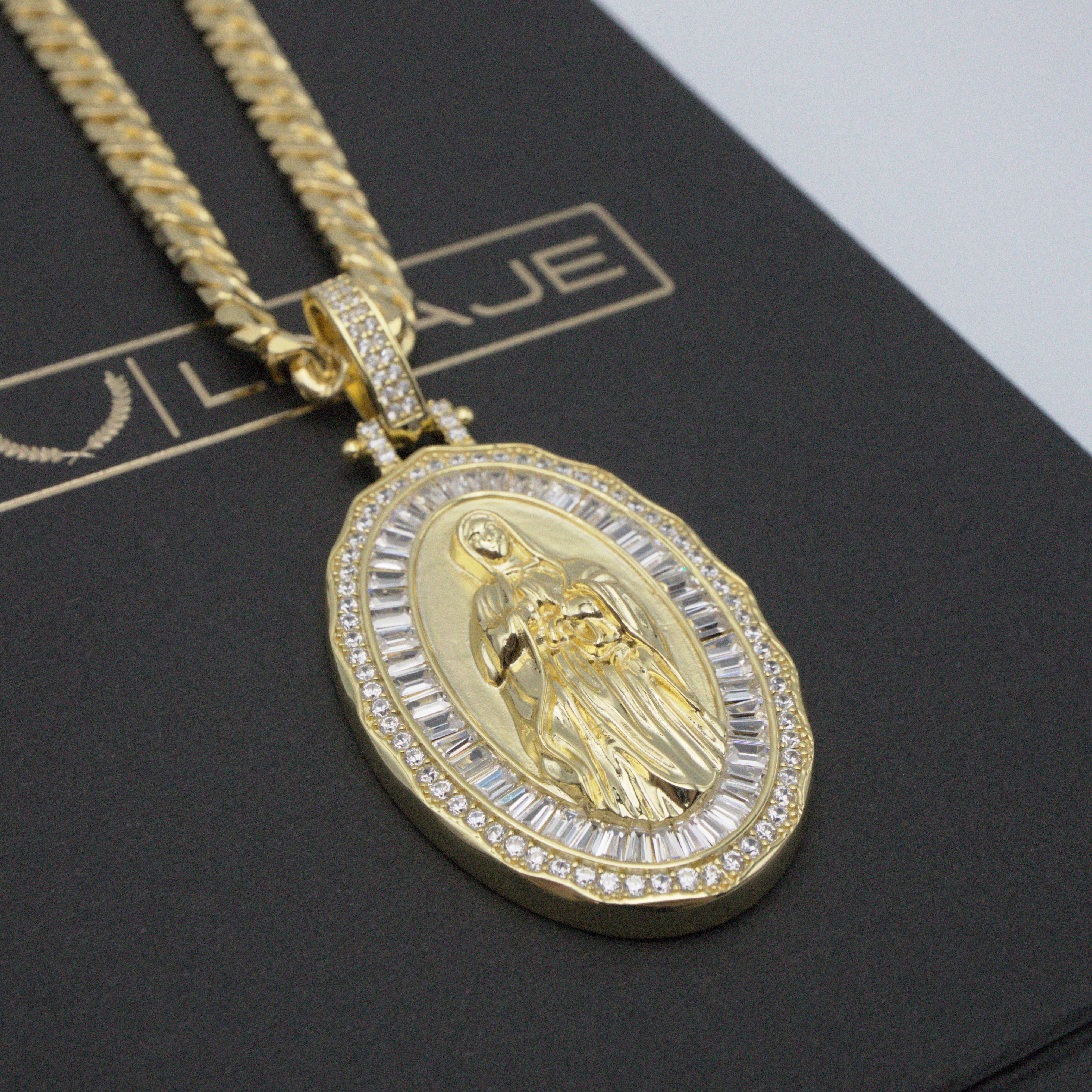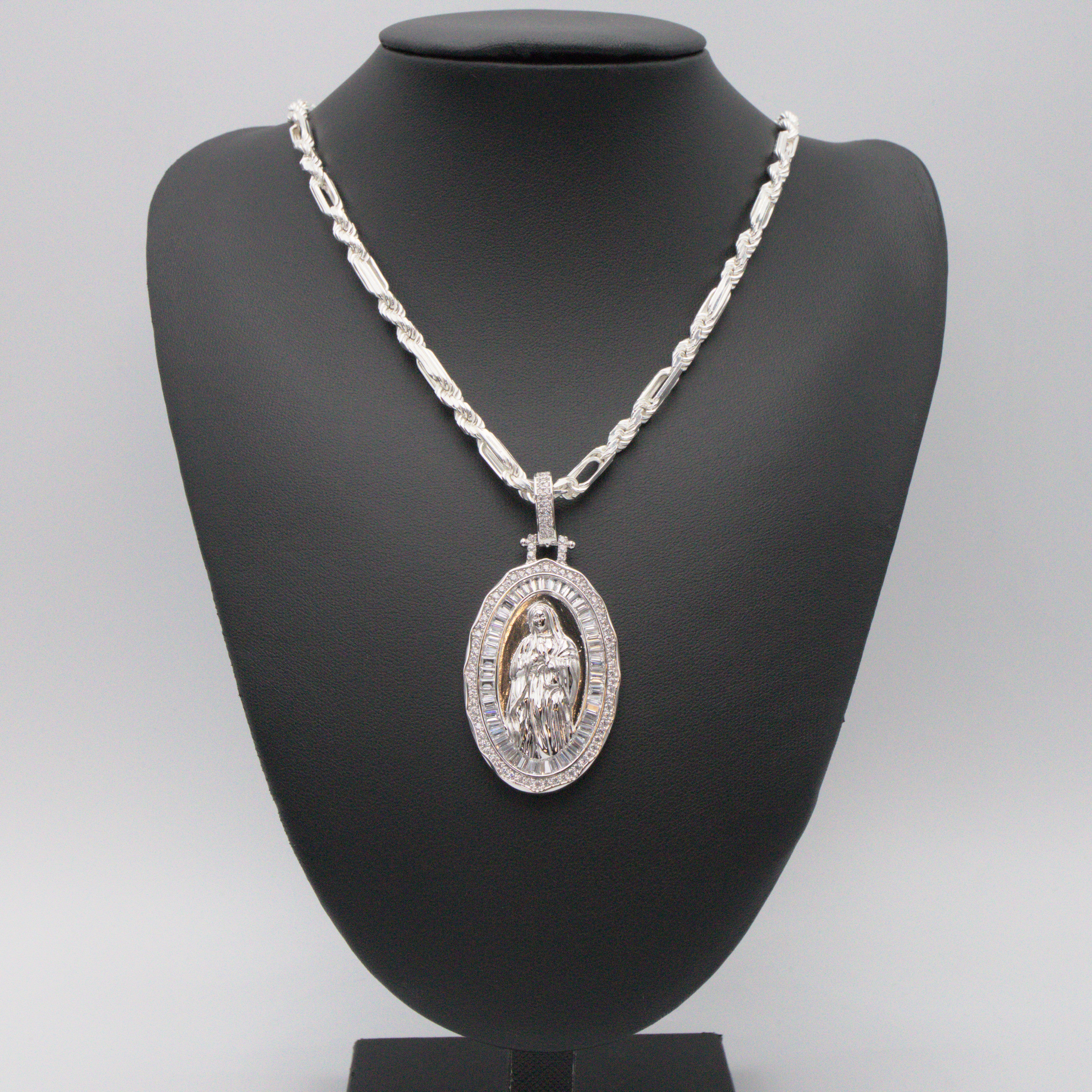 Our Silver Virgencita Pendant – a divine symbol of grace and protection. Meticulously crafted from sterling silver, this pendant features the revered Virgen Mary, adorned with a stunning combination of baguette and round cubic zirconias. Made from 925 Silver.